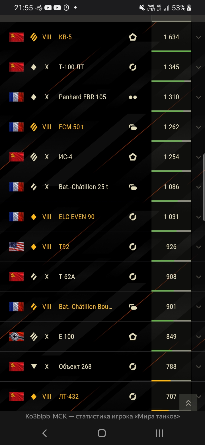 Что бы немного разбавить поток тем от нейросетиуважаемых форумчан с 1м сообщением на форуме,задам и свой вопрос.К игре и форуму он относится...не совсем напрямую.Зайдя в профиль,вижу такую картинку,это моя статистика,танки с самым большим количеством боёв.Вот чужой аккаунт,статку я спёр.Вопрос такой...в топе танки подсвечены зелёным,остальные жёлтые...но количество позиций,разное.Интересно,почему?