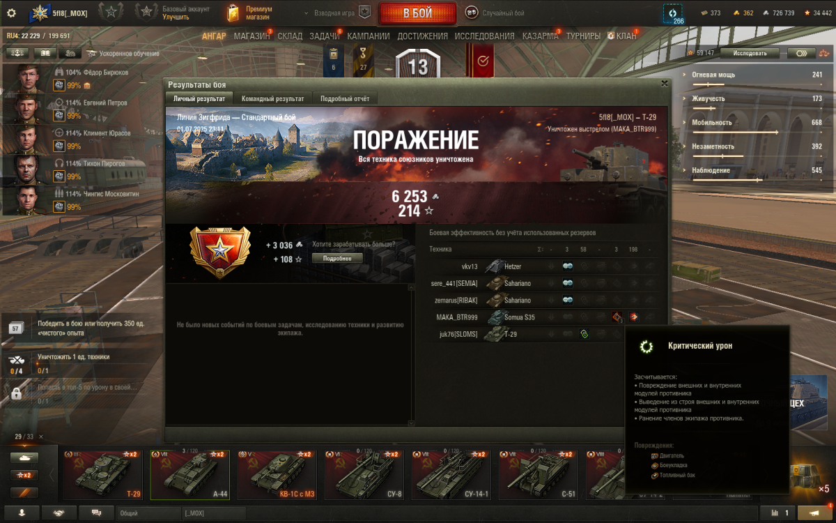 Поражение в бою 15-2.Скрин с уроном который я нанёс противнику.У него оставалось несколько единиц хп и я мог его спокойно добить,но-у меня проскочил рикошет! А мы уже проигрывали 7-1.И да,с такими повреждениями(на скрине) танку не сделалось ничего,в конце боя он живой.Внимание вопрос-а есть ли вообще смысл упираться в этой постановочной игре? Если он с такими повреждениями остался цел а мы проиграли 15-2.И это далеко не единичный случай,когда ты с повреждением хотя бы одного из этих модулей погибаешь сразу а тут ему с 3мя! ничего не сделалось.И в конце каждого боя возникает вопрос-ЛЕСТА ВЫ ВО ЧТО ИГРУ ПРЕВРАТИЛИ?!!!!!!!!!!!!