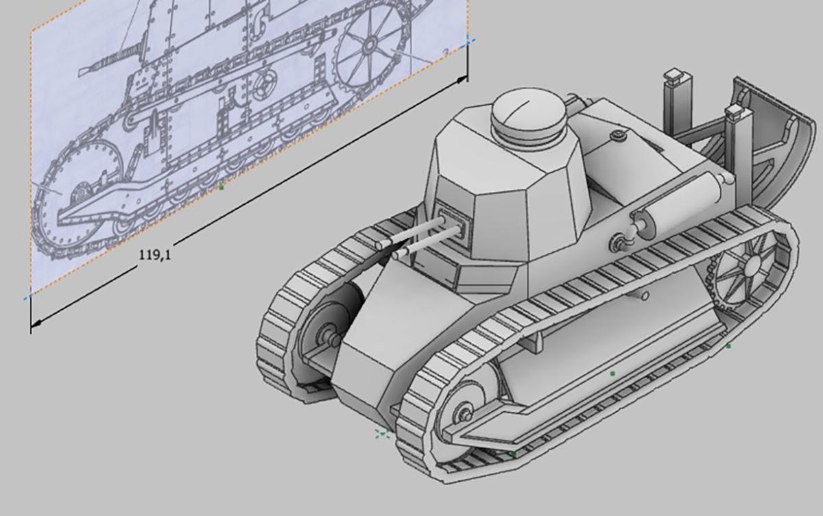 Поделка на тему итальянского танка Fiat3000. Товарищ попросил. Он коллекцирнирует модели в масштабе 1/37 и в танки играл раньше. Моделировал в программе Fusion360, когда она еще работала у меня, года полтора назад. С детализацией особо не парился, все равно мой принтер мелочи нормально не пропечатает. Файлы для печати сохраняю всегда и скрины кое-какие. Сделал вариант2. Пластик PETG. Стволы и трубы глушителей из стекольных гвоздей, печатал глушители несколько раз, трубы отламывались вместе с поддержками. Забил на это дело и согнул из гвоздей, покрасил черным маркером. Вот.