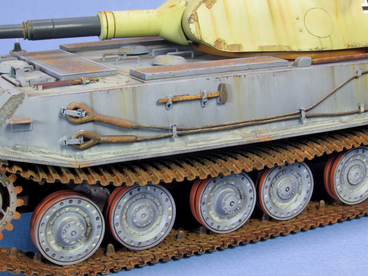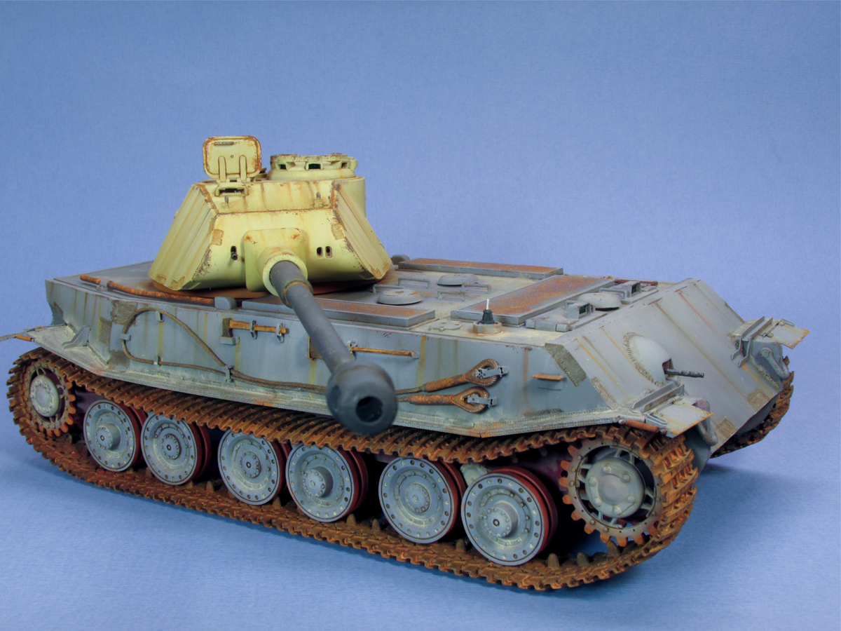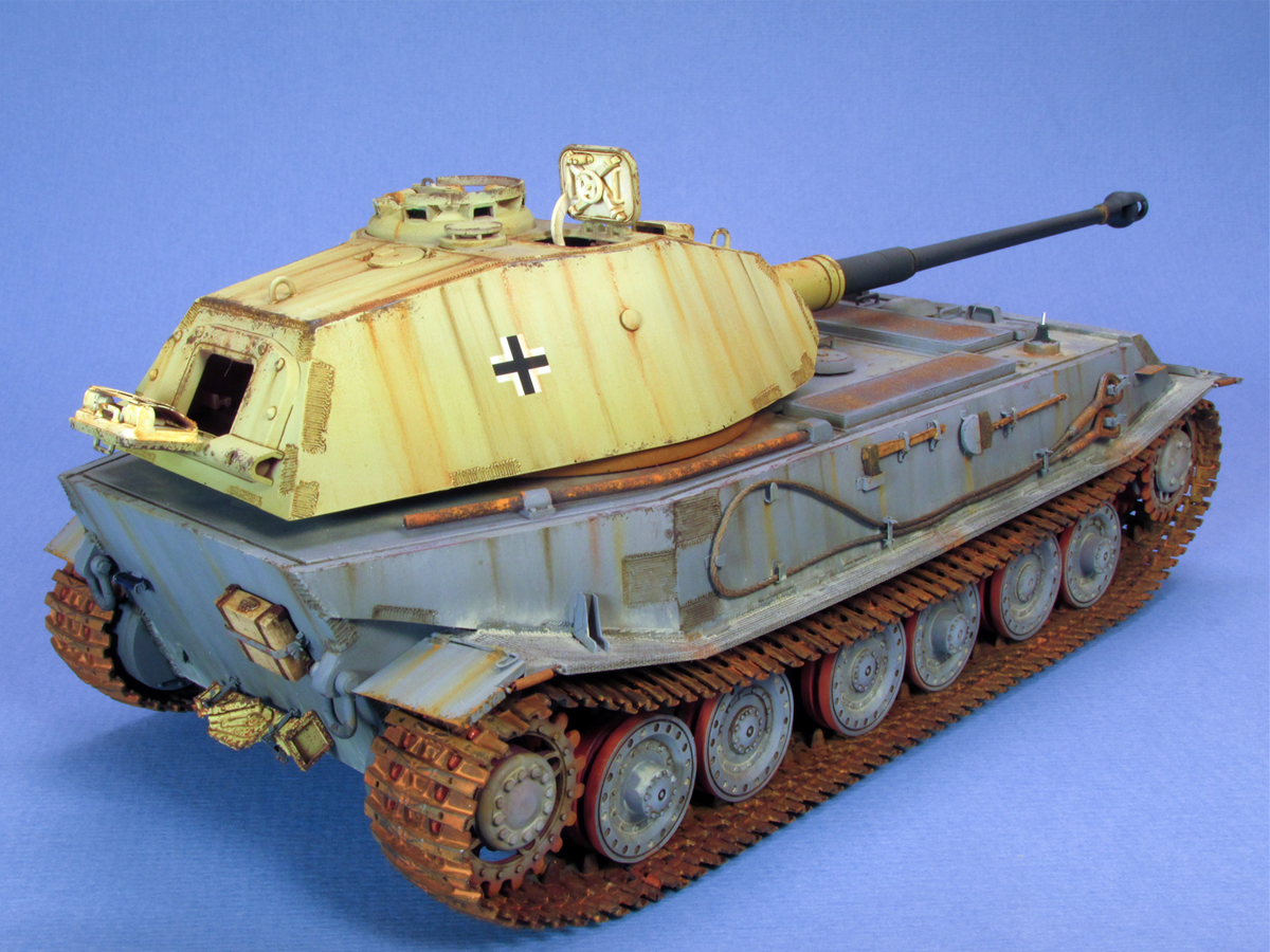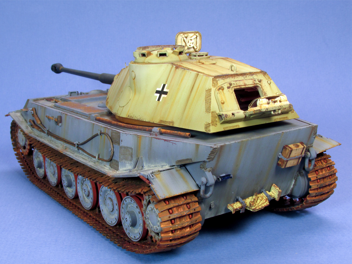 Доброго дня. После долгого перерыва, позвольте представить свою крайнюю работу. Заранее прошу прощения за не самые качественные фото, моя внутренняя жаба всё не как не хочет раскошелиться на зеркалку. Сперва о наборе. Просто не кому не рекомендую. Лично я взял модель по не знаю и не опытности, сейчас бы даже за пол цены её не стал брать. Если так охота Тапка то лучше поищите Драгон. Логика производителя лично мне вообще не понятно. Они дают полный интерьер башни и ужаснейшую деталировку корпуса. Корпус и деталировка на столько упрощены, что изкоробочный вариант подойдёт только для модели показанной на стадии сборки, когда не установлено всё навесное. Хорошо по доступной цене удалось взять фототравление. Так же дополнил модель сварными швами, вентиляционными колпаками и орудием от Менговского КТ. По окрасу. Хотелось изобразить машину которая несколько лет простояла у заводской стенки. Т.к. машина не была принята на вооружение её как Тигр P не отправили на фронт а просто оставили на территории завода. Окрас сделал двухцветный т.к. башня и корпус собирались на разных заводах и корпус ещё в старом стиле окрасили в серый а после полной сборки перекрашивать не стали. Красил Тамией и мастер акрил. Химия от АК, модель лаб. и Вайлдер. В будущем есть планы прикупить бокс нужного размера и сделать, что то наподобие виньетки. Модель без фар, т.к. те, что в наборе вообще не годятся а отдавать 400р. за смолу дороговата да и найти её не так уж и просто. Возможно, когда прикуплю обвес на Т-4 от Тамии то поставлю. Материалы: 82445 HobbyBoss 1/35 German VK4502 (P) Voyager Model PE35427 WWII German KINGTIGER VK.45.02(P)
