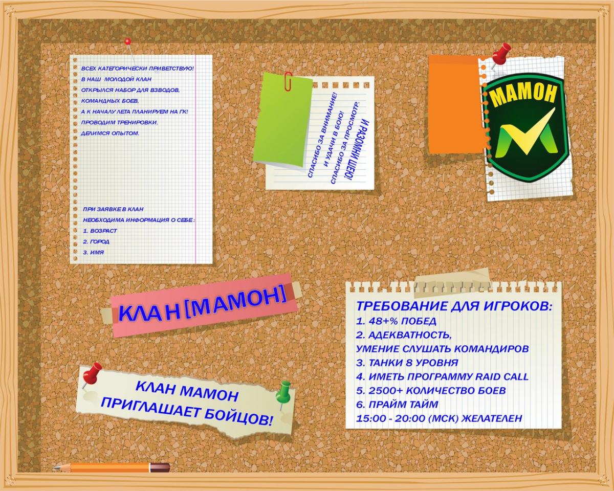 Одному играть весело, а в команде еще интереснее! В клане ты будешь знать, что в случае чего - тебя есть кому прикрыть! Ведь именно слаженная работа команды определяет успешность боя! http://cs608725.vk.me/v608725941/2261/u7wlhifeg3w.jpg Клан МАМОН приглашает бойцов! Всех приветствую! В наш клан открылся набор для взводов, командных боев! Проводим тренировки. Делимся опытом. Требование для игроков: 1. 48+% побед 2. Адекватность, умение слушать командиров 3. 8 уровень танков обязателен 4. Иметь программу Raid Call 5. 2500+ количество боев 6. Прайм тайм 14:00 - 21:00 (МСК) желателен (Мы из Сибири! Красноярский край.) При заявке в клан необходима информация о себе: 1. Возраст 2. Город 3. Имя Внутри клана проводим розыгрыш золота. Пусть и не много, но приятно! Верные соратники, рост личного уровня игры. Прокачка новых навыков и развитие лидерских качеств! Объединяйся ради великих побед! Спасибо за внимание! И Удачи на полях сражения!