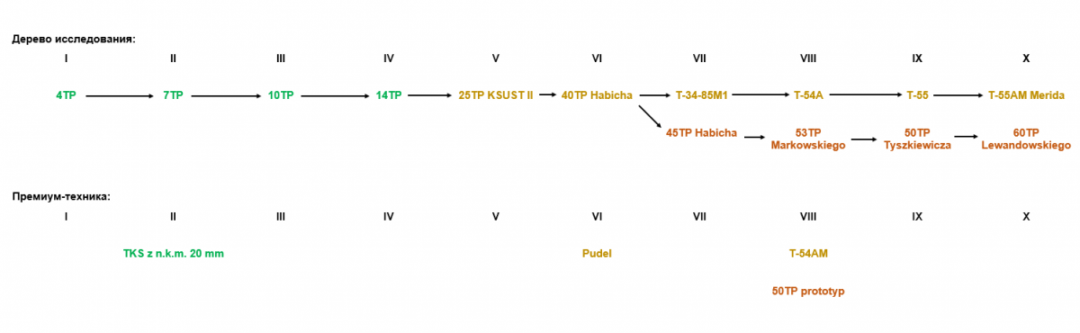 Всем добрый день! Сегодня я хотел бы выдвинуть идею введения в игру ветки высокоуровневых средних танков Польши. Все машины, представленные в ветке, являются польской модернизацией советских танков, либо же танками, которые выпускались в Польше по советской лицензии. Ветка начинается с VII уровня. С танка 40TP Habicha будет разветвление на ветку ТТ и новую ветку СТ. Также у ветки будет премиум-танк VIII уровня. ТТХ некоторых танков ещё не до конца известны. ВНИМАНИЕ: сразу хочу отметить, что всё это мои фантазии и идеи, я знаю, что многим ветка может не понравиться, но это всего лишь моя мысль, и она имеет право на существование. Дерево развития будет выглядеть примерно так: http://cdn-frm-eu.wargaming.net/wot/ru/uploads/monthly_07_2019/post-77961074-0-13377900-1563605929_thumb.png VII уровень - Т-34-85М1 http://cdn-frm-eu.wargaming.net/wot/ru/uploads/monthly_07_2019/post-77961074-0-85803000-1563605955_thumb.jpg Тот же Т-34-85, но с внесёнными со стороны Польши изменениями, поскольку Польша могла создавать танки этой модели. Из экипажа убрали радиста, а управляемый им курсовой пулемёт перешёл к водителю. Также поляки слегка улучшили двигатель, установили прибор ночного видения для водителя, увеличили скорость вращения башни и увеличили радиус действия до 650 км, а также заменили радиостанцию. ТТХ: Масса: 32,2 т Вооружение: 85мм пушка Броня корпуса: 45/45/40 мм Броня башни: 90/75/52 мм Мощность двигателя: 500 л.с. Удельная мощность: 15,5 л.с. на т Макс. скорость: 55 км/ч Членов экипажа: 4 VIII уровень - Т-54А http://cdn-frm-eu.wargaming.net/wot/ru/uploads/monthly_07_2019/post-77961074-0-42790200-1563605986_thumb.jpg Производство танков Т-54А осуществлялось по советской лицензии в Польше, где они выпускались заводом "Bumbar-Labedy" в городе Гливице с 1956 до конца 1963 года. Характерными внешними отличиями этих машин были L-образные топливные баки на надгусеничных полках и ящик ЗИП на борту башни. ТТХ: Масса: 36,4 т Вооружение: 100мм пушка Броня корпуса: 100/80/45 мм Броня башни: 200/160/65 мм Мощность двигателя: 520 л.с. Удельная мощность: 14,4 л.с. на т Макс. скорость: 50 км/ч Членов экипажа: 4 IX уровень - Т-55 http://cdn-frm-eu.wargaming.net/wot/ru/uploads/monthly_07_2019/post-77961074-0-94700900-1563606003_thumb.jpg http://cdn-frm-eu.wargaming.net/wot/ru/uploads/monthly_07_2019/post-77961074-0-18778400-1563606024_thumb.jpg Танк Т-55 производился в Польше по советской лицензии на заводе "Bumbar-Labedy" в городе Гливице с 1964 года. Некоторые экземпляры были дополнительно вооружены советскими противотанковыми управляемыми ракетами "Шмель". ТТХ: Масса: 36,0 т Вооружение: 100мм пушка Броня корпуса: 100/80/45 мм Броня башни: 200/160/65 мм Мощность двигателя: 580 л.с. Удельная мощность: 16,1 л.с. на т Макс. скорость: 50 км/ч Членов экипажа: 4 X уровень - Т-55АМ Merida http://cdn-frm-eu.wargaming.net/wot/ru/uploads/monthly_07_2019/post-77961074-0-87403700-1563606064_thumb.jpg http://cdn-frm-eu.wargaming.net/wot/ru/uploads/monthly_07_2019/post-77961074-0-60502100-1563606134_thumb.jpg В середине 1980-х годов в Польше начали глубокую модернизацию своих танков. Она велась с использованием советской документации, но с некоторыми «местными вариациями». Танки Т-55АМ получили дополнительную накладную броню на лобовые части башни и корпуса, а также на днище. На них установили бортовые экраны, вертикальные стальные листы для прикрытия внешних топливных баков; использовали и гусеницу РМШ. Улучшили термоакустическую изоляцию боевого отделения, поставили рентгенометр OPS-68M1, а для обеззараживания танка — оборудование ZOD-2. На каждом борту башни разместили по восемь пусковых установок для дымовых гранат (WWGD-1 «ЕгЬ» или WPD-1 «Tellur». Особенность польского Т-55АМ — специально разработанная система управления огнем «Merida»