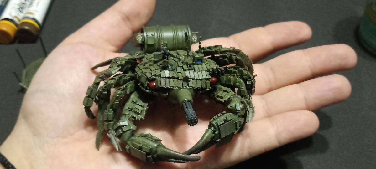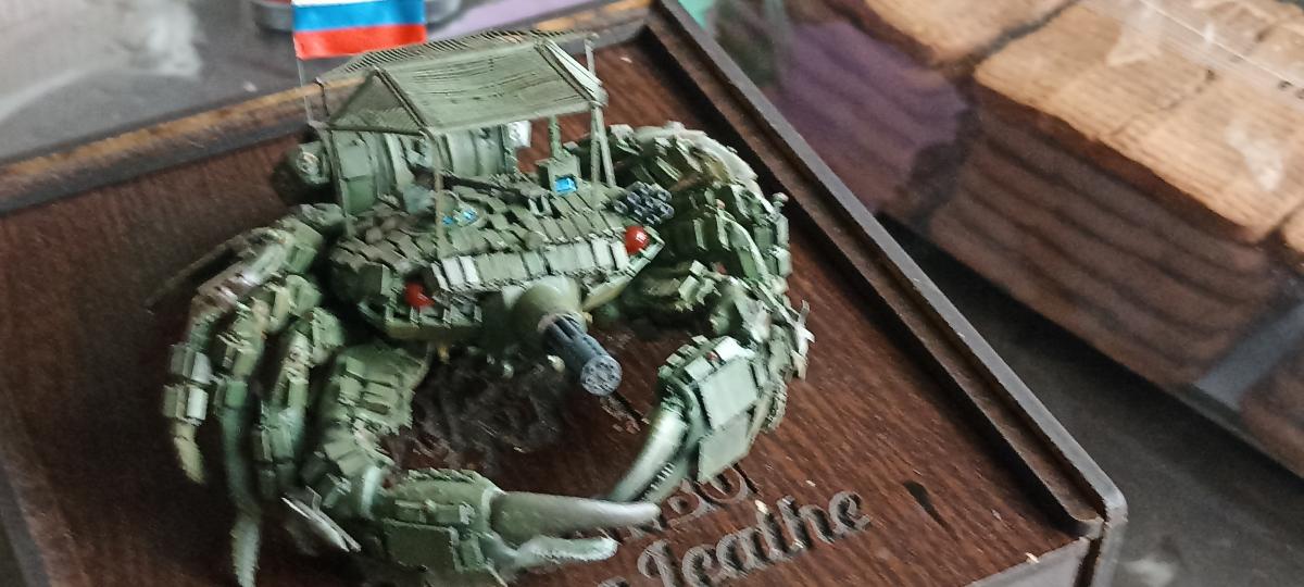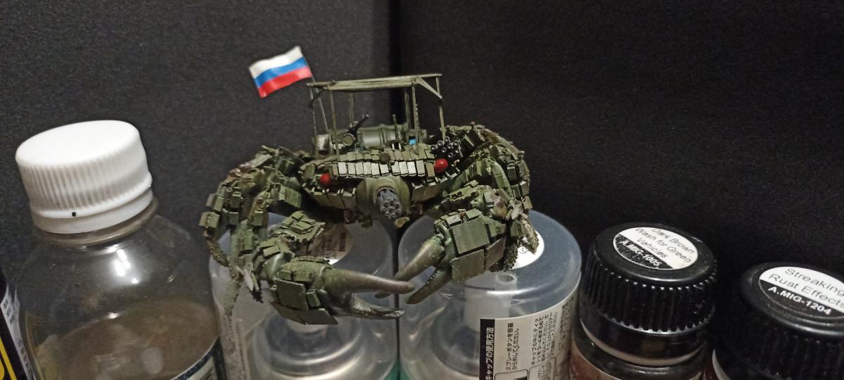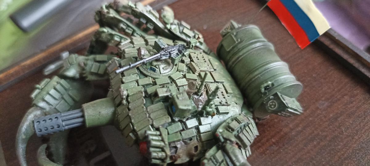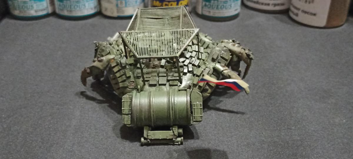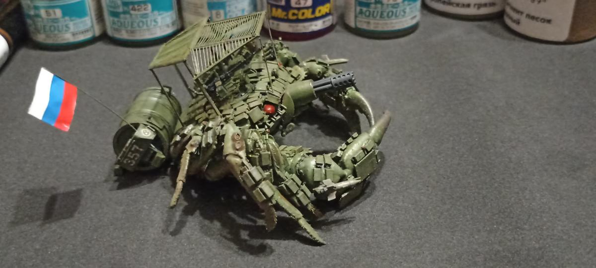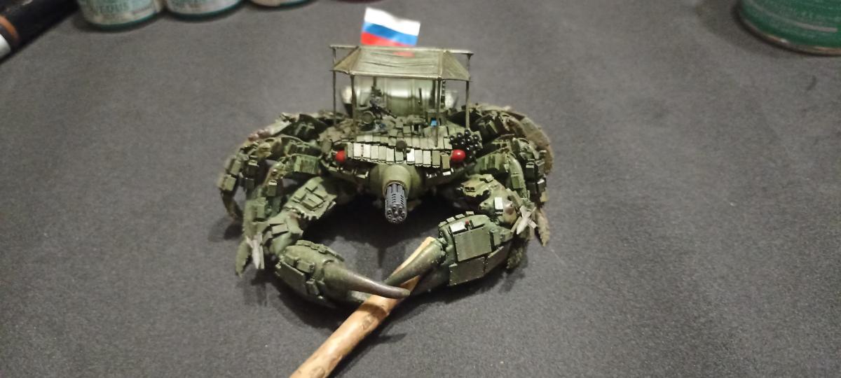 Волею случая попал мне в руки высушенный черноморский краб - популярный сувенир. Усеивавшие его панцирь ракушки балянусов напомнили мне точки крепления. И понеслось... У нас был 1 краб, 3 листа остатков травла, 75 донорских деталей, 5 пакетов дополнений в 72 и 48, полбанки пигментов и гора шпатлёвки, акрила, напильников, запчастей и всего такого, всех цветов и масштабов, а ещё литр суперклея, литр грунта, коробок кошачьих усов, пол-килограмма "Контакта" и две дюжины иголок от шприцов. Не то чтобы это всё было нужно для сборки, но раз начал делать фантастику, то иди в своём увлечении до конца. Единственное, что меня беспокоило — это "Контакт". В мире нет никого более беспомощного, безответственного и безнравственного, чем человек, ищущий, что бы ещё обвесить динамической защитой. И я знал, что довольно скоро мы в это окунёмся. В качестве "главного калибра" было выбрано орудие GAU-8 в 1/48 от "Э.В.М" (как и многие другие, смотревшие в детстве хоть один фильм со Шварценеггером, питаю особое отношение к оружию с вращающимся блоком стволов. Никто не сделал для фетишизации схемы Гатлинга столько, сколько добрый дедушка Кэмерон). Пересчëт из 1/48 в 1/72 дал калибр 45 мм, хорошо знакомый отечественной артиллерии.Донорами деталей также стали звездовские Т-72Б3 и Ми-24 в 1/72, Е-100 в том же 72 от Modelcollect и звездовский Т-90 в 1/35.А дальше в дело пошли продукты SG modelling. Были добавлены:— блоки ДЗ "Контакт-1" 1/72 - 2 набора,— габаритные огни ГСТ-64 1/72 - 1 набор,— "Тучи" 1/72 - 1 набор,— Решëтка на башню 1/72 - 1 шт.,— ПТУР "Малютка" 1/72 - 1 набор, — Декаль флага - 1 шт., — Кошачий ус в качестве флагштока. Окраска - акрилы Mr.Hobby и различные жидкости от AK и MIG.Благодарю за внимание!