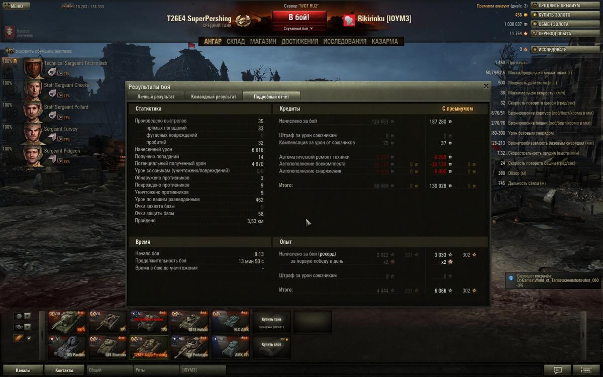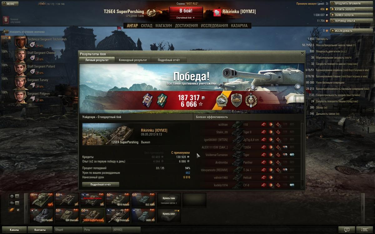 Победа! Бой: Уайдпарк 9 мая 2013 г. 9:13:10 Танк: T26E4 SuperPershing Получено опыта: 6 066 (x2 за первую победу в день) Получено кредитов: 187 317 (компенсация за ущерб от союзников: 37) Достижения в бою: Медаль Рэдли-Уолтерса, «Стальная cтена», «Воин», «Бронебойщик», «Стрелок» http://cdn-frm-eu.wargaming.net/wot/ru/uploads/monthly_05_2013/post-254868-0-74478600-1368070298_thumb.jpg http://cdn-frm-eu.wargaming.net/wot/ru/uploads/monthly_05_2013/post-254868-0-80289500-1368070304_thumb.jpg http://cdn-frm-eu.wargaming.net/wot/ru/uploads/monthly_05_2013/post-254868-0-15735700-1368070311_thumb.jpg http://wotreplays.ru...4_superpershing После боя была вот такая морда http://cdn-frm-eu.wargaming.net/wot/ru/uploads/monthly_02_2013/post-254868-0-73505100-1361717847_thumb.jpeg