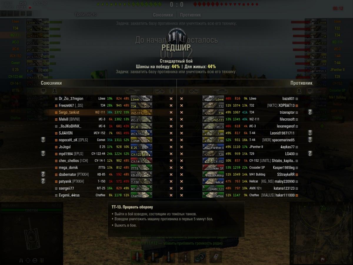У меня тут шапочка из фольги прохудилась, и в голову проникло нечто. По сегодняшней игре складывается впечатление, что меня внесли в список "угнетаемых". Как известно, не льготные танки, и не угнетаемые ЛТ попадают в три типа боев. "Топ", или верх списка (0+2 уровни), "дно" - низ списка (-2-0), и золотая середина (+1-1). Если все нормально, то в среднем танк примерно по одной трети боев проводит в каждом типе боев. Так вот, сегодня я почти 2/3 боев провожу с уровнями 0+2, т.е. на дне, и около 1/3 боев в серединке. В топе очень редко. Что это, шутки балансера, ВБР, или заговор против меня и Франции некий программный код, подправляющий то, что у меня подрос процент побед, мне по барабану. Факт только то, что мне не комфортно сегодня играется. Ну а чтобы моя попоболь и возгорание стула были еще побольше, еще и такое происходит: http://cdn-frm-eu.wargaming.net/wot/ru/uploads/monthly_03_2015/post-878055-0-61350000-1426281695_thumb.jpg Может балансер и не нарушил +-10% балансный вес танков, но извините, мне кажется это не честный баланс. А ведь чтобы исправить то ничего сложного ж не было. Нашего Е25 можно было обменять на любую не взводную восьмерку от противников. Неужели так сложно прописать балансеру такие дошлифовки сетапов? Не, ну понятно, потребуется 4 года и миллиард долларов на разработку. Ну хоть начните. Как говорят, раньше сядешь, раньше выйдешь.