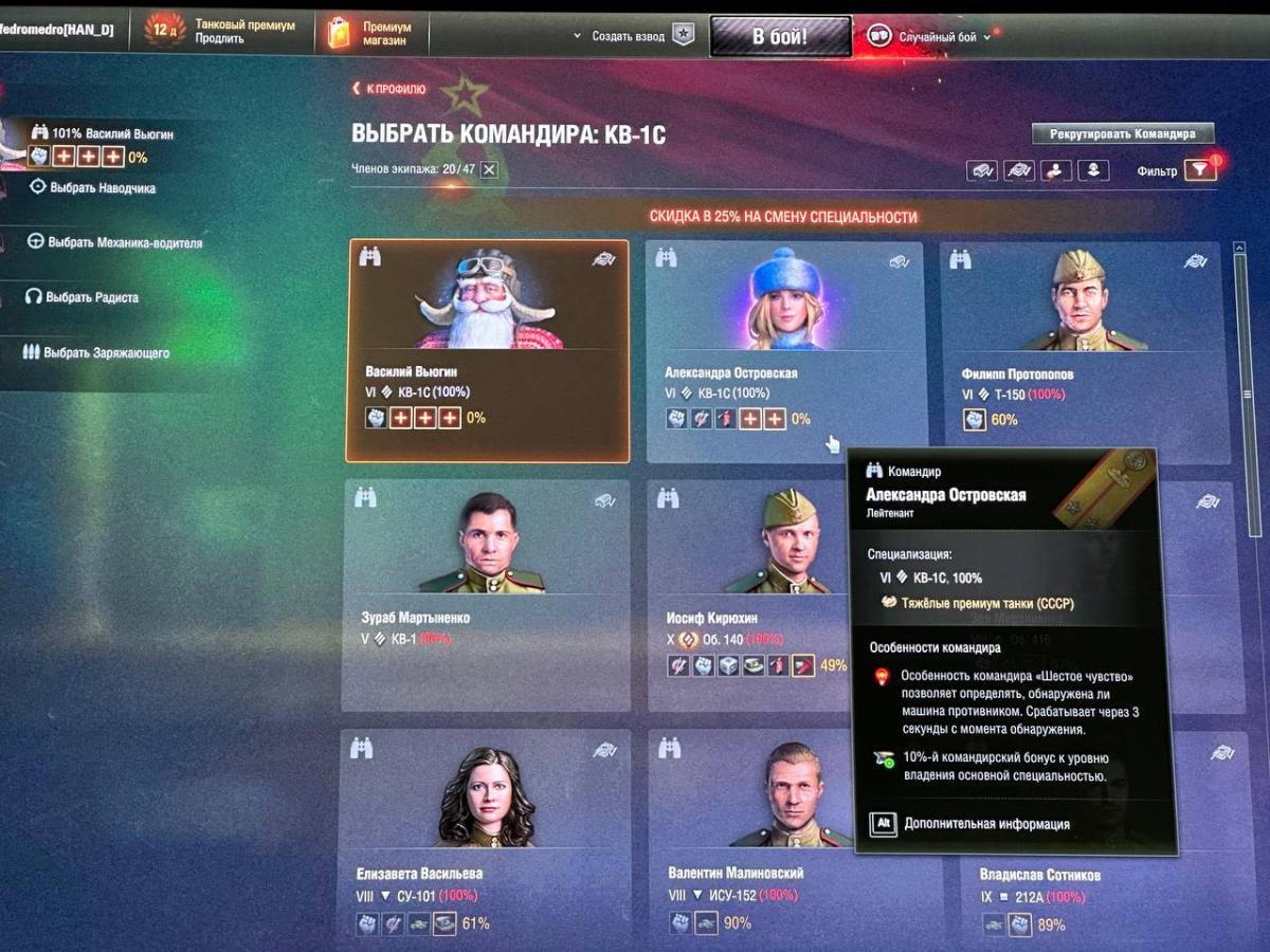 Купил танк, выбрал командиром Деда мороза (Вьюгина)(был в казарме несколько лет), после чего забыл переключиться на следующего члена экипажа и выбрал Снегурку с кучей плюсов, подтвердил и она тоже стала капитаном этого танка, вместо Вьюгина, который ушел в казарму, будучи уже обученным командиром на этот танк. Поставил его обратно, Снегурка с такими же характеристиками ушла в казарму и больше не отображается нигде кроме казармы. Хочу поставить её наводчицей, сделав нужный фильтр в поиске - но она не отображается. Ставлю её командиром и пытаюсь поставить наводчиком Вьюгина - он тоже не отображается. Напрямую переобучить на другую специальность в профиле персонажа - игра не даёт, нет ведь такой возможности (что довольно странно, ведь можно переобучить на другой танк) ПОДСКАЖИТЕ!!! Что мне делать и как мне быть? По факту я просто профукал очень крутого члена экипажа и в данный момент могу поставить её командиров на другой танк, но на этот уже не могу. Как быть, как исправить ситуацию?