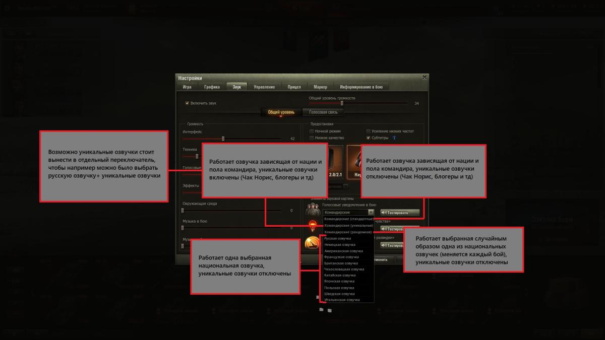 В общем, предложение максимально простое: дать игрокам возможность выбирать озвучку для экипажа. Со временем, может, надоесть уникальная озвучка командира, а отключить её в данный момент нельзя без модов, или, наоборот, кому-то очень нравится японская озвучка, и игрок хочет на всех танках слышать именно японскую. Накидал небольшой концепт, как это могло бы выглядеть.