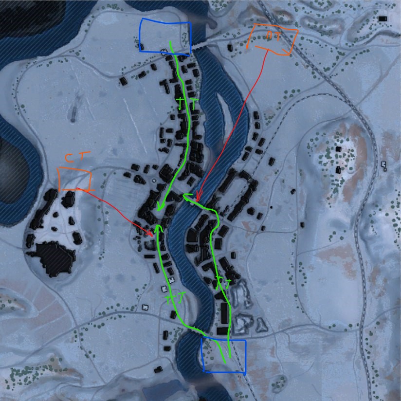 Считаю, что разработчикам стоит внести некоторые изменения в карту Эрленберг. Проблема заключается в том, что разъезд для ТТ с нижнего и верхнего репса крайне неравноценен. На рисунке, я показал типичный разъезд ТТ. С верхнего репса, обычно большинство ТТ двигаются сквозняком через город, не встречая при этом никакой опасности до места где обычно происходит противостояние. Но вот разъезд ТТ с нижнего респа, еще в самом начале, натыкается на фланговую атаку вражеских СТ, так ка они успевают занять позицию слева еще до въезда ТТ в город. Проезд через правую сторону с нижнего для ТТ респа так же сложен, для того что бы попасть к постоянно давящему противнику нужно ехать через мост, а он очень хорошо простреливается. Кстати быстрые ТТ с верхнего респа, успевают проехать почти весь город и встречать противника уже на его территории. Нужно что то менять в карте, так как лично я заметил, если ты попал на нижний респ слив практически обеспечен при равном скиле команд.