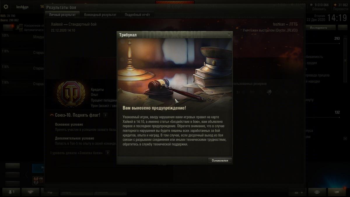 Хочу поделится своей обидой. С помощью двух гнусов меня забанили. С начало, два корефана во взводе (как я уже понял позже из реплея) мило любовались друг другом, потом один из них сбил мне гуслю (явно не нечайно), на что я ответил тем же, без снятия ХП. Корефаны обиделись и с меня слетели первые 400 урона. Ну и далее взаимность. В итоге у меня минус 2 и клич от корефанов "баним Леву". Ну и мне влепили бан. Обидно !!!!!!!!!! Я что, не прав?