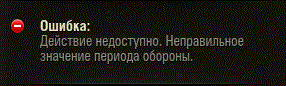 19.09.2016 00-30 При попытке атаковать клан выдалась ошибка "Ошибка: Действие недоступно. Неправильное значение периода обороны. " http://cdn-frm-eu.wargaming.net/wot/ru/uploads/monthly_09_2016/post-12779285-0-48956200-1474236455_thumb.gifhttp://cdn-frm-eu.wargaming.net/wot/ru/uploads/monthly_09_2016/post-12779285-0-95341500-1474236473_thumb.png Что это это значит ? Проблема на серверной стороне или настройки укрепа неверны?