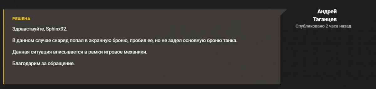 Таки добрый вечер. Собстно, сабж. В бою был на FV125(b) 183. Стрелял бронебойным снарядом. Как объясняется "броня не пробита" в корму шеридана? Исходное бп 310 мм. броня у шеридана в корпусе сзади - 12мм. Угол вхождения виден на скриншоте. Угол небольшой, даже если там экран - я стрелял бб. У снаряда 300 мм б.п на 500 метрах. вычитая толщину экрана, пусть будет, условно, 50 мм (если там вообще есть экран) 300-50=250. 250>12 мм. пусть будет поправка на угол вхождения. По вашей формуле расчёта чтобы пробить шеридана в корму нужно чуть больше 12 мм. Возьмём самое минимальное б.п на 500 метров. 300 - (300*0.25)=225 мм. Что с лихвой хватает на пробитие шеридана. Обращался в ЦПП, ответ в приложении. Ссылка на реплей (тайминг 11:30) - http://wotreplays.ru/site/12728932#kareliya-sphinx92-fv215b_183. Что значит "снаряд пробил экран, но не смог пробить основную броню"? Можно скриншоты коллижн модели предоставить, где написано, что экран там хотя бы 150+ мм толщиной.