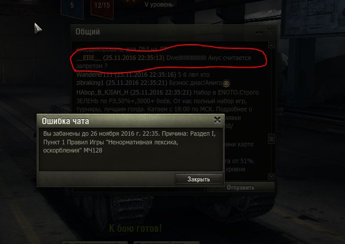 Приветствую, танкисты) Сегодня получил ошибочный бан от модератора чата. Открыл общий чат, чтобы посмотреть, кто играет взводом в Натиск, сразу увидел сообщение от игрока с ником ***, он там со всеми поздоровался. Модератор, не обратив внимания, что ник нарушающий тепло поприветствовал его в ответ. Хм...Набрали по объявлению? Дабы направить модератора на путь истинный указал, что ник идет по статье 1.18, в итоге он коряво скопировал и отправил в бан не его ник, а мой) Забавно и прискорбно...И без зазрения совести продолжил работать дальше. Я написал в ЦПП для разблокировки, но все же, как по мне - это малоприятно и непрофессионально со стороны модера. А вас ошибочно банили?
