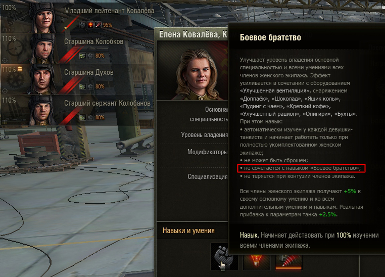 Знаю , что эту тему уже не раз подымали , но тем не менее или даже тем более . Ну коль допускаются смешанные экипажи , так сделайте уже навык бб и боевые подруги совместимым . Думаю , что это только добавит комфорта в игре . Уверен у многих в казарме парятся танкистки и не знают в какой же экипаж их пристроить , здесь еще и шведки добавились .