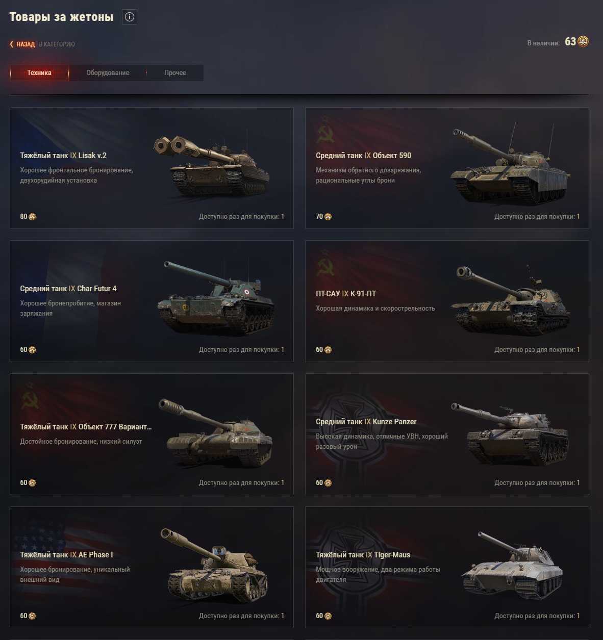 Сколько можно взять танков за жетоны здесь и сейчас? У меня 21 жетон. Могу ли я взять фазу и шарика сейчас вместе? Или даст забрать только один танчик? Там написано "доступно 1 раз для покупки". Или тогда лучше взять лорейн и оборудку чтоб вложить больше жетонов? Кто нибудь брал два танка за жетоны сразу единовременно?