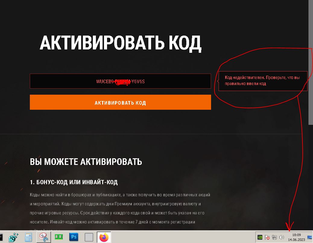 Собственно решил поучаствовать в акции, купил бургер, сделал всё по инструкции. Код от Бургер кинга пришел. Ввожу его на сайте WG, жму "Активировать", всплывает "Спасибо. Код Wargaming активирован", но на аккаунт ничего не зачислилось. Сегодня решил попробовать ещё раз, может что не так делал, но всё абсолютно так же. Код вбивается, окошко "Спасибо. Код Wargaming активирован" выскакивает, ничего не зачисляется. Чеки есть, всю необходимую инфу могу предоставить. Перед созданием темы всё проверил: према нет, голды нет, резервы в том же количестве, танков не прибавилось.