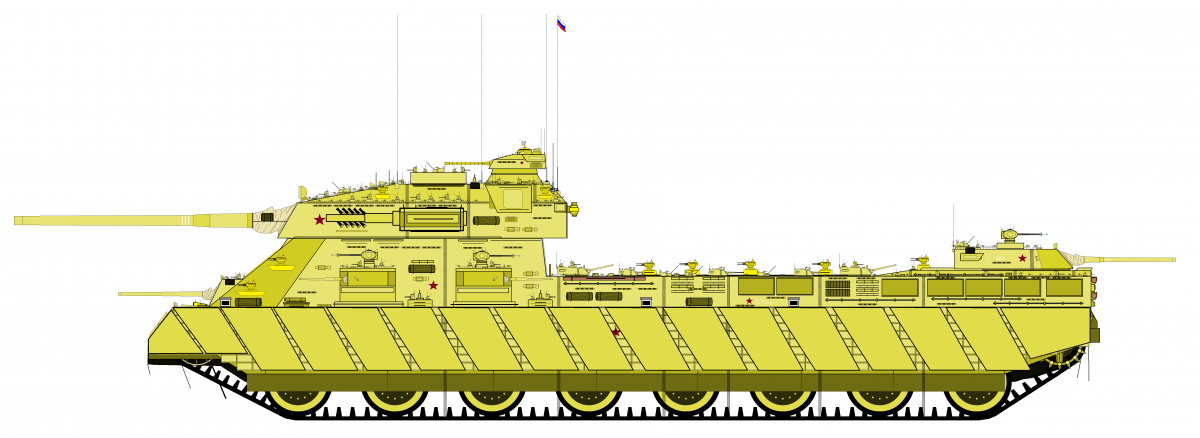 Штурмовой танк Т-200 был первым моим проектом, поэтому ошибки были неизбежны, в последнее время проект доводился "до ума", устранить некоторые недостатки не удалось. Танк вооружён 227-мм орудием с автоматом заряжания - под стать "штурмовому" танку. В дальнейшем Т-200 неоднократно модернизировался: модификация Т-200Б получила бортовые резинотканевые противокумулятивные экраны; Т-200БВ - установлена навесная динамическая защита; Т-200УМ - навесная ДЗ заменена встроенной; Т-200МС-1А - добавлены КАЗ, КОЭП, решётчатые противокумулятивные экраны. Броня машины - комбинированная. В дальнейшем на базе Т-200 спроектирована тяжёлая САУ с мощной дальнобойной пушкой. Проект "сухопутного линкора" Т-1000 создан не без влияния германского "сухопутного крейсера" времён 2-ой МВ P1000 Ratte, но изначально имел гораздо более мощное вооружение и бронирование, за последние 5 лет проект претерпел много изменений, танк всё сильнее "обрастал" оружием. Неизменным остался только главный калибр машины. Также недавно Т-1000 получил "на вооружение" БПЛА. Броня, как и у Т-200 - комбинированная, бортовые экраны прикрыты навесной динамической защитой.