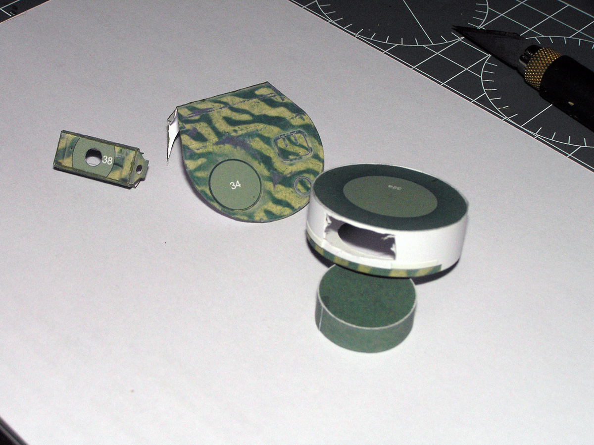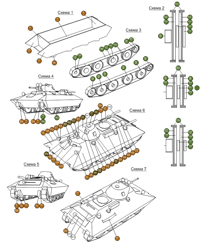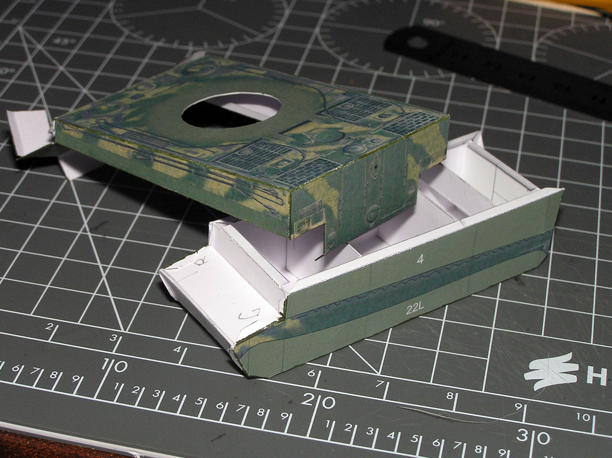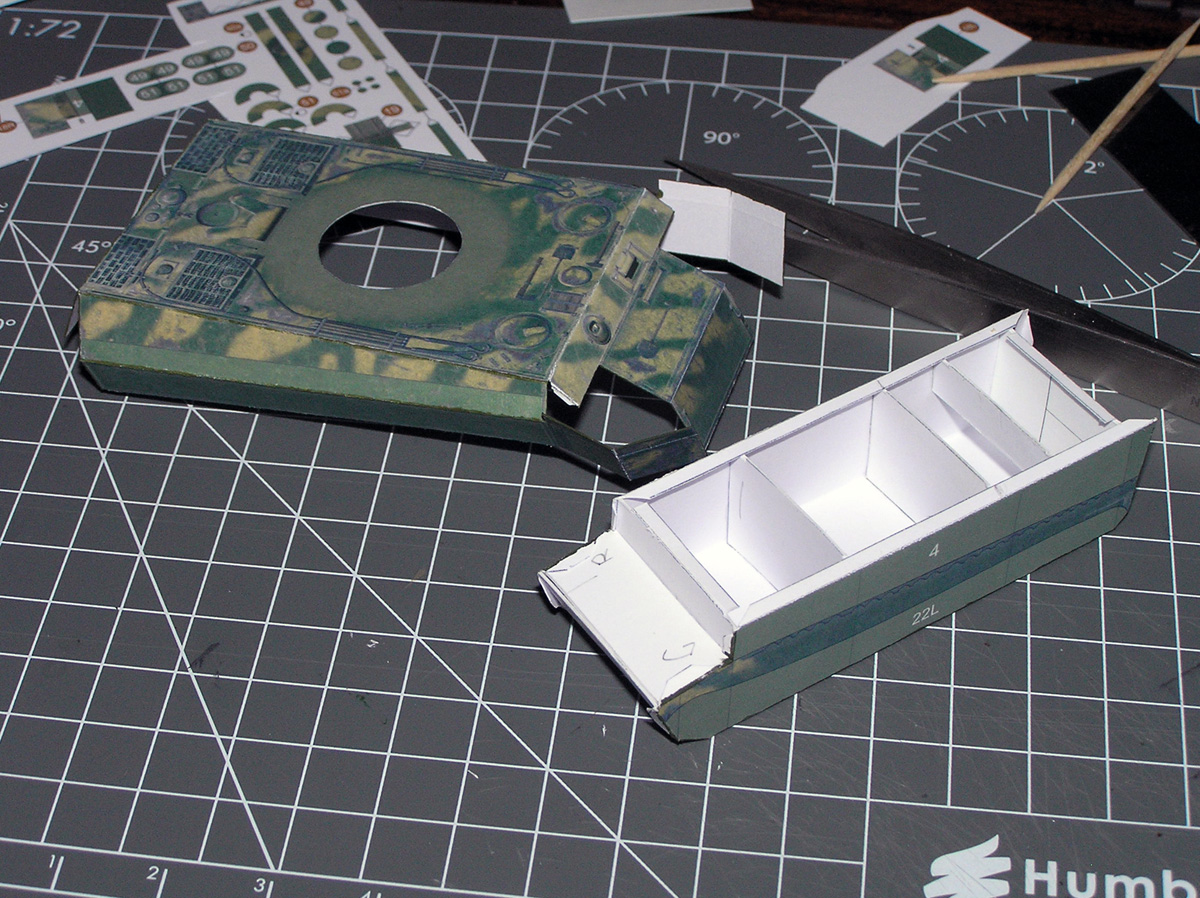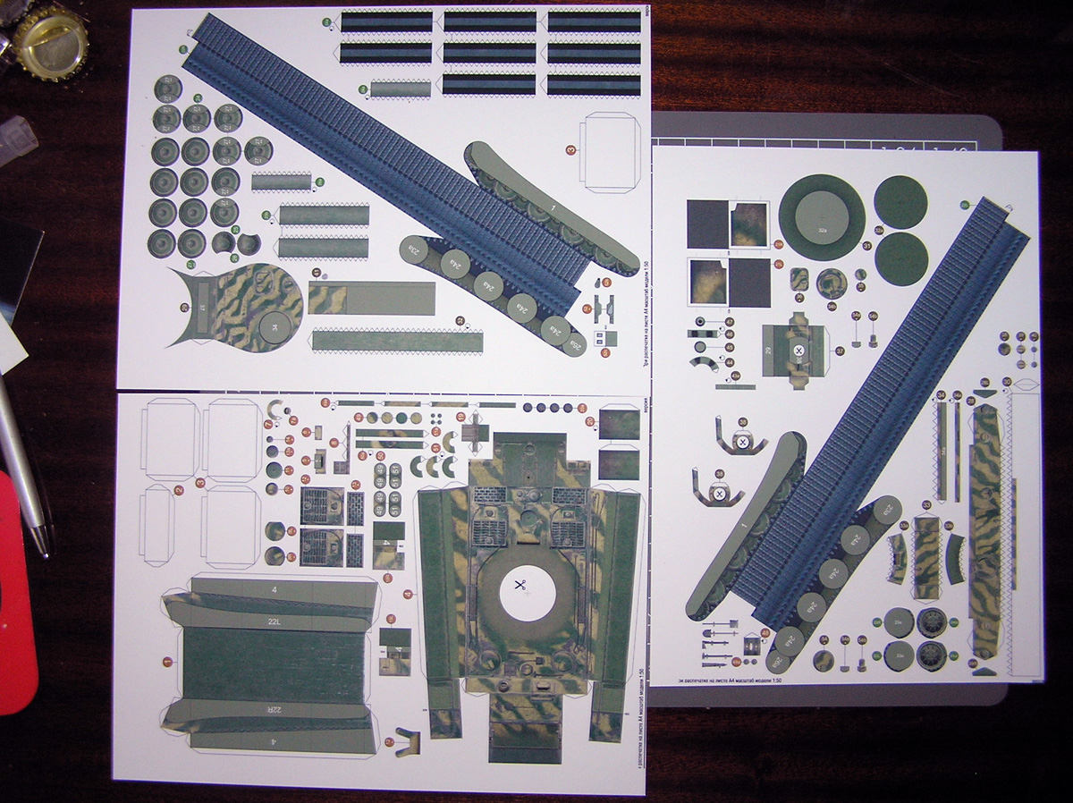 http://cdn-frm-eu.wargaming.net/wot/ru/uploads/monthly_07_2015/post-4861458-0-16391300-1437739120.jpg Всем привет! Очередная статья от наших тестеров. Собираем вместе модель «Бронекоробочка № 9. Pz.Kpfw.VI Tiger Ausf.H1 японский вариант» (автор Targo_Kain, стиль изложения сохранен). Рекомендуем перед началом сборки ознакомиться с статьей о инструментах и материалах для бумажного моделизма. Многие советы и приемы схожи с руководствами по сборке танка Т-54, ИС-2 и ПТ-САУ: Charioteer, но есть и некоторые интересные и полезные новые нюансы: 1 http://cdn-frm-eu.wargaming.net/wot/ru/uploads/monthly_07_2015/post-4861458-0-84325200-1437737225_thumb.jpg Ну что же, как обычно распечатать, вытащить инструменты и настроится получать удовольствие от сборки! Кстати о печати… эту модель печатал у фотопечатника на матовой фотобумаге 180 г/м. лист с тонкими деталями был напечатан на матовой фотобумаге 100 г/м – такую плотность посоветовал фотопечатник – мол если 80 г/м – уходит цвет из-за того что чернила «пробивают» бумагу насквозь. Вобщем-то он прав – берите на вооружение. 2 http://cdn-frm-eu.wargaming.net/wot/ru/uploads/monthly_07_2015/post-4861458-0-78257400-1437737226_thumb.jpg Ванна корпуса. Хотя в этой модели поперечных шпангоутов вполне достаточно, я всё равно вклеил дополнительный в МТО а также под ВЛД и НЛД. Про клей, который я применял в этот раз, распространяться здесь не буду, можно будет прочесть в конце статьи. 3 http://cdn-frm-eu.wargaming.net/wot/ru/uploads/monthly_07_2015/post-4861458-0-54379500-1437737227_thumb.jpg В этот раз сборку верхней части корпуса и соединение его с нижней я решил делать с кормы, а не с носа (как в Чэрриотир или ХэллКэт). Показан кормовой лист склееный с бортами. 4 http://cdn-frm-eu.wargaming.net/wot/ru/uploads/monthly_07_2015/post-4861458-0-13779800-1437737228_thumb.jpg Кормовой лист приклеен, примерка, как садятся лобовые листы. 5 http://cdn-frm-eu.wargaming.net/wot/ru/uploads/monthly_07_2015/post-4861458-0-07992900-1437737229_thumb.jpg Лобовые листы уже приклеены к ванне корпуса. 6 http://cdn-frm-eu.wargaming.net/wot/ru/uploads/monthly_07_2015/post-4861458-0-15660000-1437737230_thumb.jpg Детализация корпуса: выхлопные патрубки и их кожухи, воздушный канал – деталька похожая на рога. Уже наклеены люки мехвода и радиста, а также люки на МТО. 7 http://cdn-frm-eu.wargaming.net/wot/ru/uploads/monthly_07_2015/post-4861458-0-14259300-1437737232_thumb.jpg Детализация корпуса: снова выхлопные с кожухами, домкрат (детали серии 52), коробочка (19), оклейка воздушного канала текстурной полосой. 8 http://cdn-frm-eu.wargaming.net/wot/ru/uploads/monthly_07_2015/post-4861458-0-90565000-1437737232_thumb.jpg Мелкие детали: детализация корпуса: дополнительно к предыдущему – коробочка (8) и детали воздушных фильтров (49 - 51). 9 http://cdn-frm-eu.wargaming.net/wot/ru/uploads/monthly_07_2015/post-4861458-0-95249000-1437737233_thumb.jpg Детализация корпуса: Воздушные фильтры собраны. Также видно домкрат. В итоге эти воздушные фильтры я пока к своему Тигру не приклеил – ибо не нашлось под рукой проволочного припоя нужной толщины, что бы сделать воздуховоды от фильтров до "рогатой" детали 12. Так что пока вариант средней сложности. 10 http://cdn-frm-eu.wargaming.net/wot/ru/uploads/monthly_07_2015/post-4861458-0-29603800-1437737235_thumb.jpg Детализация корпуса: патрубки и кожухи приклеены, деталь 12 приклеена, домкрат и коробочка 19 тоже на месте. 11 http://cdn-frm-eu.wargaming.net/wot/ru/uploads/monthly_07_2015/post-4861458-0-71964900-1437737967_thumb.jpg Начали башню. Детали грибка башни 30 и 32, крыша башни и маска орудия. Обратите внимание: в деталь 30 я вклеил дополнительный кружок (можно сделать с помощью циркуля или приложить 30а к картону и обрезать ножницами) – таким образом сама 30 будет жёстче и устойчивей, к ней будет проще приклеить и крышу и борта башни. Также на 30 над текстурной полоской можно рассмотреть две белые полоски тонкого картона – о