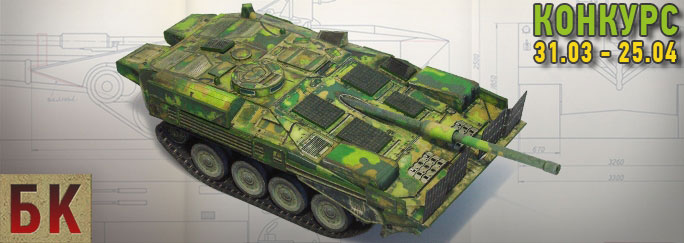 http://cdn-frm-eu.wargaming.net/wot/ru/uploads/monthly_03_2017/post-4861458-0-31595300-1490714129.jpg Мы приглашаем на конкурс по сборке бумажной модели из серии "Бронекоробочка", Strv 103B Задача: Собрать (склеить) бумажную модель Strv 103b «Бронекоробочка» №30» Сфотографировать результат и разместить работу здесь, в данной теме.Призы I место — Rheinmetall Skorpion G + слот + 30 дней према + медаль II место — Heavy Tank No. VI + слот + 14 дней према + медаль III место — Pz.Kpfw. IV Schmalturm + слот + 7 дней према + медаль Приз "Выбор зрителей" * ! Автор модели, которая наберет наибольшее количество "плюсов" ** от пользователей на момент окончания конкурса, получит Strv m/42-57 Alt A.2 + 3 дня ПА . *Итоги голосования судей и выбор зрителей могут не совпадать и не связаны между собой **Кнопка "репутация" внизу справа в каждом сообщении на форуме. Настоятельно рекомендуем не использовать накрутку голосов с помощью твинков. Это ведет к дисквалификации участника, см.пример Критерии оценки: Качество сборки модели . Качество и композиция фотографий. Соответствие работы регламенту конкурса.Начало приёма работ — 31 марта в 10:00 (МСК) в этой теме.Окончание приёма работ — 25 апреля в 23:59 (МСК) Дополнительные условия конкурса: Принять участие в конкурсе может любой пользователь. Один игрок — одна модель. Время создания модели - в период конкурса. Рекомендуемое разрешение изображения — не менее 1024х768 точек, размер — не более 500 КБ, формат — JPEG, PNG или GIF. Работа должна быть опубликована отдельным постом в конкурсном топике, с помощью тегов . О том, как это сделать, читайте в специальном разделе. Кроме модели, минимум на 1 фотографии должно присутствовать игровое имя автора. Игровое имя автора можно написать на листе бумаги и положить/закрепить рядом с моделью так, чтобы его можно было прочитать на фотографии. Рекомендации по фотосъемке и обработке снимков. Использование графических редакторов запрещено (за исключением цветокоррекции и изменения размера фотографий). Фотографии должны быть опубликованы на одном из разрешённых на портале игры фотохостингов или прикреплены непосредственно к сообщению. Победители и призёры конкурса должны быть готовы предоставить жюри исходные варианты опубликованных на форуме фотографий, с временем и параметрами съёмки; Модель должна быть завершенной (наличие всех деталей, которые предусмотрены инструкцией по сборке) Разрешается комбинировать мелкие детали зеленого и камо варианта. Разрешается полная перекраска модели (например нанесение другого камуфляжа, не из брошюры). Разрешается и рекомендуется подкраска торцов деталей и мелких элементов. Допускаются дополнения моделей: установка самодельных фар, лючков, инструмента и другие небольшие улучшения внешнего вида, увеличивающие копийность модели, с использованием мелких деталей из брошюры "Макет танка". Все изменения рекомендуется указать в сопроводительном тексте. На конкурс принимаются модели с любыми диорамами из брошюр WOT, включая «Фоторамка-подставка World of Tanks, 3 в 1». Место съемки может быть абсолютно любым, приветствуется однородный фон (бумага или ткань, без посторонних предметов в кадре). Работа не должна нарушать моральные, этические и правовые нормы. После публикации работы на форуме игры исключительные права на неё передаются компании Wargaming в соответствии с разделом «11. Интеллектуальные права» Лицензионного соглашения. Жюри конкурса оставляет за соб