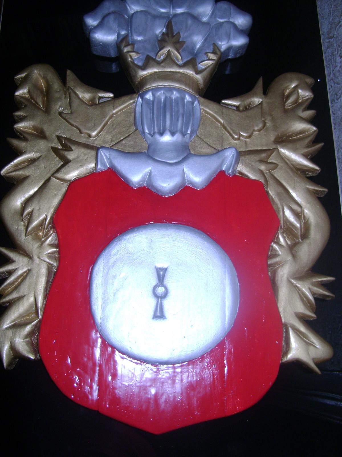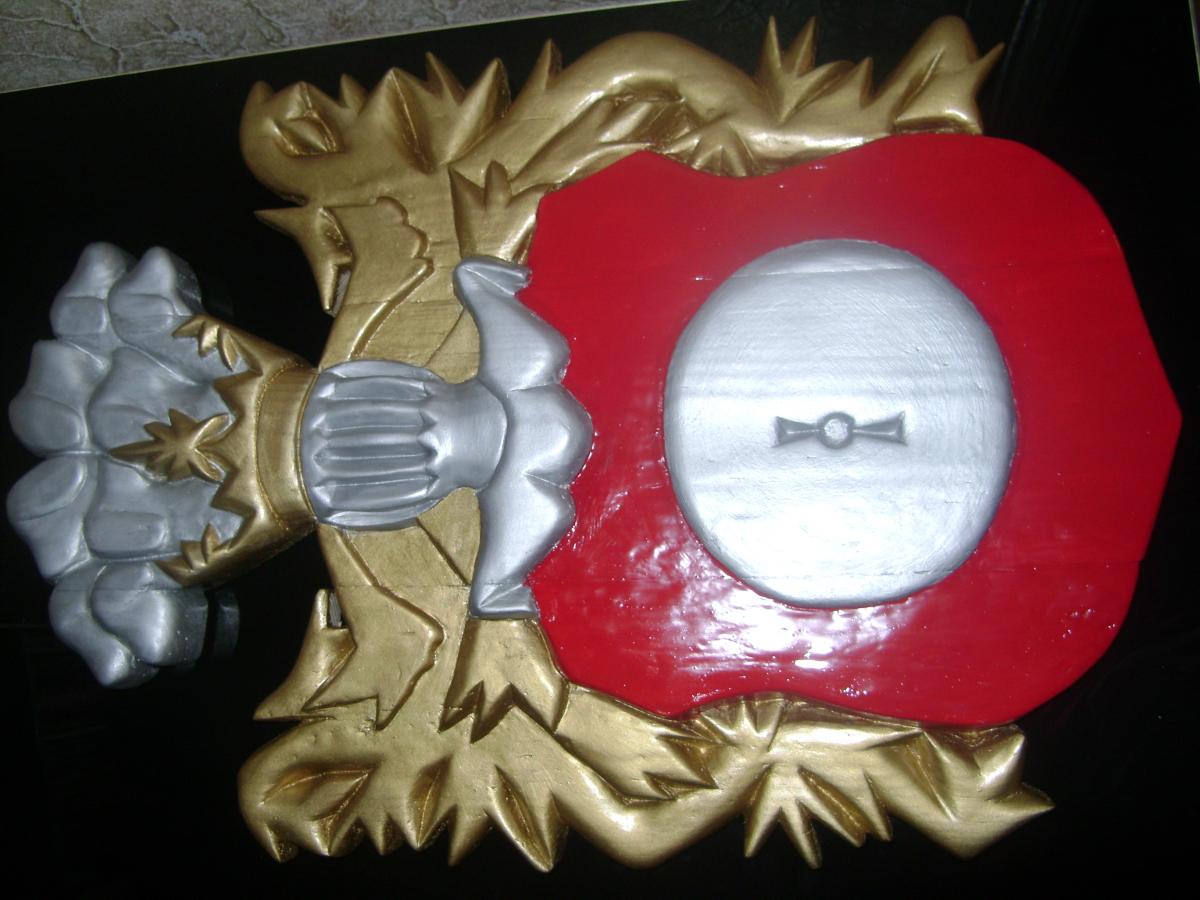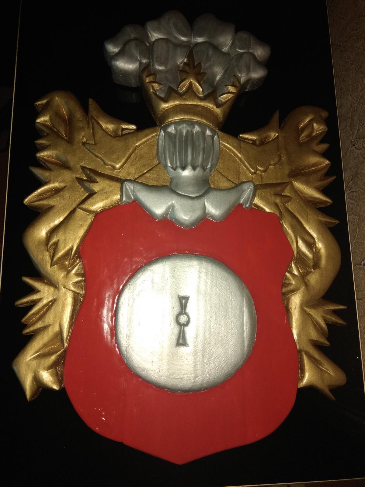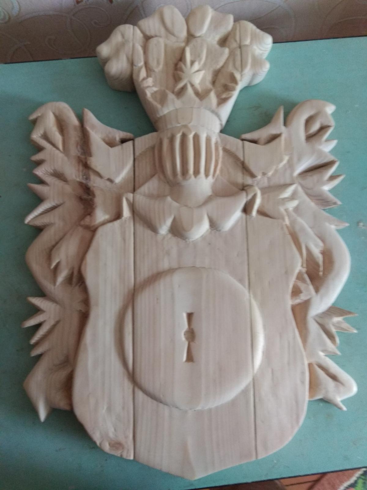 Дворянский герб "Кушаба", он же "Папржица" использовался в Польше, Беларуси и Литве. Википедия дает следующую информацию о нем. "Герб Папржица (Кушаба) — на белом, или же красном поле — мельничный камень (жёрнов) серого цвета. В нашлемнике восемь собачьих голов, из которых четыре повыше и четыре пониже. Герб этот перешёл из Богемии и Австрии. Герб имеет интересную легенду: некая дворянка строго наказала свою крестьянку, когда та родила сразу трёх сыновей (дама полагала, что на одного мужа, воспитание троих детей, слишком дорогое удовольствие). Увидев несправедливость, Бог наказал даму, и та сама родила сразу девятерых сыновей. Опасаясь гнева мужа, она приказала служанке восьмерых утопить, оставив одного. Муж случайно увидел служанку с корзиной, на его вопрос «куда та направляется» та ответила, что несёт топить щенков. Из любопытства муж взглянул на «щенков». Вызнав правду, хозяин приказал мельнику тайно вырастить своих сыновей. Когда они выросли, он собрал соседей и спросил, чего, по их мнению, достойна женщина, погубившая собственных детей. «Ка́зни», — ответили те. Привели восьмерых юношей, очень похожих друг на друга и на сына хозяев. Жена хотела покончить с собой, но муж простил её, а мельнику, воспитавшему сыновей, подарил описанный выше герб" (по другой версии - герб получили сами сыновья, на память о данном событии). Основой для работы послужил барельеф герба из приходской церкви в Дольхобышеве (оригинальное название kościół matki boskiej Dołhobyczowa) (Польша).http://cdn-frm-eu.wargaming.net/wot/ru/uploads/monthly_09_2018/post-2229884-0-83803200-1537882633_thumb.jpg, а также его созданное по всем геральдическим правилам изображение http://cdn-frm-eu.wargaming.net/wot/ru/uploads/monthly_09_2018/post-2229884-0-26501100-1537882742_thumb.png. Герб в начале работы - http://cdn-frm-eu.wargaming.net/wot/ru/uploads/monthly_09_2018/post-2229884-0-52527300-1537882847_thumb.jpg Готовый но не отшлифованный - http://cdn-frm-eu.wargaming.net/wot/ru/uploads/monthly_09_2018/post-2229884-0-79229600-1537882951_thumb.jpg Герб сделан из 3-х досок, и 2-х отдельных элементов, соединенных деревянными "пальцами" и клеем - http://cdn-frm-eu.wargaming.net/wot/ru/uploads/monthly_09_2018/post-2229884-0-40838300-1537883157_thumb.jpg Готовая модель (размеры 40 на 60 см) - http://cdn-frm-eu.wargaming.net/wot/ru/uploads/monthly_09_2018/post-2229884-0-34609700-1537883285_thumb.jpg http://cdn-frm-eu.wargaming.net/wot/ru/uploads/monthly_09_2018/post-2229884-0-12283800-1537883399_thumb.jpg http://cdn-frm-eu.wargaming.net/wot/ru/uploads/monthly_09_2018/post-2229884-0-02581300-1537883471_thumb.jpg http://cdn-frm-eu.wargaming.net/wot/ru/uploads/monthly_09_2018/post-2229884-0-53445300-1537883647_thumb.jpg http://cdn-frm-eu.wargaming.net/wot/ru/uploads/monthly_09_2018/post-2229884-0-32499300-1537883817_thumb.jpg http://cdn-frm-eu.wargaming.net/wot/ru/uploads/monthly_09_2018/post-2229884-0-61634100-1537883920_thumb.jpg Сложности были с определением размеров исходного барельефа (взятого за основу), данных о его размерах не было, пришлось определять по фотографиям костёла найденным в сети интернет, на основе соотношения с кафедрой и людьми (на других фото) - http://cdn-frm-eu.wargaming.net/wot/ru/uploads/monthly_09_2018/post-2229884-0-90990600-1537884068_thumb.jpg (барельеф справа, над кафедрой).