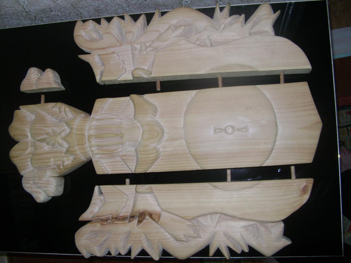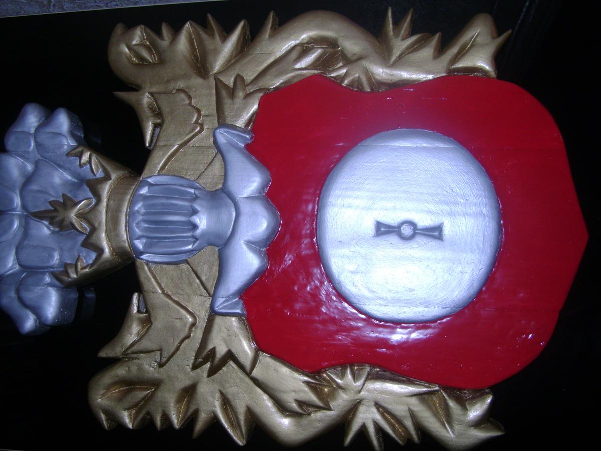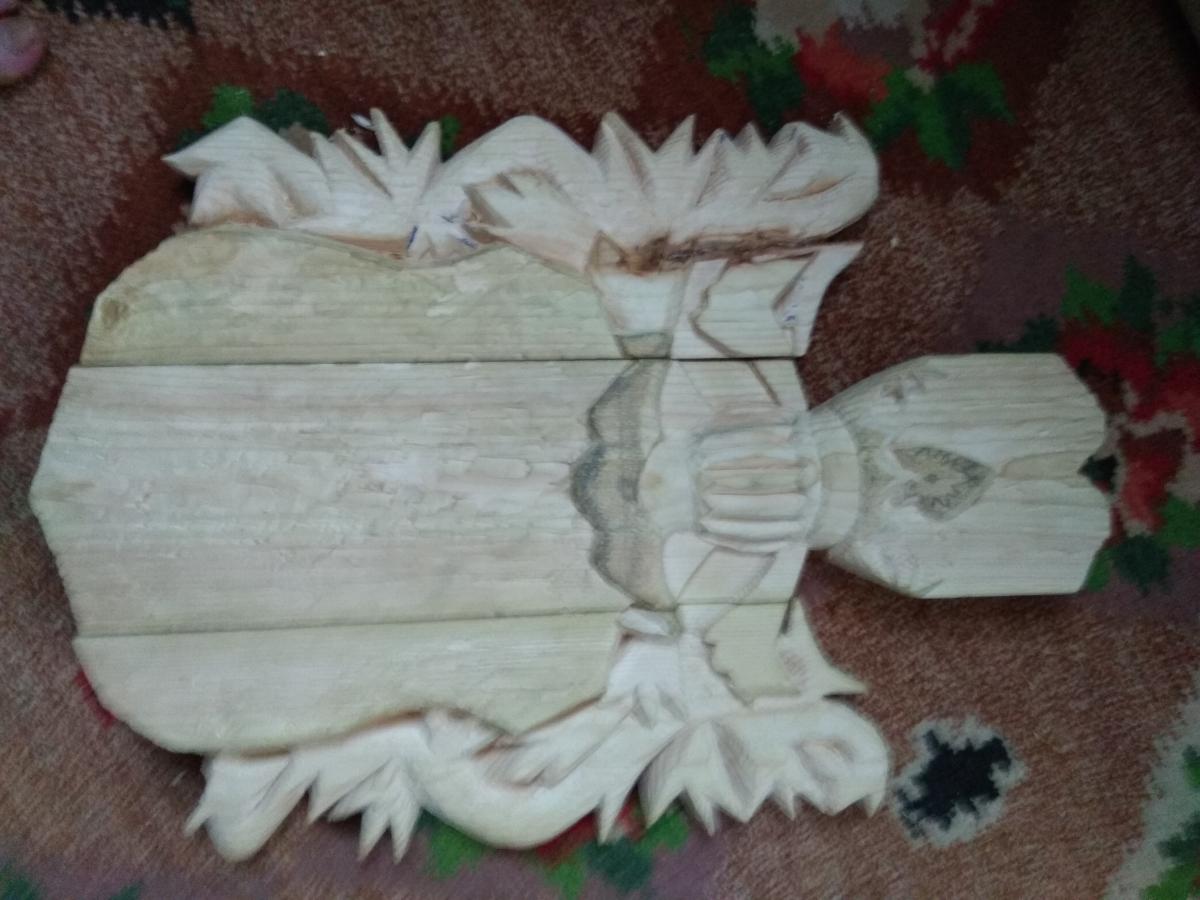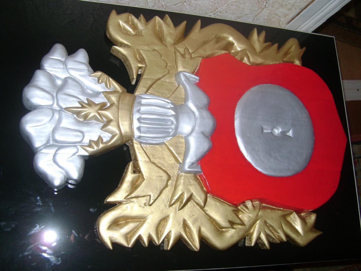 Дворянский герб "Кушаба", он же "Папржица" использовался в Польше, Беларуси и Литве. Википедия дает следующую информацию о нем. "Герб Папржица (Кушаба) — на белом, или же красном поле — мельничный камень (жёрнов) серого цвета. В нашлемнике восемь собачьих голов, из которых четыре повыше и четыре пониже. Герб этот перешёл из Богемии и Австрии. Герб имеет интересную легенду: некая дворянка строго наказала свою крестьянку, когда та родила сразу трёх сыновей (дама полагала, что на одного мужа, воспитание троих детей, слишком дорогое удовольствие). Увидев несправедливость, Бог наказал даму, и та сама родила сразу девятерых сыновей. Опасаясь гнева мужа, она приказала служанке восьмерых утопить, оставив одного. Муж случайно увидел служанку с корзиной, на его вопрос «куда та направляется» та ответила, что несёт топить щенков. Из любопытства муж взглянул на «щенков». Вызнав правду, хозяин приказал мельнику тайно вырастить своих сыновей. Когда они выросли, он собрал соседей и спросил, чего, по их мнению, достойна женщина, погубившая собственных детей. «Ка́зни», — ответили те. Привели восьмерых юношей, очень похожих друг на друга и на сына хозяев. Жена хотела покончить с собой, но муж простил её, а мельнику, воспитавшему сыновей, подарил описанный выше герб" (по другой версии - герб получили сами сыновья, на память о данном событии). Основой для работы послужил барельеф герба из приходской церкви в Дольхобышеве (оригинальное название kościół matki boskiej Dołhobyczowa) (Польша).http://cdn-frm-eu.wargaming.net/wot/ru/uploads/monthly_09_2018/post-2229884-0-83803200-1537882633_thumb.jpg, а также его созданное по всем геральдическим правилам изображение http://cdn-frm-eu.wargaming.net/wot/ru/uploads/monthly_09_2018/post-2229884-0-26501100-1537882742_thumb.png. Герб в начале работы - http://cdn-frm-eu.wargaming.net/wot/ru/uploads/monthly_09_2018/post-2229884-0-52527300-1537882847_thumb.jpg Готовый но не отшлифованный - http://cdn-frm-eu.wargaming.net/wot/ru/uploads/monthly_09_2018/post-2229884-0-79229600-1537882951_thumb.jpg Герб сделан из 3-х досок, и 2-х отдельных элементов, соединенных деревянными "пальцами" и клеем - http://cdn-frm-eu.wargaming.net/wot/ru/uploads/monthly_09_2018/post-2229884-0-40838300-1537883157_thumb.jpg Готовая модель (размеры 40 на 60 см) - http://cdn-frm-eu.wargaming.net/wot/ru/uploads/monthly_09_2018/post-2229884-0-34609700-1537883285_thumb.jpg http://cdn-frm-eu.wargaming.net/wot/ru/uploads/monthly_09_2018/post-2229884-0-12283800-1537883399_thumb.jpg http://cdn-frm-eu.wargaming.net/wot/ru/uploads/monthly_09_2018/post-2229884-0-02581300-1537883471_thumb.jpg http://cdn-frm-eu.wargaming.net/wot/ru/uploads/monthly_09_2018/post-2229884-0-53445300-1537883647_thumb.jpg http://cdn-frm-eu.wargaming.net/wot/ru/uploads/monthly_09_2018/post-2229884-0-32499300-1537883817_thumb.jpg http://cdn-frm-eu.wargaming.net/wot/ru/uploads/monthly_09_2018/post-2229884-0-61634100-1537883920_thumb.jpg Сложности были с определением размеров исходного барельефа (взятого за основу), данных о его размерах не было, пришлось определять по фотографиям костёла найденным в сети интернет, на основе соотношения с кафедрой и людьми (на других фото) - http://cdn-frm-eu.wargaming.net/wot/ru/uploads/monthly_09_2018/post-2229884-0-90990600-1537884068_thumb.jpg (барельеф справа, над кафедрой).