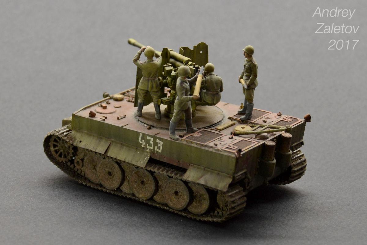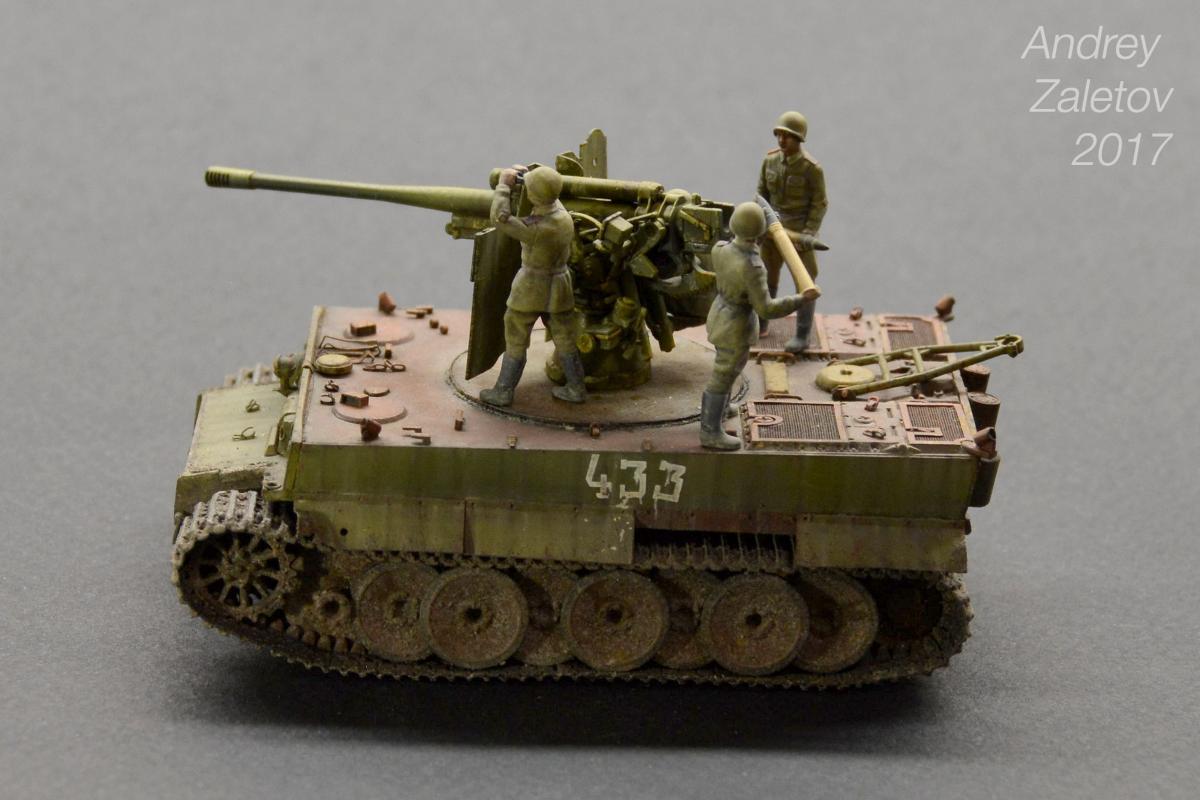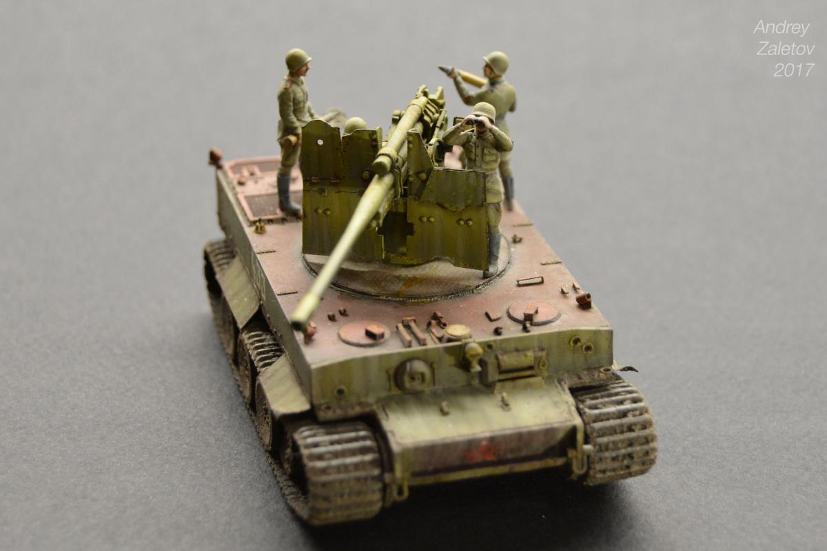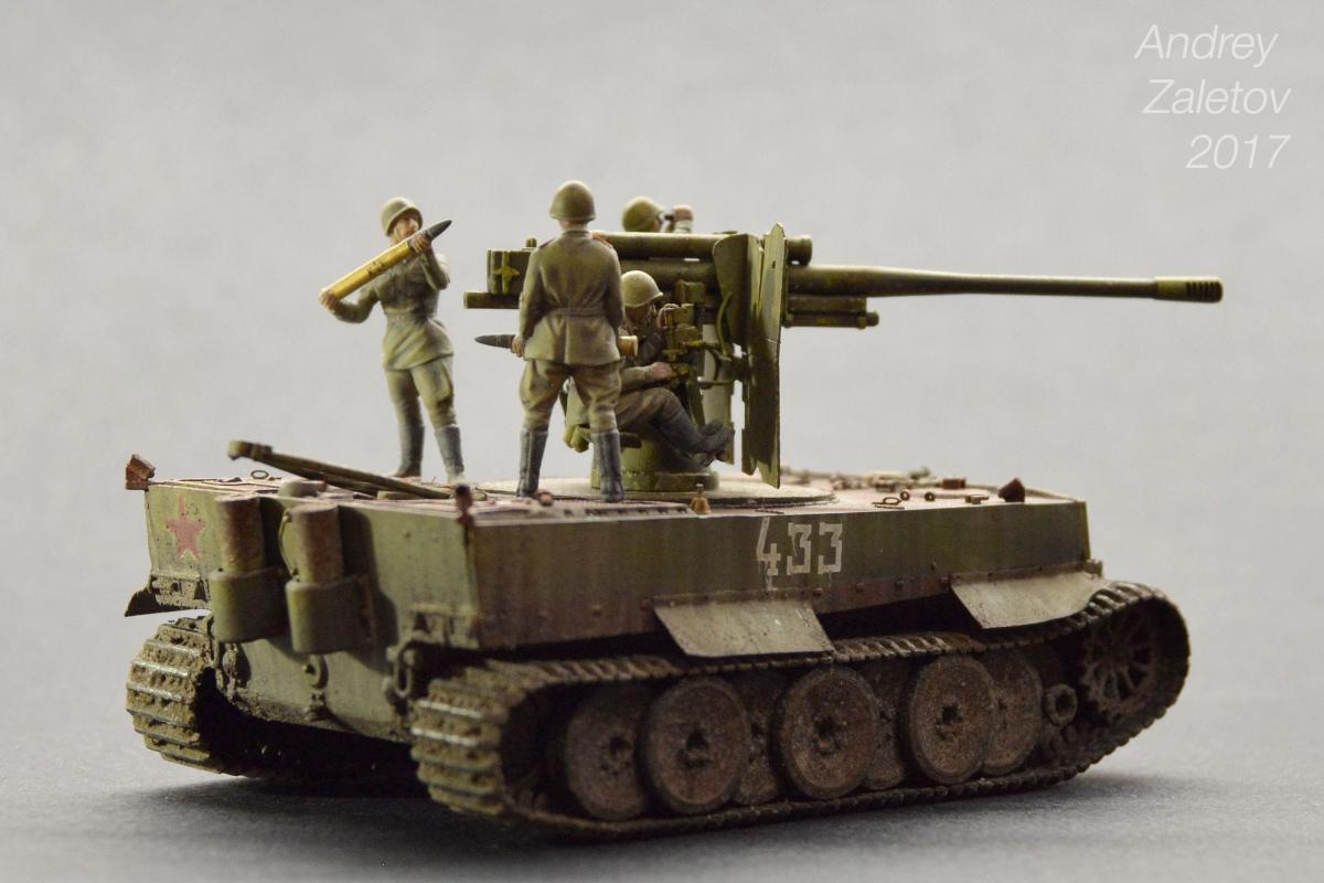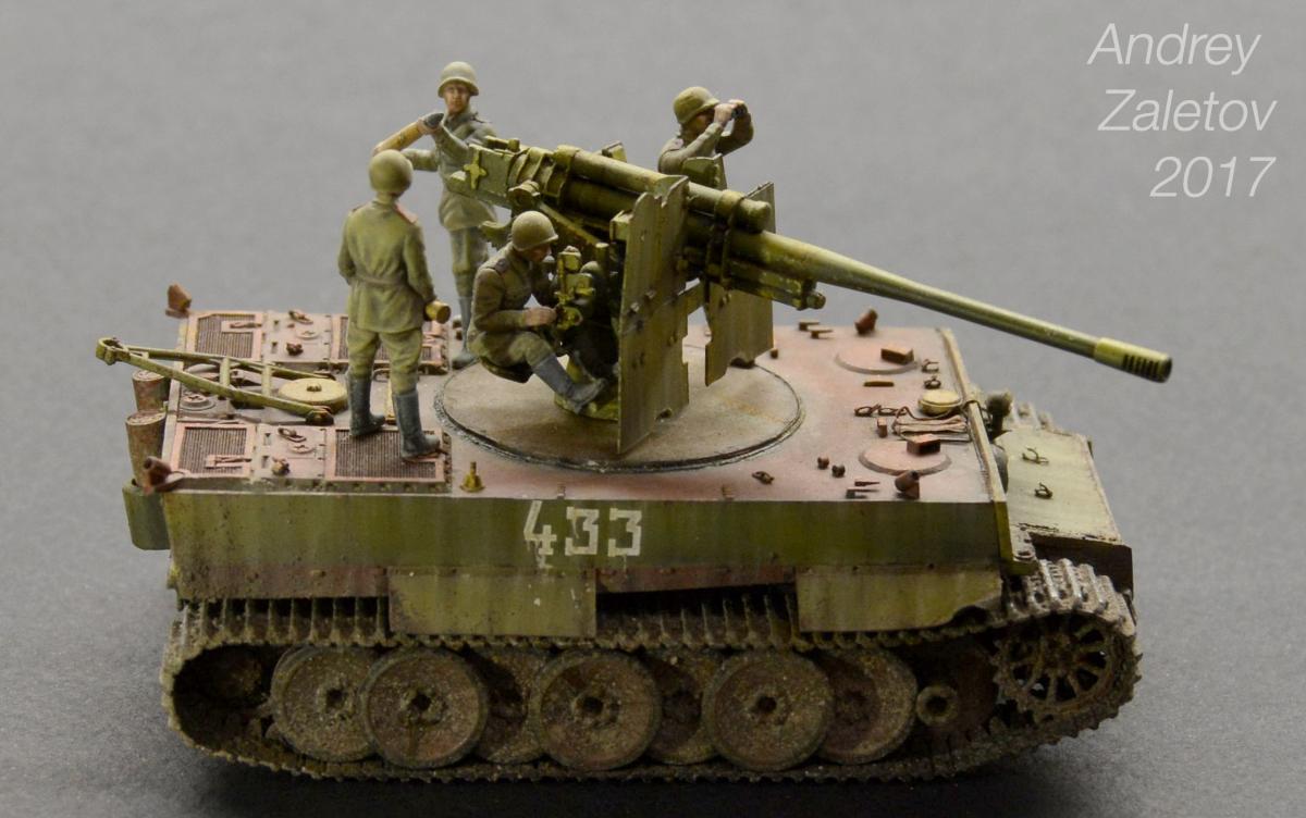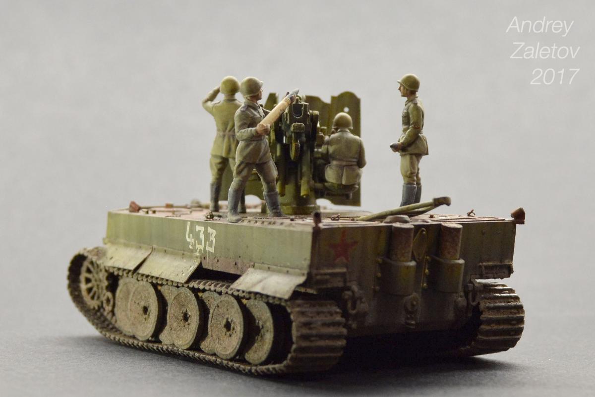 Фантазия одновременно на две темы: What if и трофейная техника. Не стоит воспринимать данный треш всерьез и искать какую-то логику вообще. Хотелось бы покончить с надоевшей темой 72 масштаба (хотя бы в этом году). Все же у меня создалось ощущение, что этот масштаб в некоторой степени презираем на фоне 35 масштаба. Средненькая работа в "серьезном" масштабе воспринимается отечественными ортодоксальными моделистами чуть ли не лучше отличной в "слепом" масштабе. Возможно это просто все мои додумки, ну да неважно. Касательно самой модели: захотелось сделать что-то максимально быстро и на свободную тему, и чтобы с фигурами людей. По этому взял новую для меня модель советской пушки 52-к с расчетом и уже знакомый для меня Тигр (оба набора выпускаются отечественной Звездой). Я понял, что никто не читает этот графоманский бред и к тому же бессмысленно пытаться научить читателя каким-то техникам в письменной форме, так что впредь постараюсь быть более лаконичным.