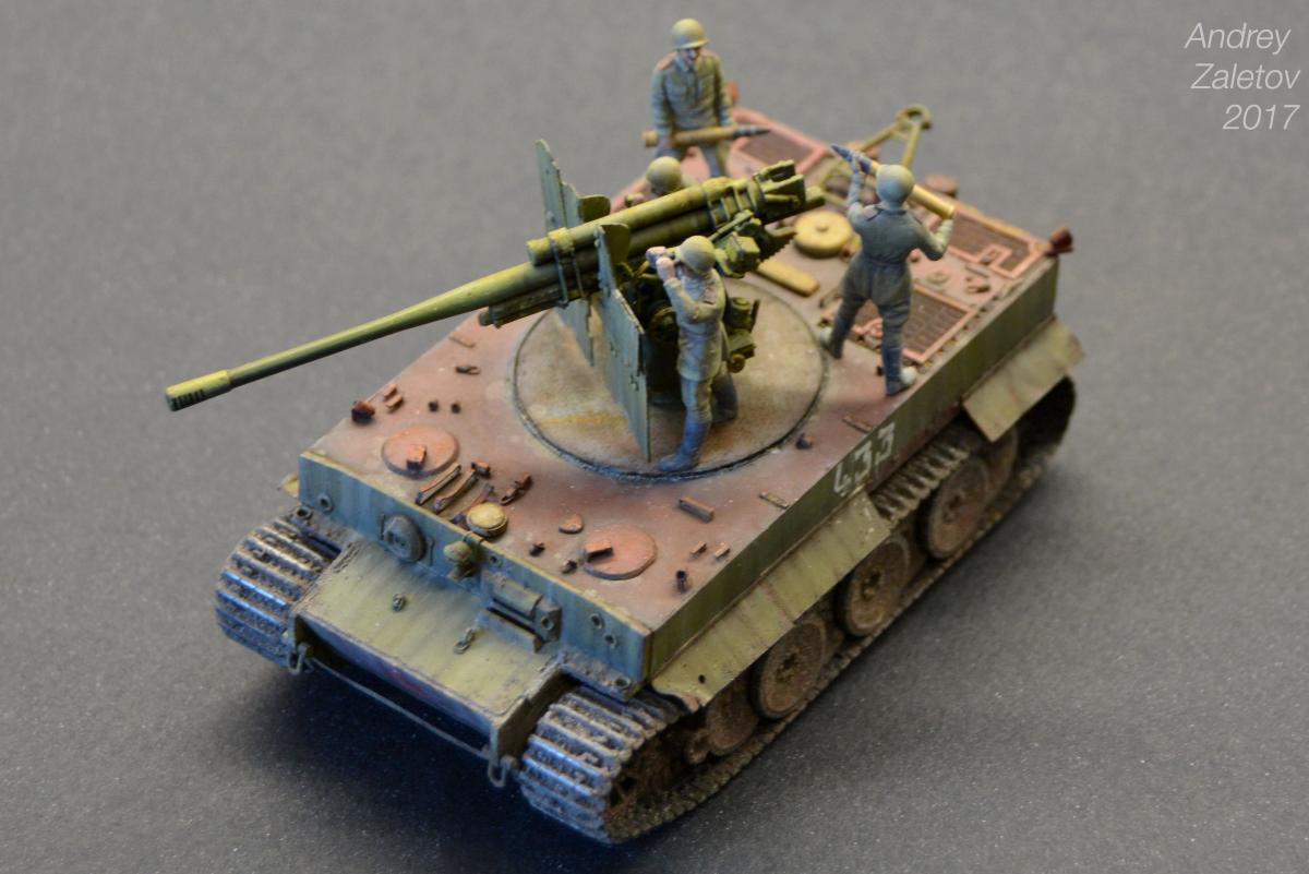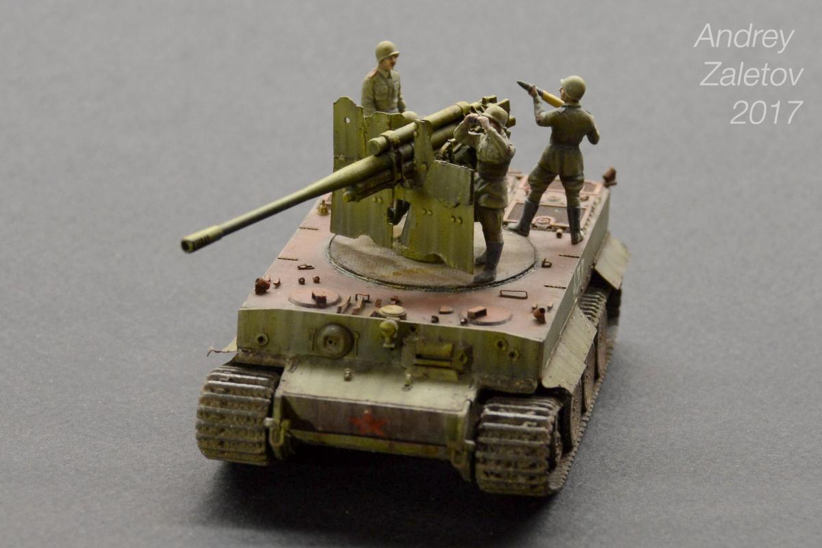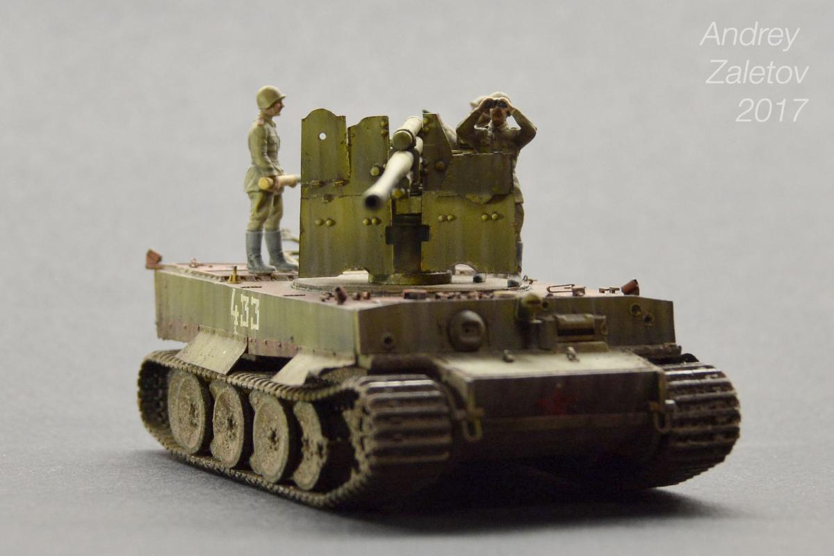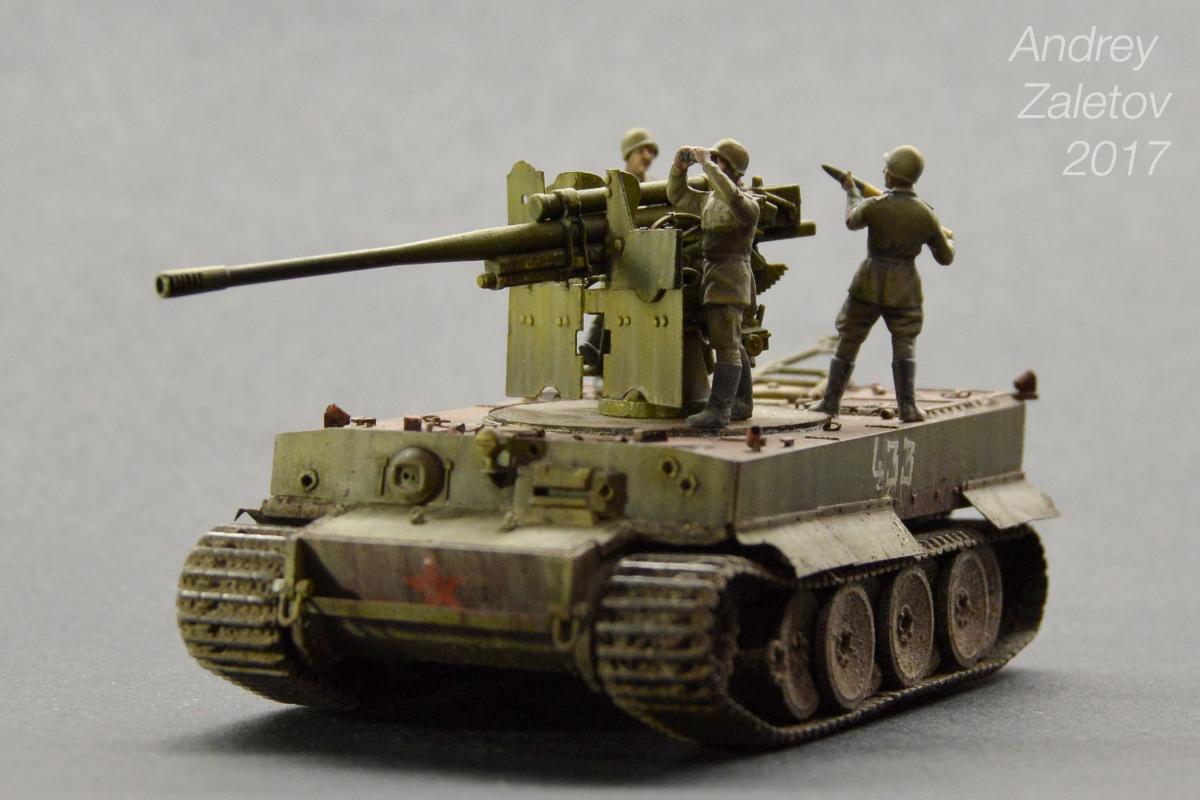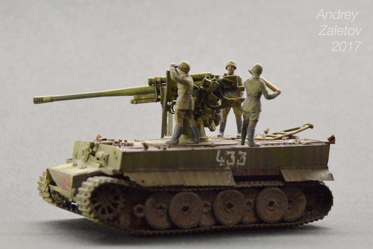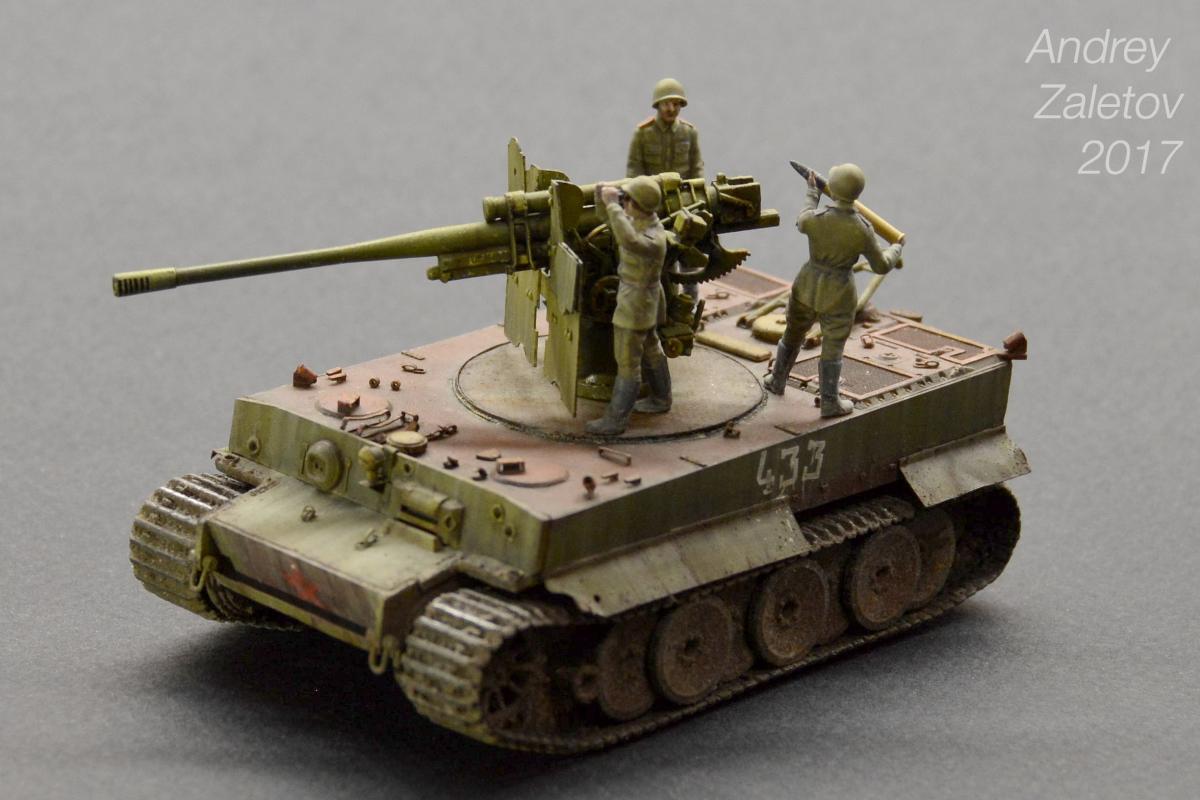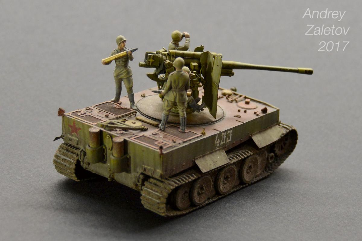 Фантазия одновременно на две темы: What if и трофейная техника. Не стоит воспринимать данный треш всерьез и искать какую-то логику вообще. Хотелось бы покончить с надоевшей темой 72 масштаба (хотя бы в этом году). Все же у меня создалось ощущение, что этот масштаб в некоторой степени презираем на фоне 35 масштаба. Средненькая работа в "серьезном" масштабе воспринимается отечественными ортодоксальными моделистами чуть ли не лучше отличной в "слепом" масштабе. Возможно это просто все мои додумки, ну да неважно. Касательно самой модели: захотелось сделать что-то максимально быстро и на свободную тему, и чтобы с фигурами людей. По этому взял новую для меня модель советской пушки 52-к с расчетом и уже знакомый для меня Тигр (оба набора выпускаются отечественной Звездой). Я понял, что никто не читает этот графоманский бред и к тому же бессмысленно пытаться научить читателя каким-то техникам в письменной форме, так что впредь постараюсь быть более лаконичным.