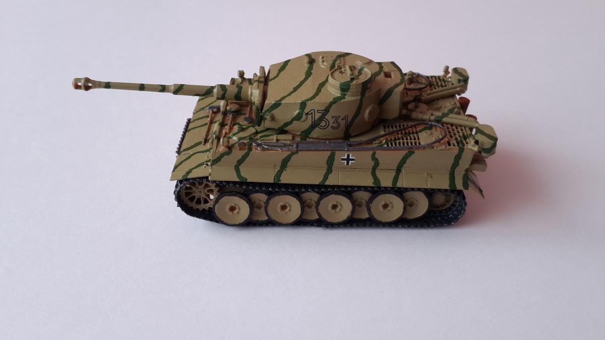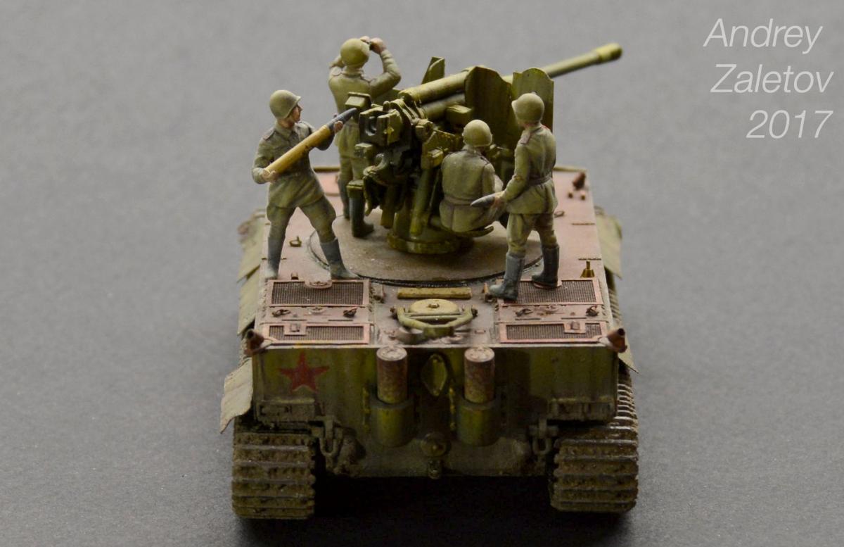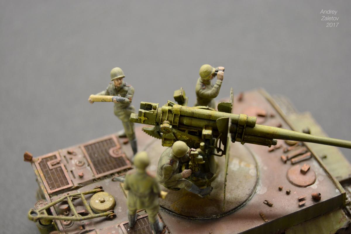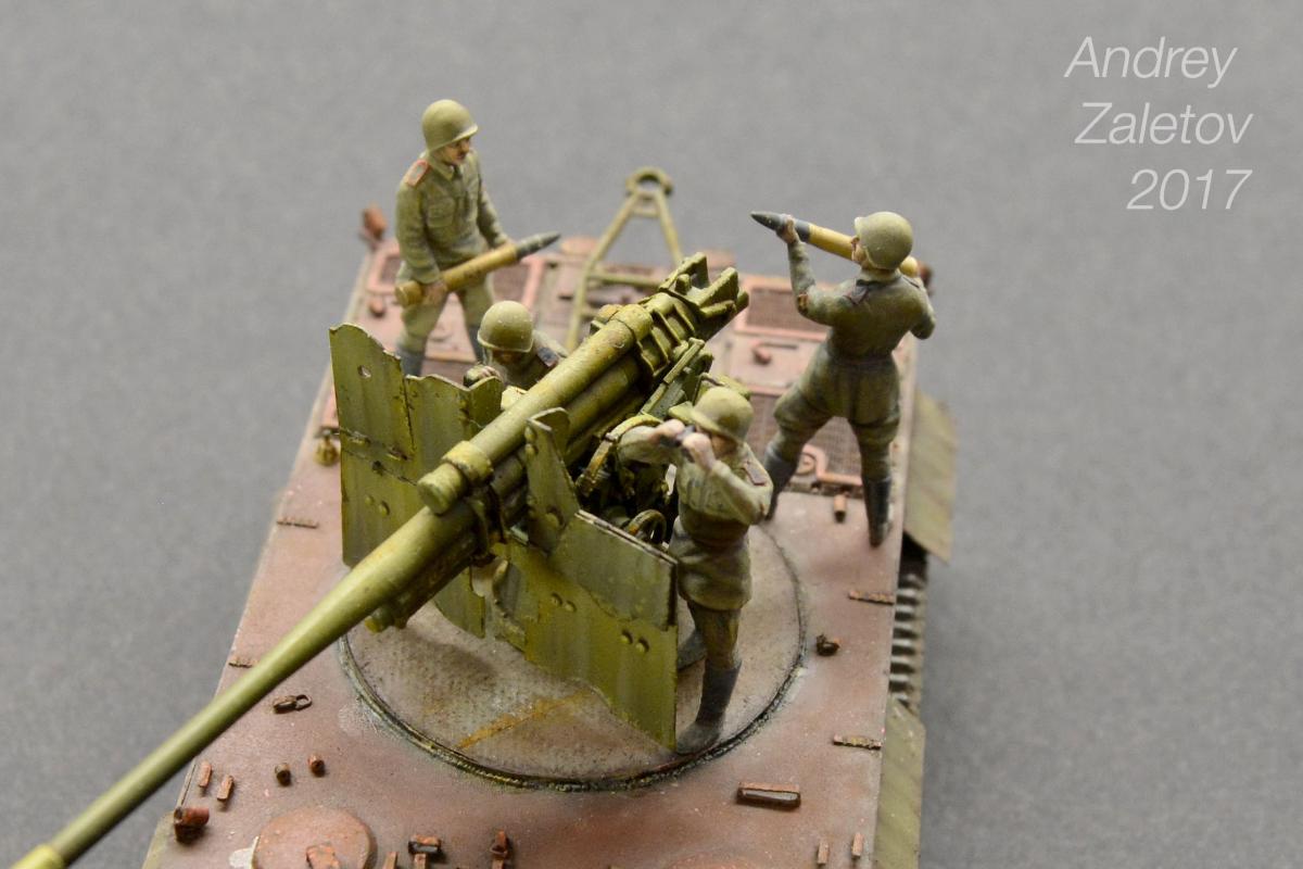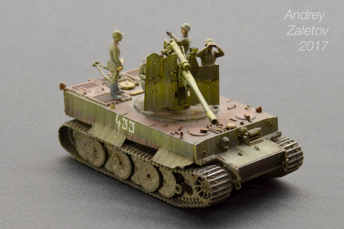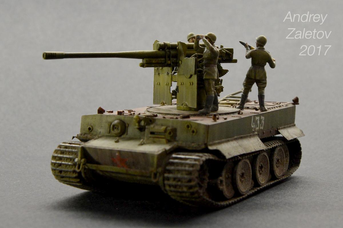Фантазия одновременно на две темы: What if и трофейная техника. Не стоит воспринимать данный треш всерьез и искать какую-то логику вообще. Хотелось бы покончить с надоевшей темой 72 масштаба (хотя бы в этом году). Все же у меня создалось ощущение, что этот масштаб в некоторой степени презираем на фоне 35 масштаба. Средненькая работа в "серьезном" масштабе воспринимается отечественными ортодоксальными моделистами чуть ли не лучше отличной в "слепом" масштабе. Возможно это просто все мои додумки, ну да неважно. Касательно самой модели: захотелось сделать что-то максимально быстро и на свободную тему, и чтобы с фигурами людей. По этому взял новую для меня модель советской пушки 52-к с расчетом и уже знакомый для меня Тигр (оба набора выпускаются отечественной Звездой). Я понял, что никто не читает этот графоманский бред и к тому же бессмысленно пытаться научить читателя каким-то техникам в письменной форме, так что впредь постараюсь быть более лаконичным.