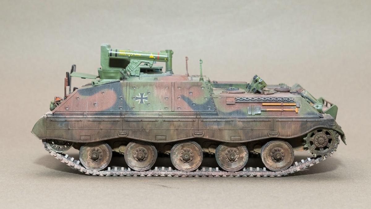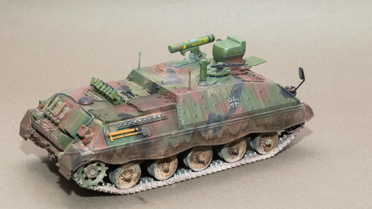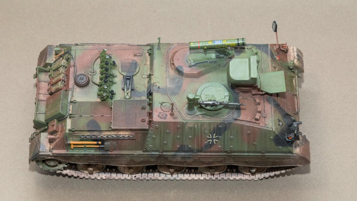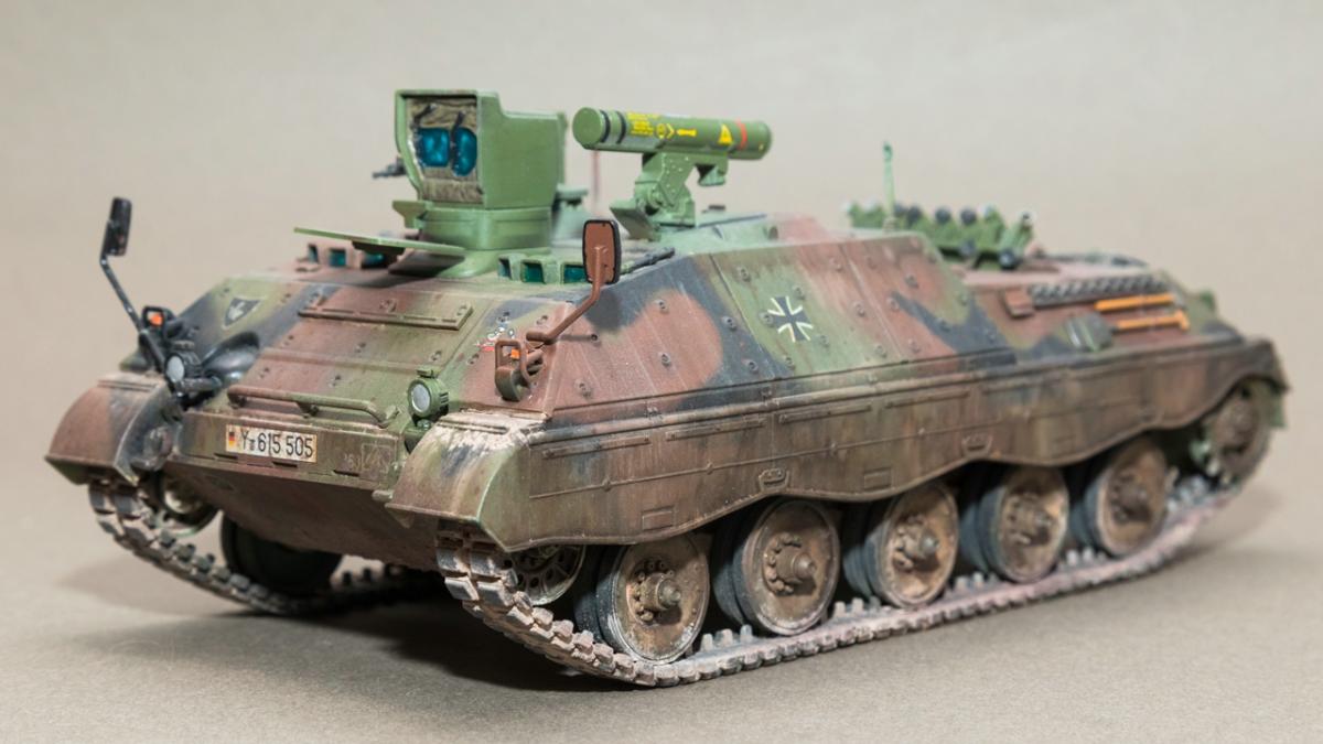 Представляю вашему вниманию свою очередную "карантинную" сборку. На сегодняшний день данная модель является безальтернативной в 35 масштабе. Сама модель 2008 года, но Revell уже анонсировал перевыпуск данной модели - возможно будут какие-то изменения. На сегодняшний день к модели есть ряд замечаний:1) жесткий и одновременно ломкий пластик2) толстые декали3) при сборке варианта А3 (с башней прицела) установить пулемет по инструкции не представляется возможным4) туба ракетной установке тоньше чем декаль - лучше заменить ее на трубку подходящего диаметра5) нет тросаСама сборка не вызывает вопросов и достаточно проста, хотя отлитые бортовые экраны совместно с боковинами корпуса вызывают удивление. Основная сборка из коробки, от себя добавил только дымовые гранаты от "Magic Models" и из остатков от других моделей подобрал коуши для троса. Производитель дает варианты декалей для нескольких типов подобных машин. Я выбрал вариант А3 армии Бундесвера на период 1995 года.Окраска стандартная - акрилы от МрКолор и Тамии. Везеренг жидкостями от АК и МиГ.Конструктивная критика и комментарии приветствуются.http://cdn-frm-eu.wargaming.net/wot/ru/uploads/monthly_05_2020/post-1579793-0-55443800-1588591680_thumb.jpghttp://cdn-frm-eu.wargaming.net/wot/ru/uploads/monthly_05_2020/post-1579793-0-49343600-1588591715_thumb.jpghttp://cdn-frm-eu.wargaming.net/wot/ru/uploads/monthly_05_2020/post-1579793-0-42384100-1588591732_thumb.jpghttp://cdn-frm-eu.wargaming.net/wot/ru/uploads/monthly_05_2020/post-1579793-0-07794300-1588591692_thumb.jpghttp://cdn-frm-eu.wargaming.net/wot/ru/uploads/monthly_05_2020/post-1579793-0-77284200-1588591703_thumb.jpghttp://cdn-frm-eu.wargaming.net/wot/ru/uploads/monthly_05_2020/post-1579793-0-78730000-1588591746_thumb.jpghttp://cdn-frm-eu.wargaming.net/wot/ru/uploads/monthly_05_2020/post-1579793-0-51461300-1588591772_thumb.jpghttp://cdn-frm-eu.wargaming.net/wot/ru/uploads/monthly_05_2020/post-1579793-0-82252400-1588591761_thumb.jpghttp://cdn-frm-eu.wargaming.net/wot/ru/uploads/monthly_05_2020/post-1579793-0-56678700-1588591790_thumb.jpg