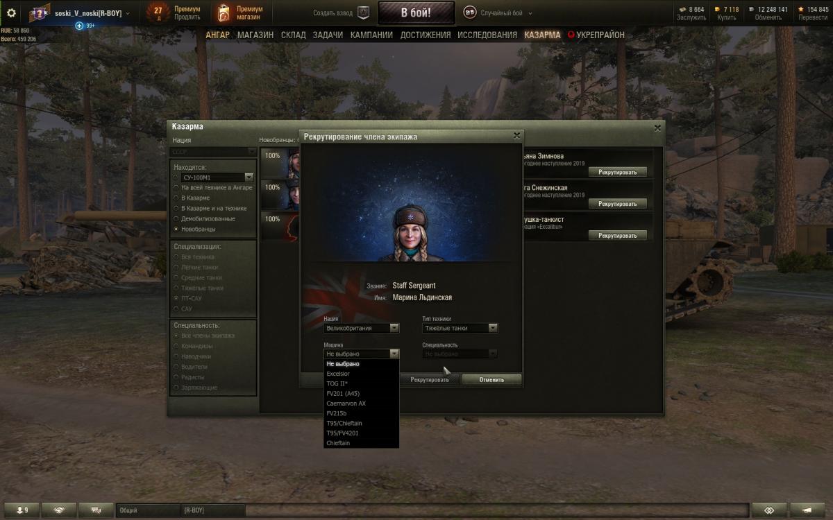 Получил за солдаты удачи танк T95/FV4201 Chieftain, так как тяжей Великобритании у меня нет, решил рекрутировать с нового года наградных девченок, но вот не задача, при выборе тяжелых танков Великобритании не все танки есть в списке. Конкретно мне был интересен Тяжёлый танк Churchill VII и его в списке выбор нет. http://cdn-frm-eu.wargaming.net/wot/ru/uploads/monthly_02_2019/post-16368032-0-83601100-1549553970_thumb.jpg
