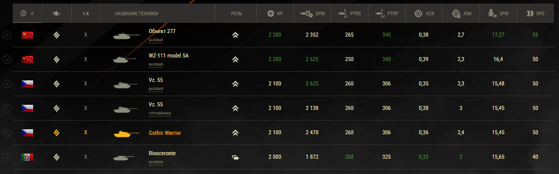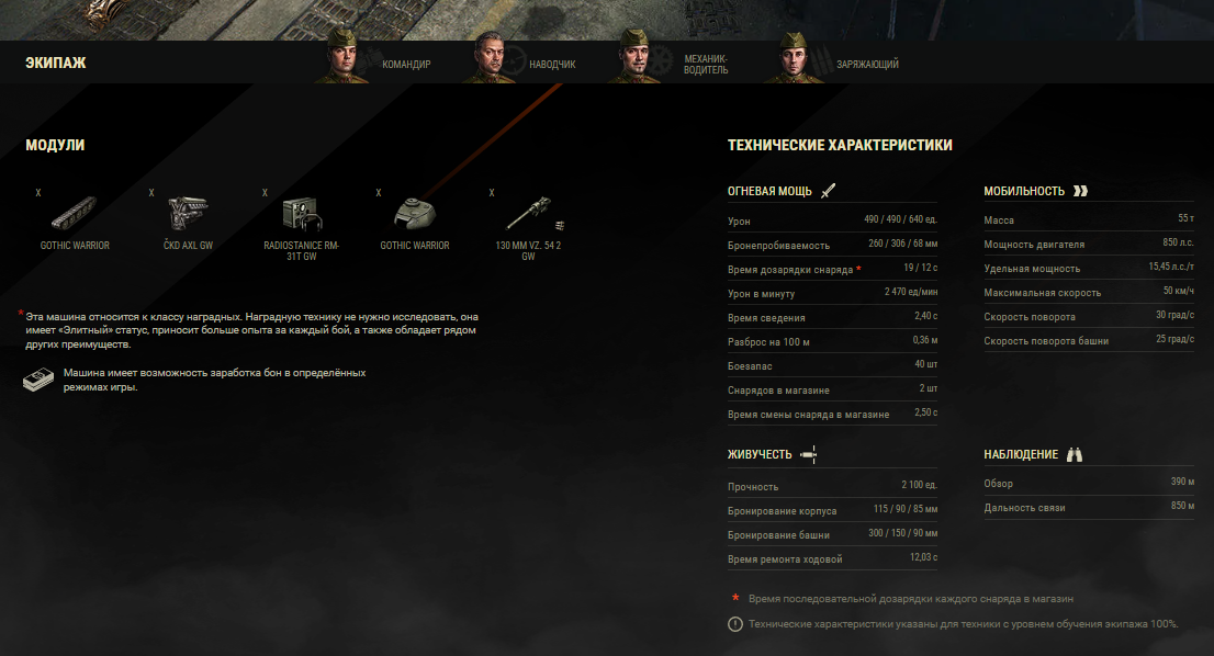 Эскизный проект тяжёлого танка конца 50-х – начала 60-х годов. Проект сочетал в себе наработки советской и чешской конструкторской мысли наряду с оригинальными решениями. Работы были свёрнуты в связи с унификацией образцов вооружения стран-участниц Организации Варшавского договора. Не было выпущено ни одного образца. В игре танк представлен на десятом уровне в виде тяжелого танка Чехословакии - Gothic Warrior. Является наградным танком за клановые ивенты Маневры и ГК. Игровые ТТХ Характеристики машины могут быть изменены без компенсации. Плюсы: Барабан на 2 снаряда по 490 урона с возможностью дозарядки. Хорошее точность и время сведение (по сравнению с Vz. 55 на барабане). Хорошая стабилизация (с оборудованием). Никаких проблем досвестись между выстрелами. Неплохая подвижность для тяжелого танка. Общая универсальность танка. Минусы: Малое количество ХП - всего 2100 в базе. Невысокое бронирование корпуса, а также уязвимая ком. башенка. Слабое пробитие премиумным снарядом - всего 306 мм. Мауса пробить будет сложно. Неудобство с механикой дозарядки. Очень хочется в бою выстрелить первый снаряд не дожидаясь второго. Общая зависимость от союзников. Танк не самодостаточный. Сравнение с одноклассниками: Танк примерно соответствует Vz.55 с орудием без барабана по точности/сведению и ДПМ, но имеет возможность выдать барабан на 2 снаряда. Порядок прокачки модулей Как и абсолютное большинство техники 10-го уровня не нуждается в прокачке. Полевая модернизация По классу относится к "Тяжелым танки прорыва". Непосредственно прокачка ПМ даёт постоянный бонус +3% к запасу прочности танка и +2% мощности двигателя. Первые три уровня парных модернизаций идентичны все СТ: Вездеходная ходовая (7,5% проходимости) / Облегченная ходовая (5% скорости поворота, 10% скорости ремонта) - однозначно проходимость. Отстройка параллакса (2% точности) / Притирка шестерней наведения( 5% время сведения) - субъективно, точности и так достаточно для игры на средние дистанции, сведения для барабана не может быть лишним. Но и обратное тоже может быть. Если брать ПМ на максимальную скорость рекомендую всё-таки сведение. Звукоизоляция (10% времини оглушения) / Электропривод перископа (3% обзора) - однозначно обзор. Перераспределение питания Схема 1 (4 км/ч максимальная скорость вперед) / Схема 2 ( 5% сведения, 7% скорость поворота башни) - я бы выбрал скорость, но сведение тоже неплохо. Если не играть как СТ, а ездить с тяжами, то можно и сведение. Усиленная платформа (2% ХП) / Облегченная платформа (4% стабилизации движения и поворота ходовой) - Мне кажется ХП лучше, стабилизацию можно получить другим путем. Оборудование Варианты установки оборудования: Маневренный билд 1: Вентиляция, Турбина, Стабилизатор/СУО. Максимальную скорость с турбиной и ПМ можно довести до 59/60 км. Маневренный билд 2: СУО, Турбина, Стабилизатор. Максимальную скорость с турбиной и ПМ можно довести до 59/60 км. Чуть меньше ДПМ, значительно больше точность. Билд комфорта огня: УПМ, Стабилизатор, СУО. Билд на максимальную стабилизацию для гарантированной выдачи барабана. Универсальный билд: Вентиляция, Стабилизатор, СПМ/СУО. Просто рабочая лошадка. Прочность и скорость: Закалка, Турбина, Вентиляция. Альтернативный вариант, если ПМ прокачена и по опыту вам хватает Стабилизации на реализацию, можно попытать увеличить прочность (до 2490 ХП абсолютный 