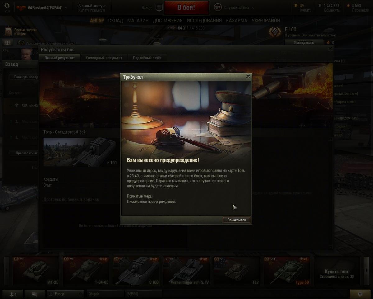 Играя во взводе зашли в бой, при разговоре по внутренней связи резко подскочил пинг до злостных 999, несколько секунд и выскочила надпись что связь с сервером потеряна! перезагрузив игру,заняло у меня это минуты 2 (переподключал инет). И что я вижу при заходе в игру, команда слилась. добивали последнего, в чате словесный ***. Но не это главное-вот-http://cdn-frm-eu.wargaming.net/wot/ru/uploads/monthly_11_2014/post-4816823-0-50202500-1415250391_thumb.jpg!!! вот что я увидел попав в ангар! За что? в бой я зашел, до окончания боя я тоже присутствовал! или выходит не состоявшиеся герои победители сочли поражение моей виной и тыкали кипя злобой вот тебе е 100 вот, будешь знать как стоять! И сколько таких карточек я еще получу при оной ситуации неизвестно, у меня за вечер раза 2 инет чудит! банят по такой статье? и насколько? и как работает этот функционал если это не герои меня *зажалобили*)