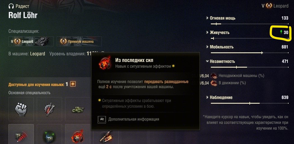 Здравствуйте. Случайно заметил один нюанс: навык из последних сил имплементирован в категорию живучесть (зелёный индикатор на скриншоте). https://forum-mt-prod.lesta.ru/monthly_04_2025/post-8526561-0-35924100-1745140353_thumb.jpg Не кажется ли вам более справедливым имплементировать его в категорию "наблюдение"? 1. Выживание радиста (или совместителя) - это ограничительное условие для получения основного бонуса: + к времени остаточного обнаружения. 2. Остаточное обнаружение суть категория наблюдения (в системе обнаружения). 3. Таким образом, с категориальной точки зрения, бонус должен прямо и явно перевешивать ограничительное условие? Спасибо за ответ.