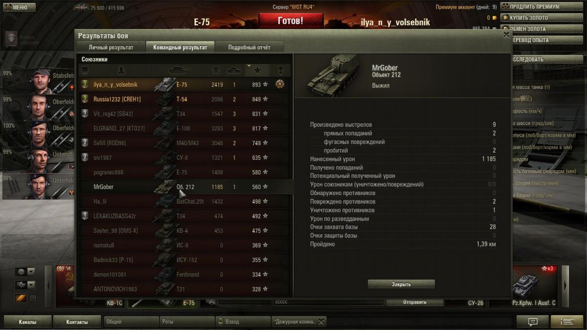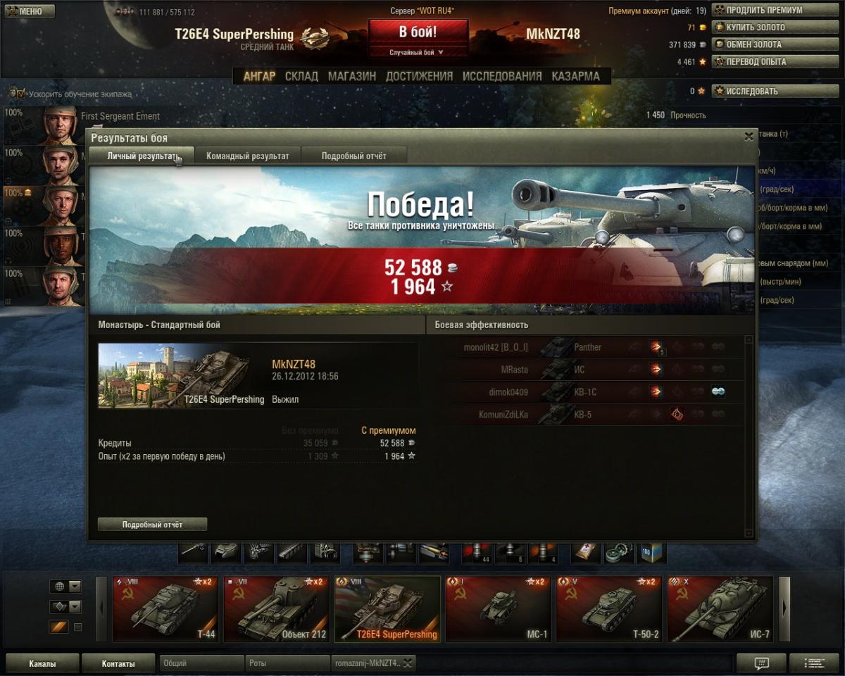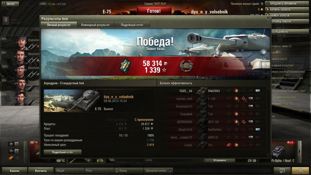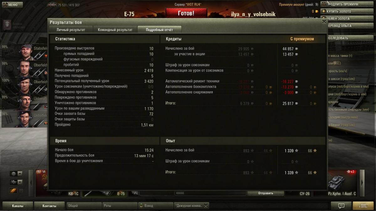 В самом начале задал вопрос о возможности совместных действий с другим черчиллем и вот хорошо получилось, били практически слаженно, по одним целям, был рискованный момент с китайской копией т34, но тут я успел, после обошел, оставил напарника охранять базу, а сам пошел выбивать арту, после брал флаг и по мне отлично ударила пт, дождался ее и уничтожил, потом решил поделиться наградами с напарником, встал за т49 и ждал, пока он возьмет флаг. Воин, -9, более 50000 серебра и 2500 урона. А у другого тоже хватает. От себя, как многие знают, данный прем танк, как и многие другие(т2лт, кв5 и далее) стали слабо конкурентно способны связи с изменениями систем урона, пробитий, их относительного балансного веса, даже с учетом использования прем расходников. Спасибо за участие: TROZeR[LEGAL] Музыка: Audien feat. Michael S. - Leaving You