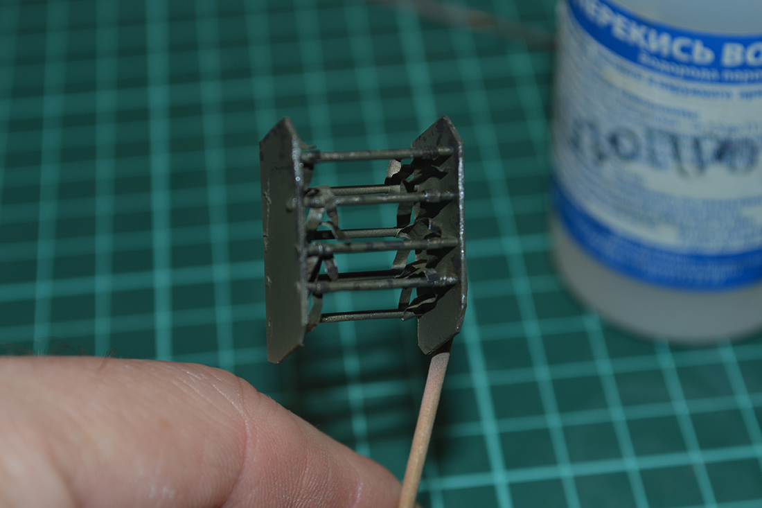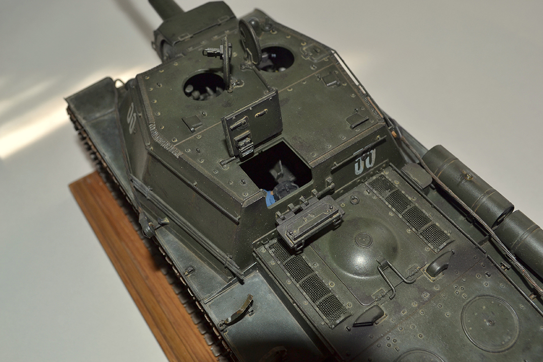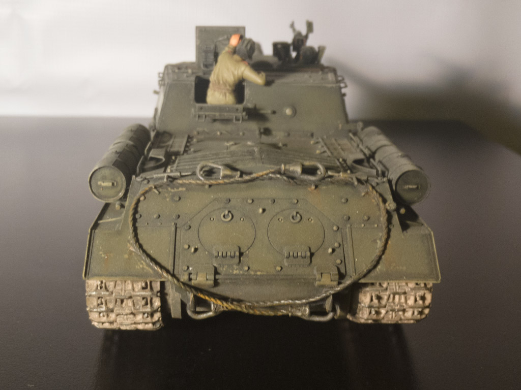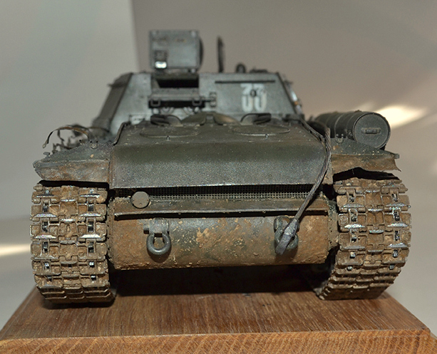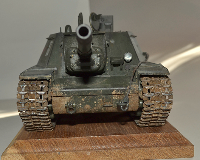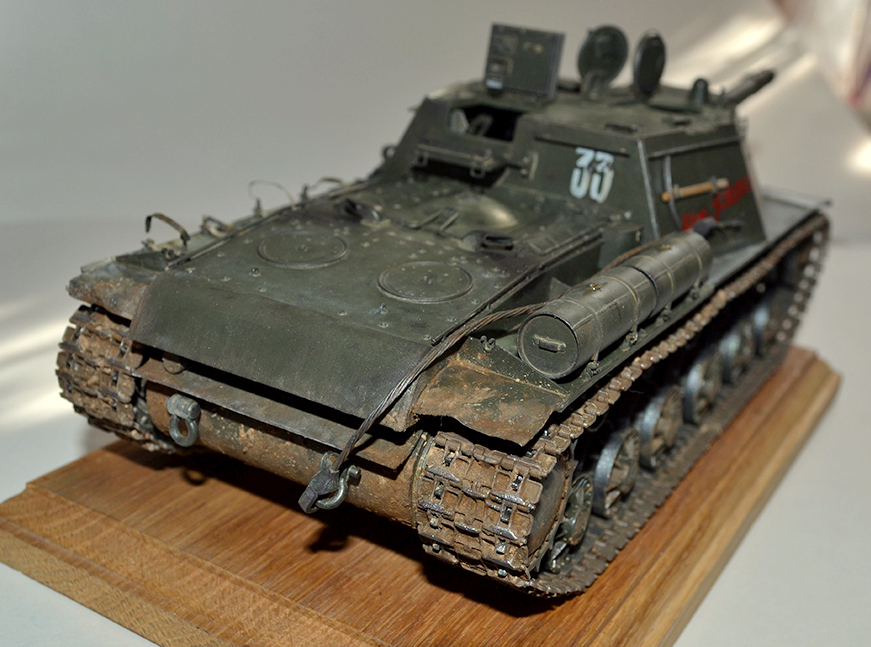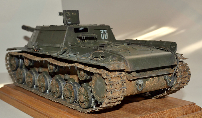 Когда появились танки вермахта на Курской дуге они получили достойный отпор от новых советских САУ. Снаряд 152 мм весом в 50 кг. при попадании в тяжелые Тигры и Пантеры если и не пробивал их, то точно останавливал. За успешную борьбу с германским зверинцем эту САУ прозвали "Зверобой". САУ покорила меня. Я купил книгу «СУ-152 и другие САУ на базе КВ-13 WoT» и решил собрать модель. Между Трумпетером и Бронко выбор встал за последнем, т.к. Бронко заявил проработку пушки и БО, травленые сетки, рабочую подвеску. Как впоследствии выяснилось, практически все это в собранной модели не нужно. За основу взял вот это фото и боковик http://cdn-frm-eu.wargaming.net/wot/ru/uploads/monthly_02_2017/post-67450983-0-92714200-1486373551_thumb.jpghttp://cdn-frm-eu.wargaming.net/wot/ru/uploads/monthly_02_2017/post-67450983-0-88454200-1486373542_thumb.jpg Эпизод военного времени запечатлел интересную для меня картину: у люка командира орудия воин сидит в гимнастерке, а не в комбинезоне и в пилотке. Куча гильз, ящики. В общем, есть где развернуться творчеству. Работу начал с оборудования БО. Оказалось, что Бронко дает проработку только пушки, а не всего бортового отделения. Поэтому, были взяты за основу рисунок и чертеж из вышеуказанной книги и из подручных материалов доделано: боеукладки, радиостанция, топливные баки, инструмент, пол под пушкой, оптика пушки, трубопроводы и др. http://cdn-frm-eu.wargaming.net/wot/ru/uploads/monthly_02_2017/post-67450983-0-62219200-1486373688_thumb.jpghttp://cdn-frm-eu.wargaming.net/wot/ru/uploads/monthly_02_2017/post-67450983-0-81140600-1486373708_thumb.jpg Пушка может двигаться вперед-назад, поворачиваться, опускаться-подниматься. Но все это настолько хлипко, что все механизмы были заклеены. http://cdn-frm-eu.wargaming.net/wot/ru/uploads/monthly_02_2017/post-67450983-0-88754100-1486373957_thumb.jpg В танк посадил экипаж, остальные двое должны были сидеть на броне, как на фото. Так как БТ собираю впервые, то думал, что танкистов оборудование внутри танка будет видно. К сожалению, видно только при свете фонарика. А механика-водителя вообще не видно. На броне товарищей не доделал опять же из-за нехватки опыта. Будут сидеть на другом 152. http://cdn-frm-eu.wargaming.net/wot/ru/uploads/monthly_02_2017/post-67450983-0-62631200-1486374119_thumb.jpg Сборка особых проблем не доставила кроме гуслей. Вот они доставили хлопот. Гусеницы из коробки наборные и состоят из трака и двух пальцев. Все это, конечно, в пластике. Однако при работе модельным клеем пальцы просто разъело внутри трака и при окраске, и везеринге гусли распадались на несколько частей. В результате, на готовой модели склеивал их суперклеем. Что касается рабочей подвески, то из-за слабости траков, а также слишком сильном натяжении ленивцев за счет торсионов, я просто не смог одеть гусли на катки. И решил ленивцы приклеить намертво к ванне. Весь заявленный производителем бонус в виде рабочей подвески испарился. Попытка одеть гусли на фото. Если ленивцы переставить так, чтобы катки были ближе к ванне, то при нагрузке моделью она просто опускается до минимума и смотрится некрасиво. Как будто подбили. Т.е. торсионы уже не работают и натяжения никакого нет. Окраску делал тамиевским акрилом. Цвет всегда готовлю сам, но в этот раз меня подвело освещение рабочего места. Интересный факт, который я заметил давно: мое рабочее место выходит на северную сторону, а солнечных дней, за последние 5 лет зимой – весной не более 10. Краска многопигментная и при разной интенсивности солнечного света она меняет оттенок. А при пасмурной погоде, при работе с двумя лампами накаливания желтого и белого 
