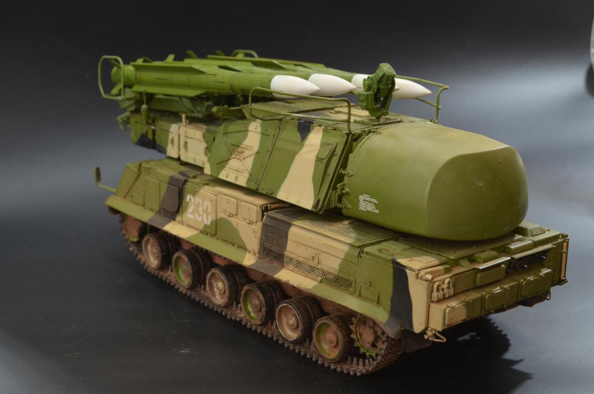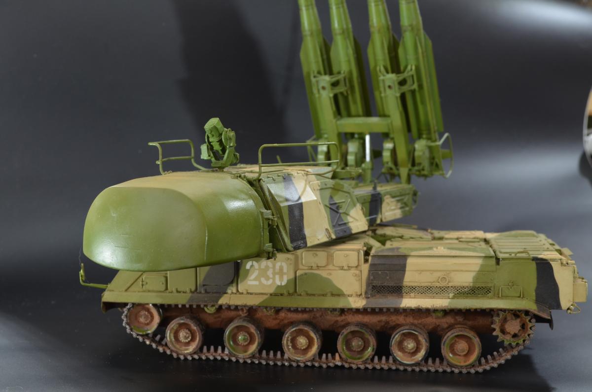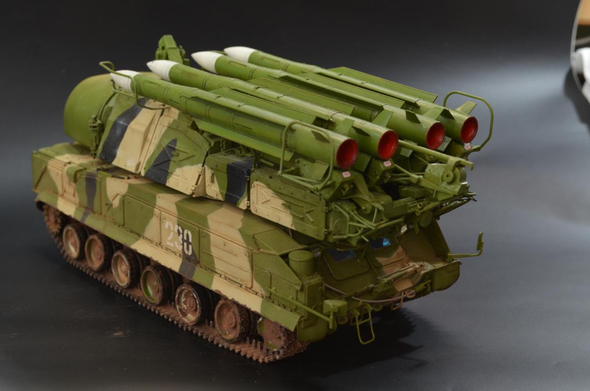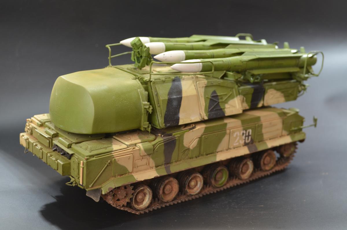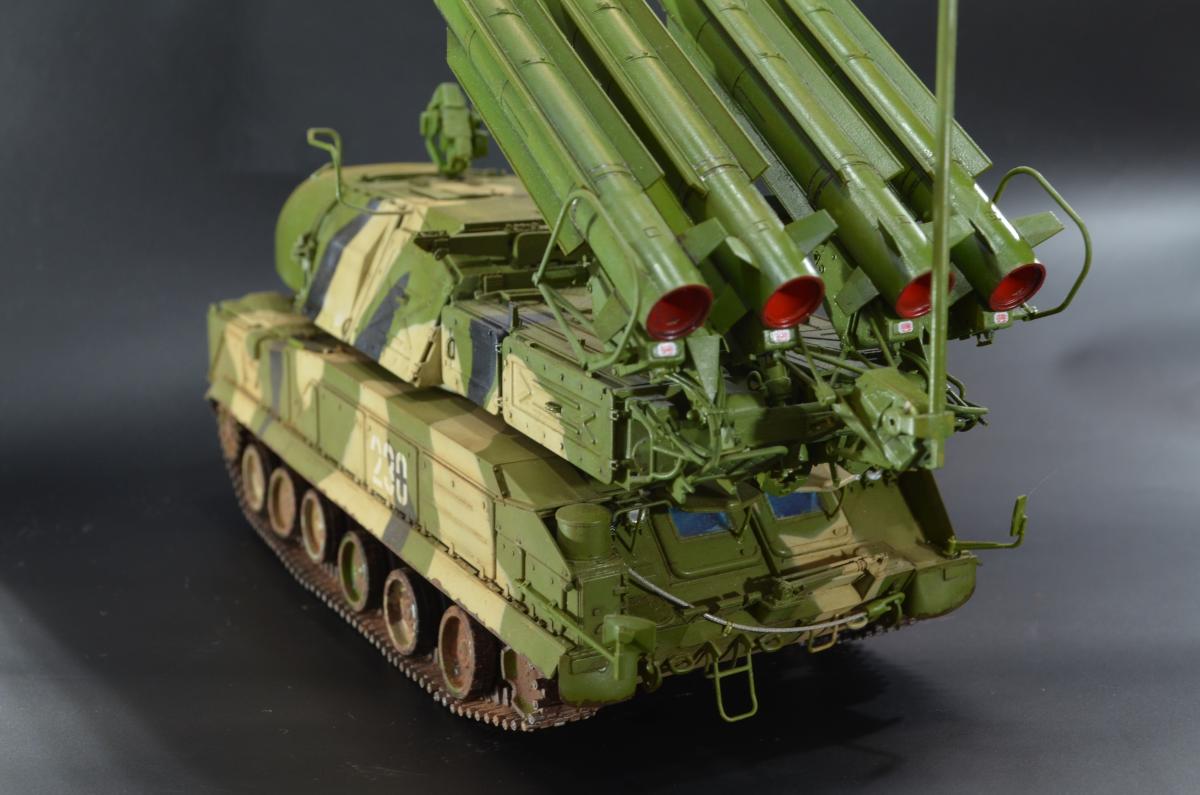 «Бук» (индекс ГРАУ — 9К37, по кодификации МО США и НАТО — SA-11 Gadfly, англ. овод) и его модификации — самоходный зенитный ракетный комплекс (ЗРК), предназначенный для борьбы с маневрирующими аэродинамическими целями на малых и средних высотах (от 30 метров до 14—18 километров) в условиях интенсивного радиопротиводействия. 13 января 1972 года по правительственному постановлению СССР были начаты работы над новым ЗРК 9К37 (или «Бук» на замену комплексу 2К12 (или «Куб». Головным разработчиком комплекса был назначен Научно-исследовательский институт приборостроения имени В. В. Тихомирова под руководством главного конструктора А. А. Растова. Принять на вооружение ВС Союза ССР комплекс планировалось в 1975 году, для ускорения работ принятие на вооружение было решено разделить на два этапа. Первый этап предусматривал введение в состав комплекса 2К12 «Куб-М3» самоходной огневой установки 9А38 с ракетами 9М38 в каждую батарею. В таком виде в 1978 году на вооружение был принят ЗРК 2К12М4 «Куб-М4». Второй этап предполагал полное принятие всего комплекса в составе станции обнаружения 9С18, командного пункта 9С470, самоходной огневой установки 9А310, пуско-заряжающей установки 9А39 и ЗУР 9М38. Совместные испытания комплекса были начаты на полигоне Эмба в ноябре 1977 года и продолжались до марта 1979 года, после чего комплекс в полном составе был принят на вооружение. Окраска краской Пацифик, из дополнений травление Микродизайн, трос