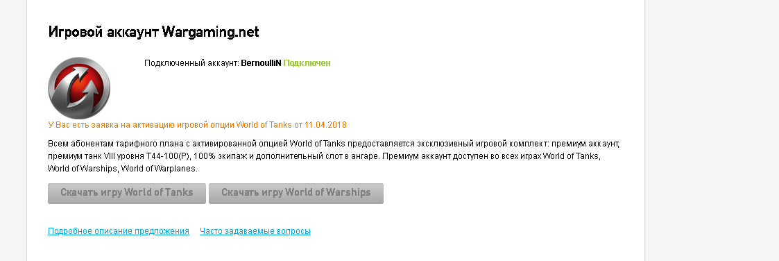 Добрый день! Активировал в Личном кабинете Ростелекома сегодня тариф "Игровой" и привязал аккаунт. Ни перм, ни танк до сих пор не начислены. Как долго эта процедура длится? В личном кабинете Ростелекома вот такая обстановка http://cdn-frm-eu.wargaming.net/wot/ru/uploads/monthly_04_2018/post-6321890-0-25181400-1523438162_thumb.png