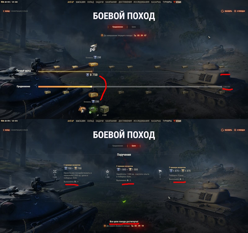 Не играл несколько лет, последний год играю опять. И уже год не могу понять что пишут на этом экране. https://forum-mt-prod.lesta.ru/monthly_07_2025/post-18236-0-87107300-1753042609_thumb.jpg Экран 1Две шкалы, одна тонкая до 30000, вторая толстая до 1000000. Толстая шкала при открытии экрана анимировано заливается светло серым - что это означает непонятно. Геометрически на обеих шкалах мой прогресс (залито золотом) всегда одинаковый. Как это может быть непонятно. На верхней шкале мой прогресс подписан - 8750. Видно что чуть чуть-чуть не хватает до очередной награды. Под нижней шкалой написано "Осталось 250" - похоже это сколько мне осталось до награды на верхней шкале. Но зачем это писать под нижней шкалой, и какой прогресс на нижней шкале? Личный вклад - предположительно мой вклад в клановую казну. Продвижение - куда? Почему оно всегда равно личному вкладу при том что предел его в 33 раза дальше? Экран 2.Нарисованы некие задачи и подписано как идет их выполнение. Выполнено 0/4 0/2 0/2 и ниже надпись - "Все цели похода достигнуты!" Рядом круговые шкалы, с непонятными цифрами внутри. Шкалы пустые, прогресса нет. Как могут быть шкалы пустые, если мой личный вклад уже 8750? Я участвовал в боях, мы побеждали, у меня был урон, я получал опыт. Выполнено 0/4 0/2 0/2 и одновременно ниже надпись - "Все цели похода достигнуты!" - как такое может быть?!!! Что означает 750+750? В общем год я смотрел на этот экран, так ничего и не понял - решил спросить здесь.