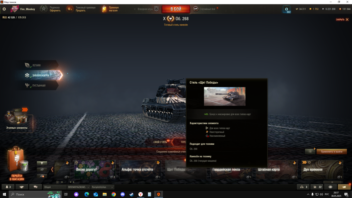 Итак, приступим. Меня (да и не только) не устраивает текущая система поисков, расположения, систематизации и отображения стилей. Я трачу много времени на поиск нужного, снятие/установку, не могу найти и каталогизировать/упорядочить то, что у меня на танках и в наличии. Что надо сделать: 1) Разделить покраску танка на зимнюю, летнюю, пустынную. 2) Отобразить все стили, что есть в игре с соответствующим отображением наличия/отсутствия. 3) Убрать огромные окна стилей в карусели. Заменить небольшими значками с реальным отображением камуфляжа, а не ничего не говорящими красивыми картинками. 4) Присвоить индексы каждому стилю (А20, И48 и т.п.). Если уж кому-то из разработчиков хочется проявить фантазию, пусть будут личные названия и картинки, но во всплывающем меню ("Осенняя меланхолия", "Грезы страждущего" и т.п., конечно, хорошо и довольно поэтично, но я не могу это все запомнить, уж извините). Итак, мы имеем стиль, который можно легко найти. Далее. В настоящий момент мы имеем танки с зимними стилями на летних и пустынных картах. Смотрится вырвиглазно. 5) Предлагаю разделить покраску танка с независимым нанесением для карт трех типов: пустынную, летнюю, зимнюю. Независимым - имеется ввиду то, что на один танк я могу нанести до трех стилей в зависимости от карты, а не один. Далее, 6) Предлагаю стиль, купленный однажды, наносить на неограниченное количество танков. Почему? Сегодня мы имеем ситуацию, при которой стиль можно снять/нанести неограниченное количество раз. Потратив время, я все равно выйду в бой на танке нужной мне расцветки. Но! Зачем не тратить время на поиск и установку, если это время я мог бы быть в бою??? Надеюсь, мысль моих предложений достаточно ясна.