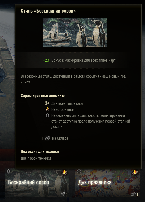Добрый день! Камуфляж: Стиль "Бескрайний север" Ошибка: пингвины обитают только в Антарктиде, но не в Арктике. https://forum-mt-prod.lesta.ru/monthly_12_2025/post-8315341-0-03567800-1765963209_thumb.pnghttps://forum-mt-prod.lesta.ru/monthly_12_2025/post-8315341-0-95919200-1765963229_thumb.png