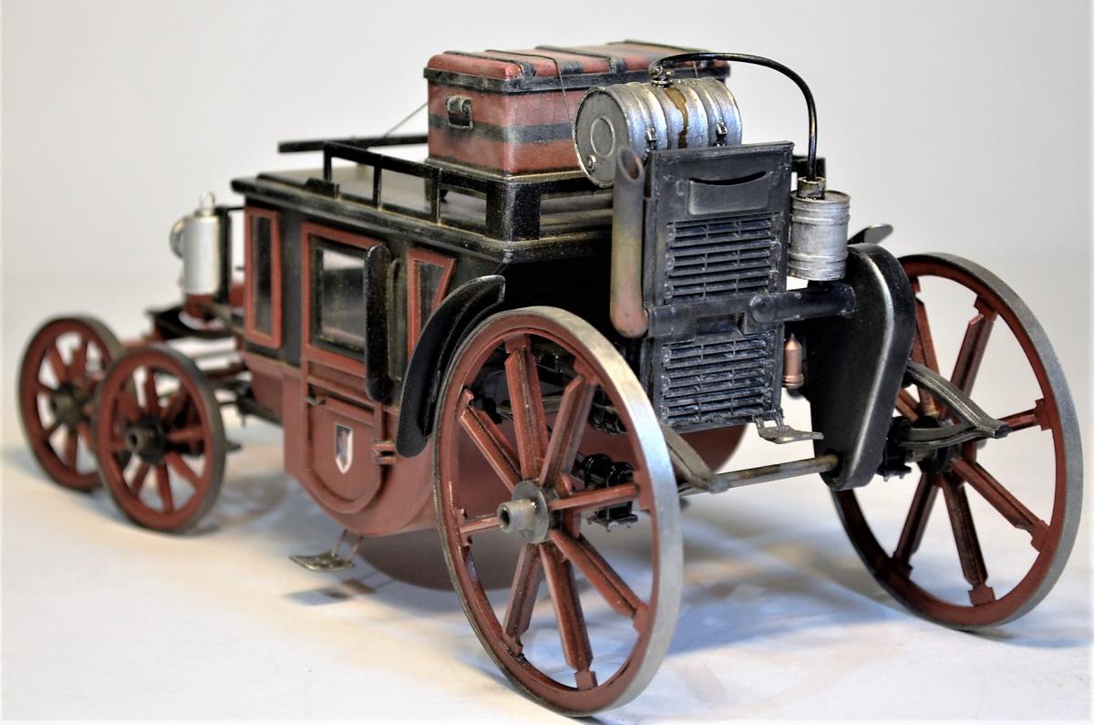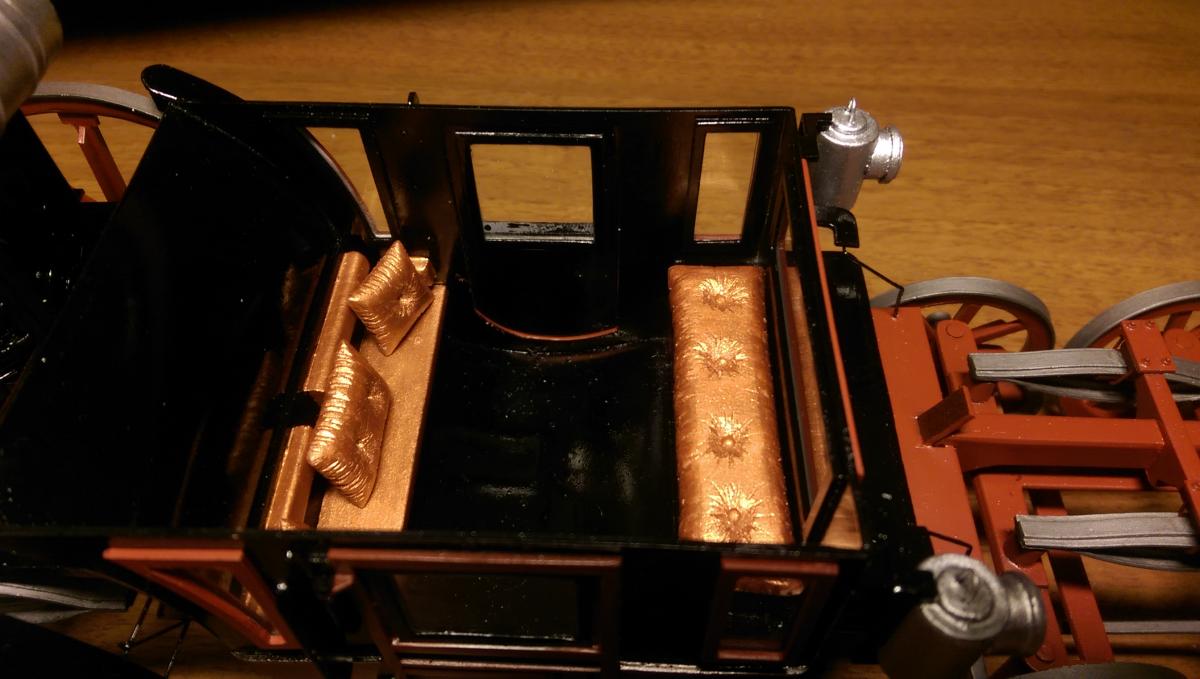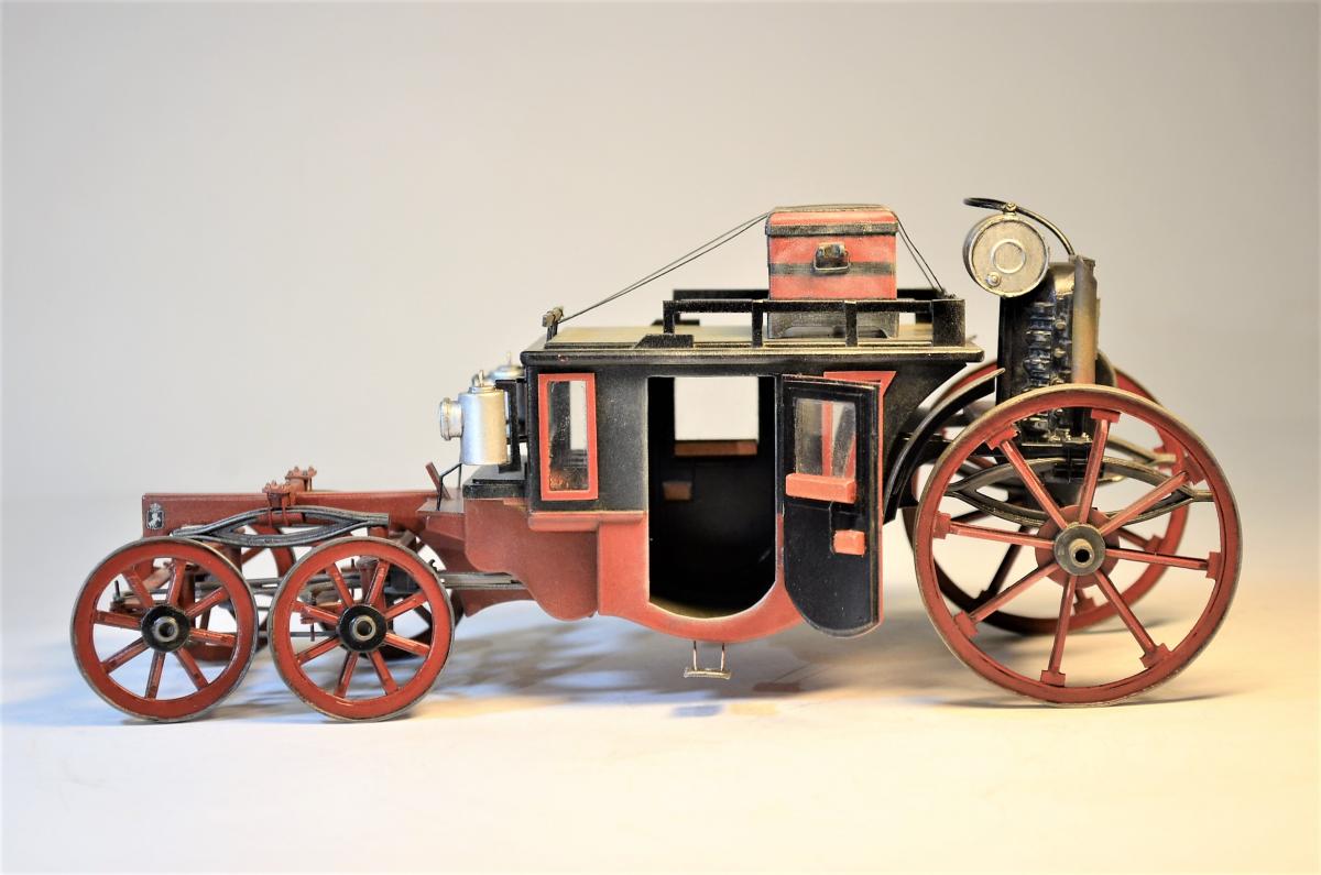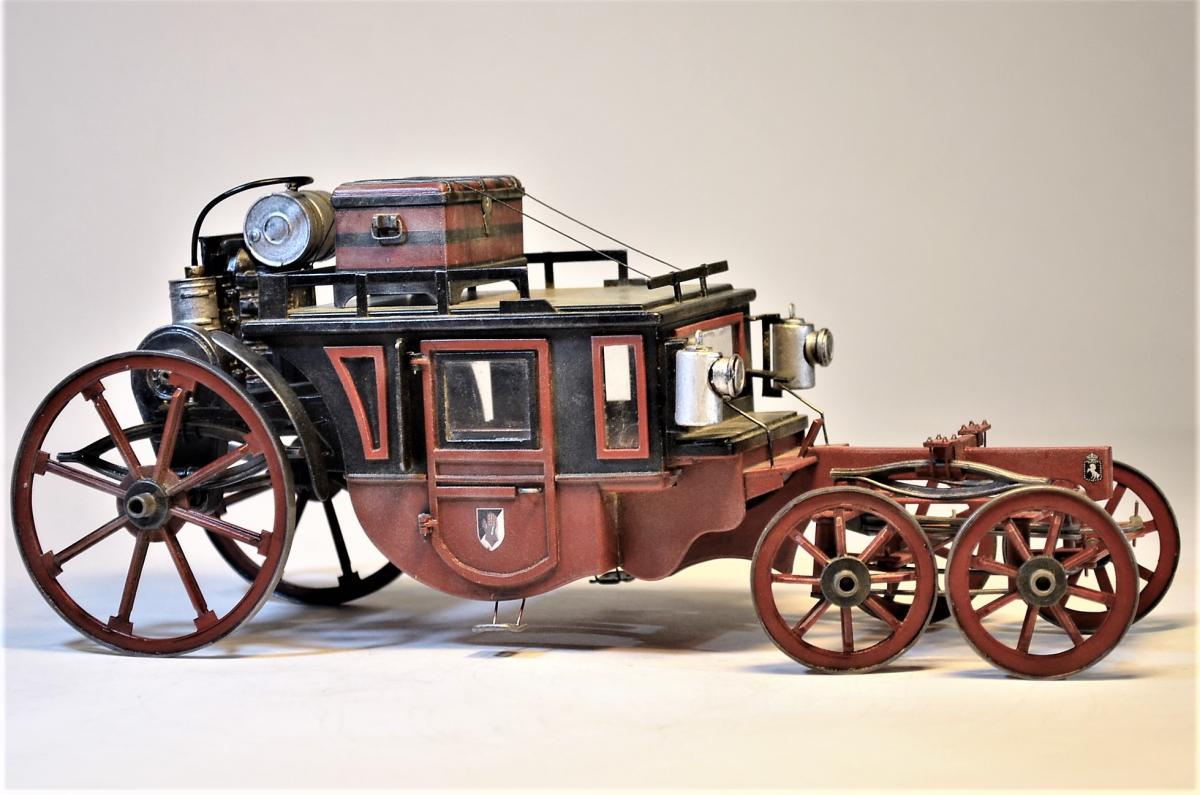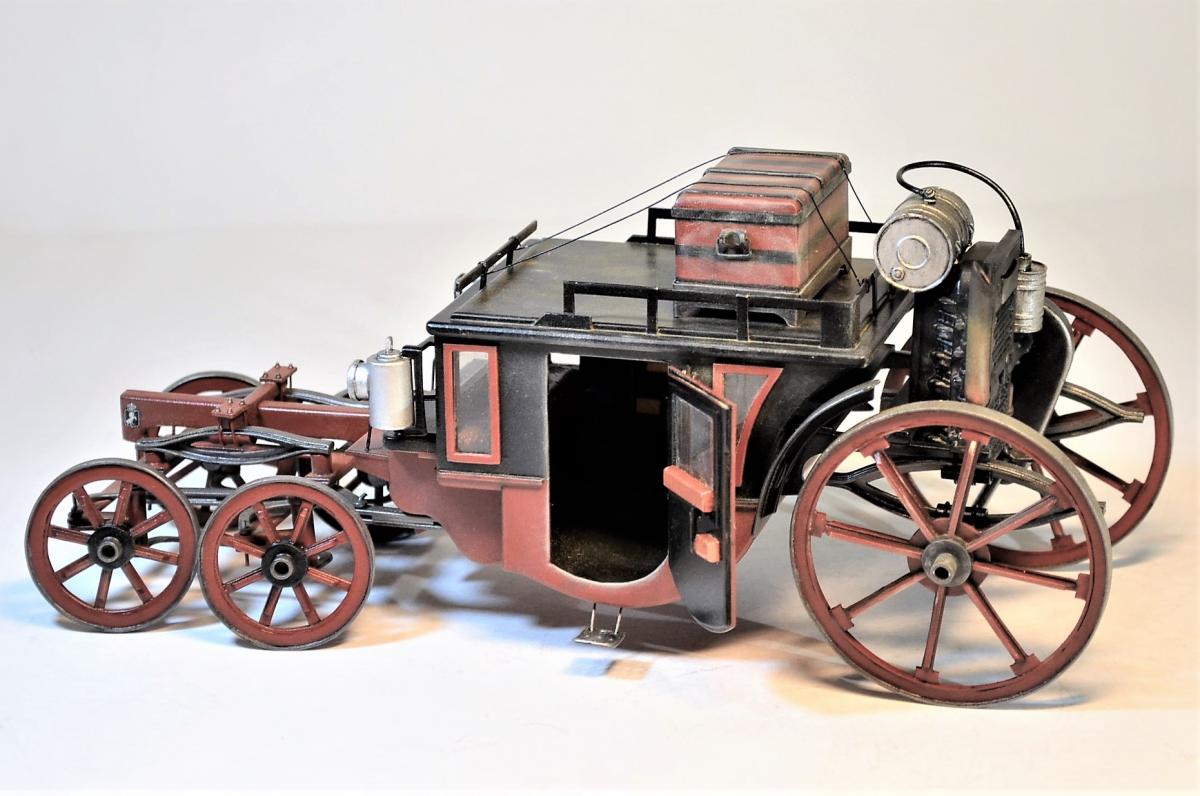 Здравствуйте, ребят! На данный момент, считаю, проект по карете оконченным. Больше мне в него привнести нечего (ну только если шторки когда-нибудь навешу на окна). Кратенько по стройке. Проект является полнейшей импровизацией, от идеи до наброска чертежей прошло где-то 2-3 дня. Основная идея заключалась в создании аппарата, внешне напоминающего карету, но по сути являющегося машиной с двигателем внутреннего сгорания. Также была установка создать у данного аппарата механизм поворота колес по-автомобильному, а не осью, как у повозок, карет и телег. Сборка и доведение до конечного результата заняли примерно1.5 месяца. Самопильной работу можно назвать на 95% (в качестве изготовления двигателя использовались части от сторонней заводской модели + баки), все остальное, в том числе и колеса, вырезались и доводились вручную. Модель собиралась из пластика (основной - Тамия, прозрачный - Аврора). Краски, лаки - Тамия, пигменты - Тамия и ZIP maket , также попробовал новый аэрозольный матовый лак Painter's Touch 2X (matte, clear), который показал себя с лучшей, на мое счастье, стороны (вдвое дешевле Тамии, вдвое быстрее сохнет, ложится однородно, без брызг, практически не пахнет - рекомендую). Более подробно по сборке здесь. За сим, разрешите откланяться. Надеюсь, проект вам понравится. Всем удачи.