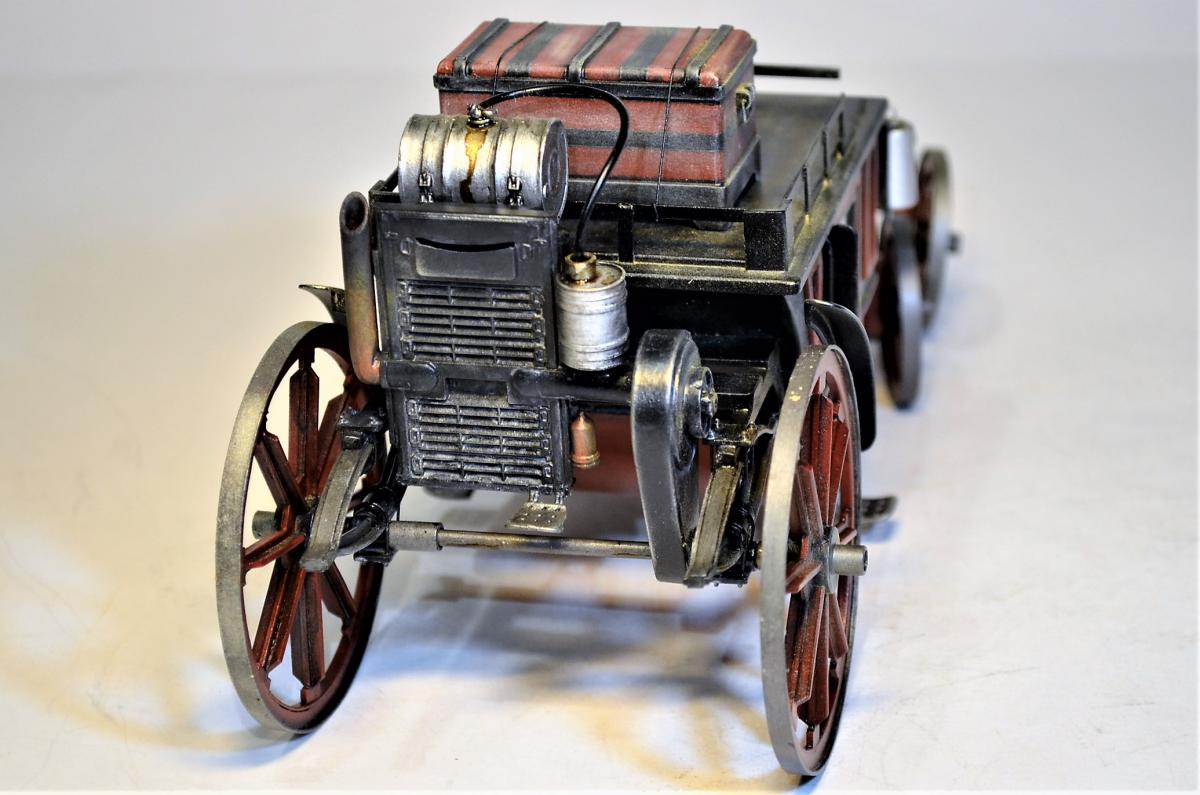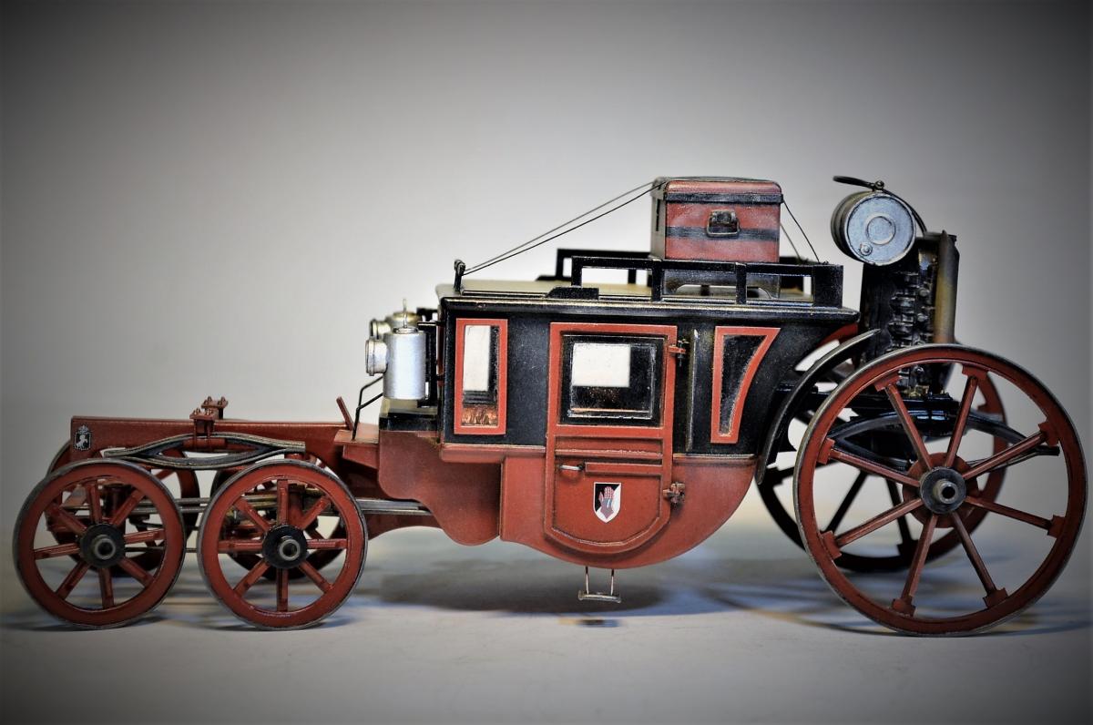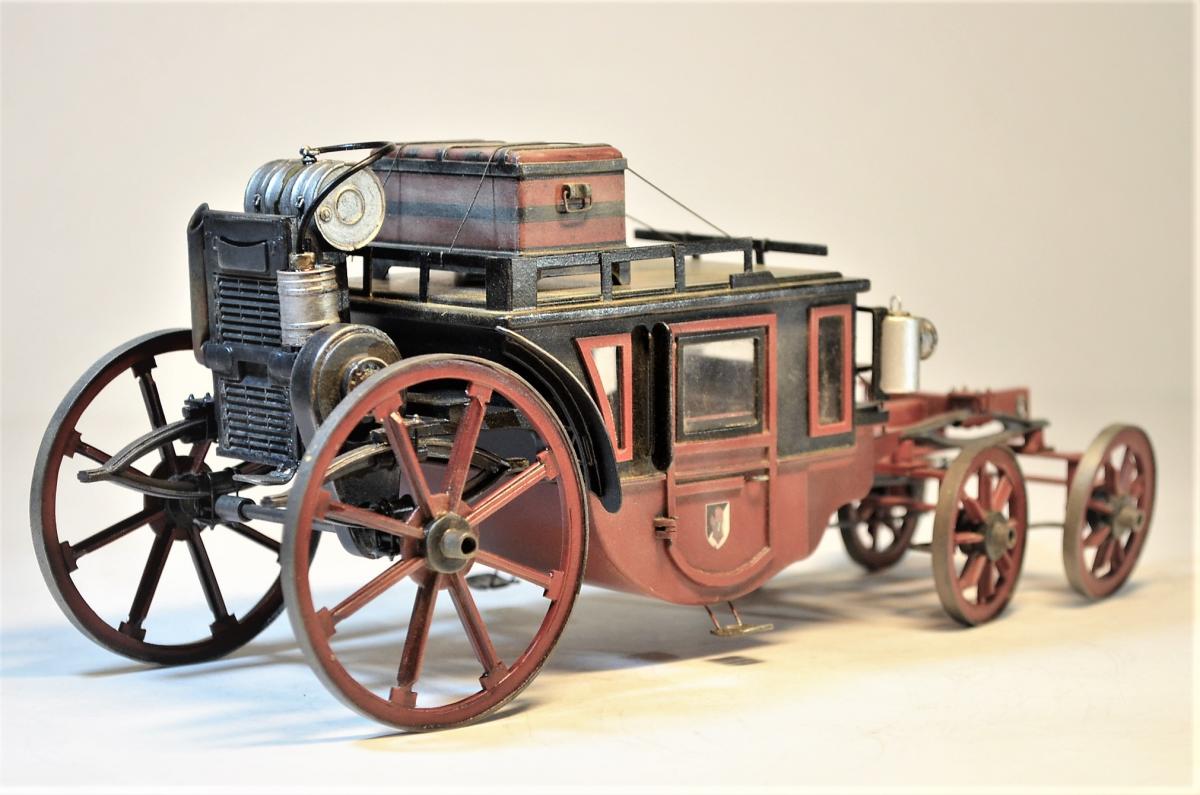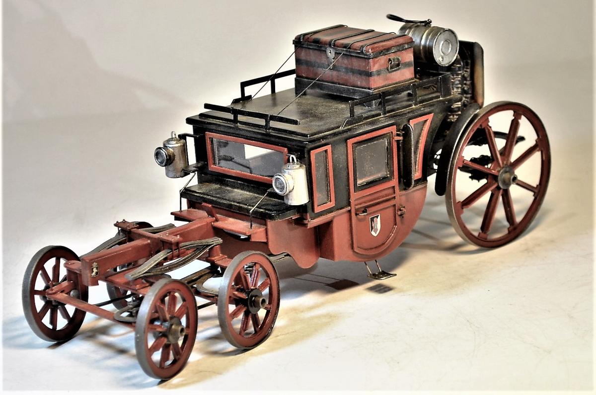 Здравствуйте, ребят! На данный момент, считаю, проект по карете оконченным. Больше мне в него привнести нечего (ну только если шторки когда-нибудь навешу на окна). Кратенько по стройке. Проект является полнейшей импровизацией, от идеи до наброска чертежей прошло где-то 2-3 дня. Основная идея заключалась в создании аппарата, внешне напоминающего карету, но по сути являющегося машиной с двигателем внутреннего сгорания. Также была установка создать у данного аппарата механизм поворота колес по-автомобильному, а не осью, как у повозок, карет и телег. Сборка и доведение до конечного результата заняли примерно1.5 месяца. Самопильной работу можно назвать на 95% (в качестве изготовления двигателя использовались части от сторонней заводской модели + баки), все остальное, в том числе и колеса, вырезались и доводились вручную. Модель собиралась из пластика (основной - Тамия, прозрачный - Аврора). Краски, лаки - Тамия, пигменты - Тамия и ZIP maket , также попробовал новый аэрозольный матовый лак Painter's Touch 2X (matte, clear), который показал себя с лучшей, на мое счастье, стороны (вдвое дешевле Тамии, вдвое быстрее сохнет, ложится однородно, без брызг, практически не пахнет - рекомендую). Более подробно по сборке здесь. За сим, разрешите откланяться. Надеюсь, проект вам понравится. Всем удачи.
