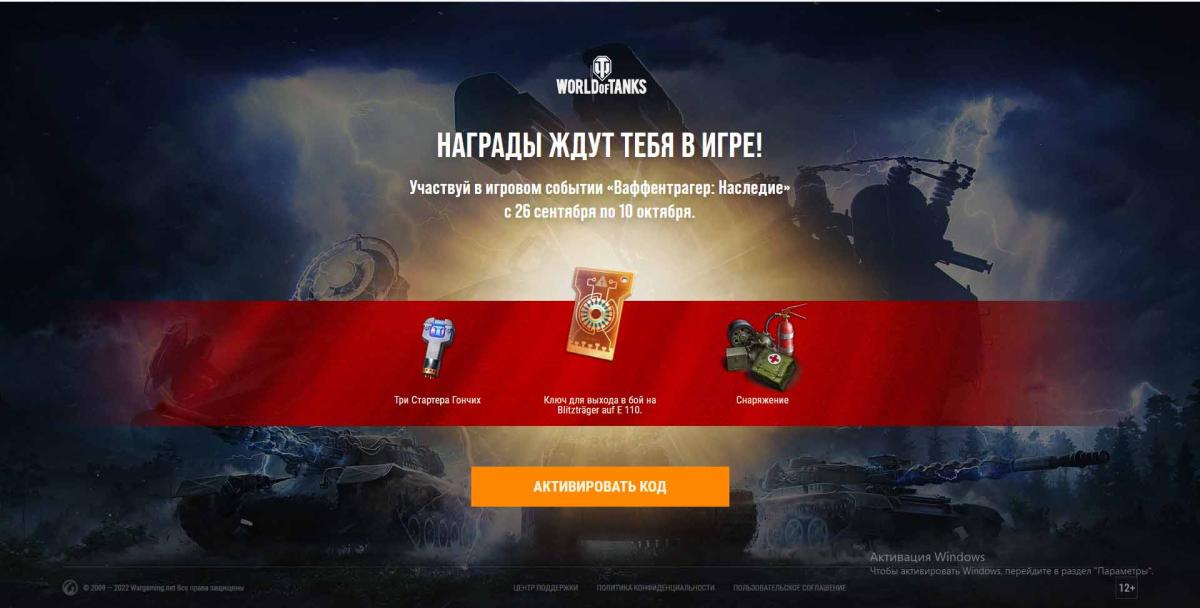 Мой сын долгое время не играл (я не разрешал))) Он упросил меня загрузить игру к выходу Ваффентрагера-2022. Я загрузил игру сегодня, 3 октября. На странице загрузки открылась страница с надписью "Награды ждут тебя в игре". Показаны: 3 стартёра гончих, ключ к выходу в бой на Блицтрагер Е110 и снаряжение. При наведении курсора на ключ и стартёры появляется надпись "* только для игроков, которые не были активны более 30 дней" (сын не играл более 30 дней). Внизу кнопка "активировать код". После её нажатия происходит перенаправление на страницу активации, в поле ввода код уже был записан: WT2022. После нажатия ничего не происходит. В игре никакие из этих предметов не появляются даже после перезагрузки игры. Я подумал, что, возможно, страничка просто предлагает в игре добыть эти предметы. НЕ похоже. Ведь тогда почему именно 3 стартёра гончих? Почему появляется альт-подсказка, что только для не игравших более 30 дней? Почему при нажатии кнопки открывается страничка с кодом, уже внесённым в поле ввода? Поясните, пожалуйста. С уважением, Сергей Битюцкий