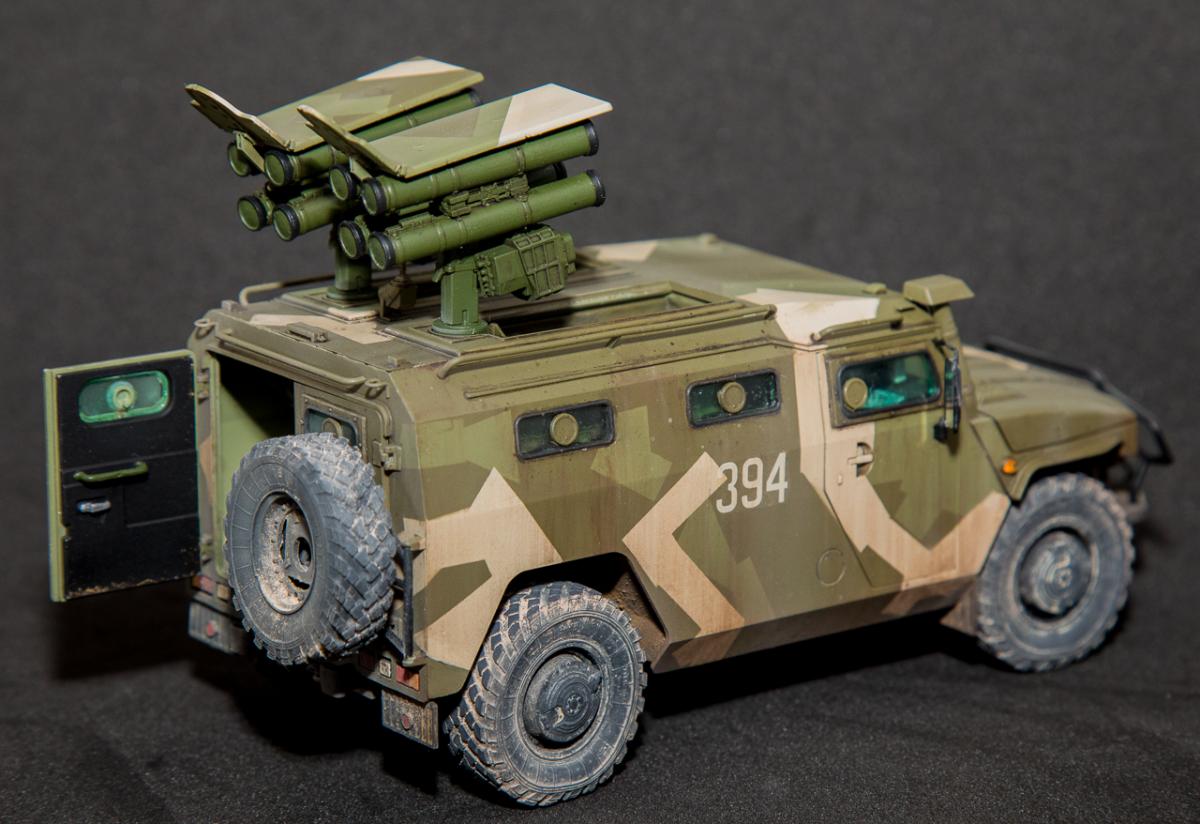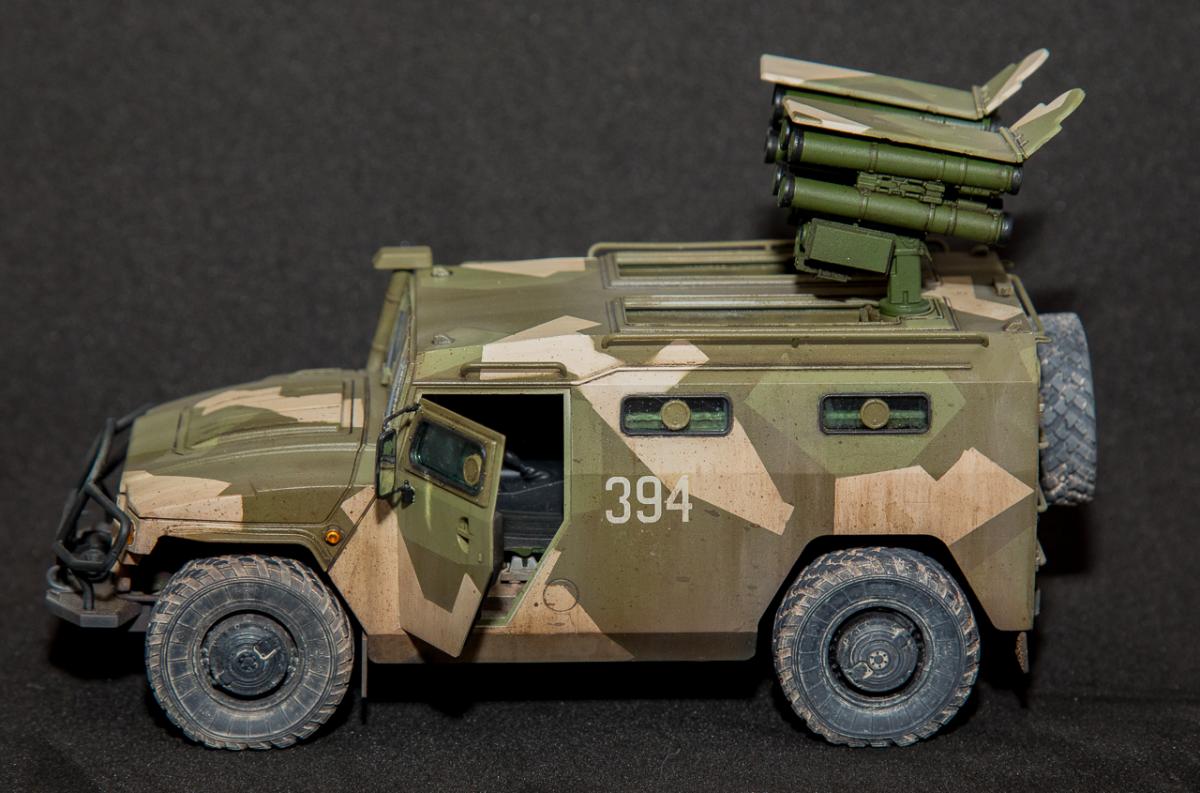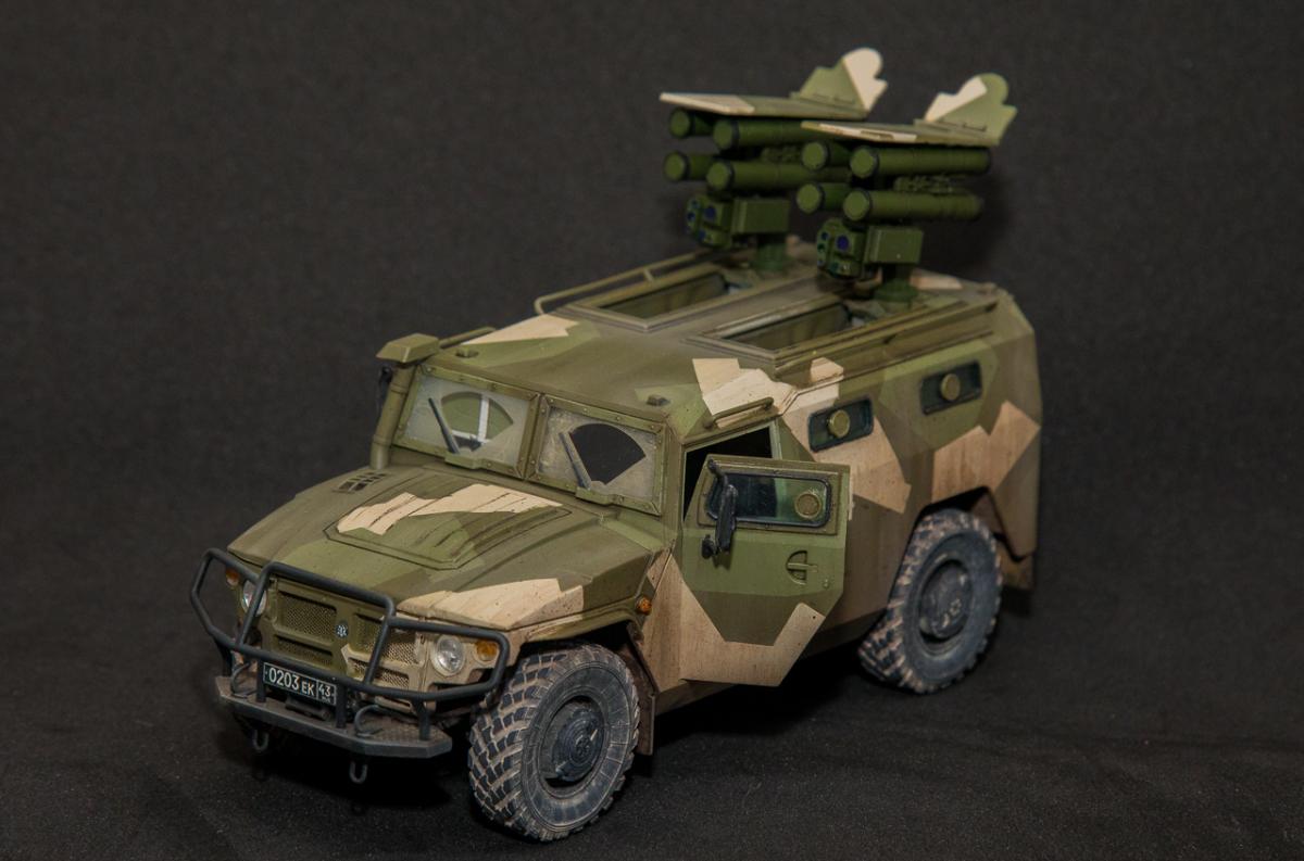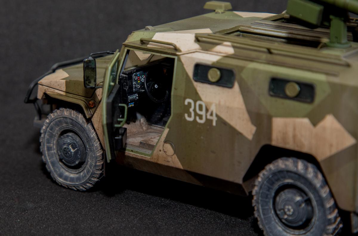 Представляю вниманию свою законченную модель от отечественного производителя "Звезда" - бронеавтомобиль Тигр с ПТРК Корнет. Набор достаточно хорошего качества, с внутренним интерьером (правда его особенно не видно). Сборка достаточно проста, но вот инструкция и расположение деталей на литниках оставляют желать лучшего - при сборке приходилось "скакать" по листу сборки и литникам в поисках нужной детали. Из дополнений использовал 3д декали Квинта студио - интерьер для автомобилей семейства "Тигр". Декали оставили самое положительное впечатление - легко наносятся, отлично оживляют модель в плане визуального восприятия. Так же использовал набор смоляных колес от Арма моделс, что так же сказалось на визуальном восприятии модели. Окрас производился акриловыми красками АMMO Mig - набор для современной российской техники №2. Делать классические ровные пятна, я не захотел и решил немного "похулиганить" - сделал "ломаный" камуфляж. Может и не достоверно, но такое вполне допустимо. Тактические номера - цифры из оставшихся наборов декалей. Везеринг производился пигментами МХП, Zip maket и жидкостями AK Interaktive. Сильно пачкать не стал - небольшое загрязнение обычной строевой машины.Спасибо за внимание. Конструктивная критика приветствуется.