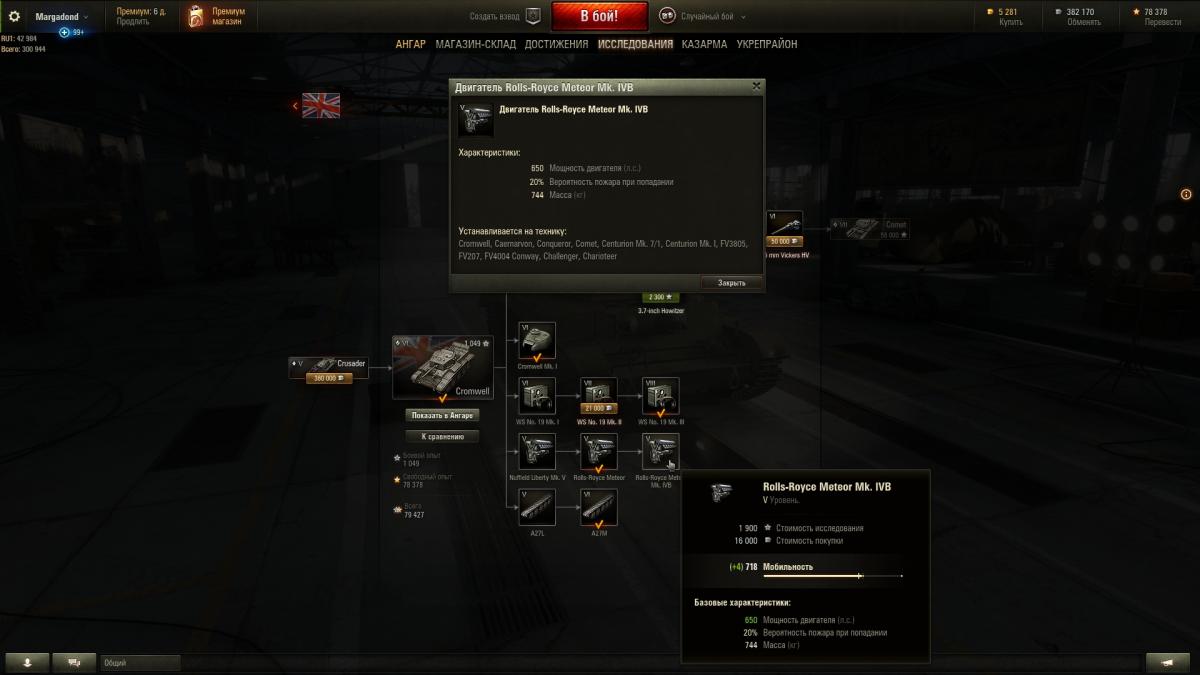 Cromwell B http://i91.fastpic.ru/big/2017/0509/50/39c70f4dca8d8c303167ead25ac0d950.png Cromwell B - премиумный СТ 6 уровня. Среди сообщества игроков, машина обрела популярность благодаря хорошим ходовым качествам и скорострельному орудию. С таким сочетанием у вас в ангаре будет один из наиболее опасных танков 6 уровня. Экипаж владеет основной специальностью и навыком "боевое братство". 1. Историческая справка 2. ТТХ http://i89.fastpic.ru/big/2017/0508/e9/6be95a486acde463b89307369d8c5be9.jpg 3. Вооружение http://i46.fastpic.ru/big/2017/0509/8b/754a294bc92298acc917e45839ee358b.jpg http://i46.fastpic.ru/big/2017/0509/e6/89dfa496858ce12a66d3d71fa948cce6.jpg4. Оборудование и расходники Из актуальных модулей можно выделить: - Досылатель среднего калибра - Просветлённая оптика - Улучшенная вентиляция класс 2 Снаряжение лучше ставить стандартное: малая аптечка, малый ремкомплект и автоматический огнетушитель. На мой взгляд, досылатель и оптика приоритетны, так как Crоmwell B является динамичным ст с высоким дпм. Безусловно, вы можете собрать и свой сет-ап модулей, который подходит вам по стилю игры. 5. Экипажhttp://i33.fastpic.ru/big/2017/0508/e8/683b804b90b9fe1667032d417a0129e8.png Экипаж владеет основной специальностью и несбрасываемым навыком «Боевое братство», поэтому для изучения второго навыка понадобится то количество опыта, которое соответствует первой специальности. Это несомненный плюс. http://i47.fastpic.ru/big/2017/0509/61/3b3a6df2cff71cee20c44ba23c3d4361.jpg 6. Тактика игры Кромвель - настоящий универсал. Наши сильные стороны: это скорость, дпм и неплохой обзор. Мы можем подсвечивать союзникам, помогать продавливать направления, играть в стиле: "сам свечу - сам уничтожаю". Танк способен совершать стремительные и дерзкие броски в тыл противника, возвращаться для сбития захвата и в этом характеристики танка позволяют резко менять вектор атак на любом участке боевых действий. Высокая крейсерская скорость позволит легко занимать ключевые позиции, засвечивать противника, перехватывать вражеские лт, простреливать определённые зоны разъезда в начале боя, в этом и заключается его универсальность. Но не забывайте про слабое бронирование, поэтому играть придётся соблюдая осторожность. Зато универсальность танка позволяет выполнять не только роль поддержки, но зачастую действовать агрессивно, быстро переходить в наступление, мотивировать союзников к атаке. Благодаря своей динамике, мы легко можем атаковать и "каруселить" одиночные цели, а также арту оставшуюся без прикрытия. Проблем с пробитием бронебойными снарядами 6-7 уровней практически не возникает, поэтому чувствуем себя довольно вольготно. Для 8 уровней возим голду, так как пробития бронебойными может не хватить. Необходимо помнить, что точность орудия оставляет желать лучшего, по причине долгого сведения и слегка навесной траектории полёта снаряда. Подкалиберные снаряды облегчают жизнь, но стрелять по бронированным целям с большой дистанции - не вариант. Однако наша пушка имеет очень высокие показатели скорострельности и ДПМ, второе значение по скорострельности после Шерманов, среди одноклассников, правда за этот щедрый подарок нас лишили стабилизации и при движении мы стреляем иногда не туда куда нужно. Во многих ситуациях, используя просветлённую оптику, мы можем неплохо подсвечивать используя тактику активного света. Урон по нашему засвету (ассист) - наполовину наш урон. В случаях когда нанести урон противнику мы не в состоянии, можно держать противника "на гусле" до его полног