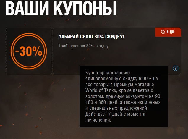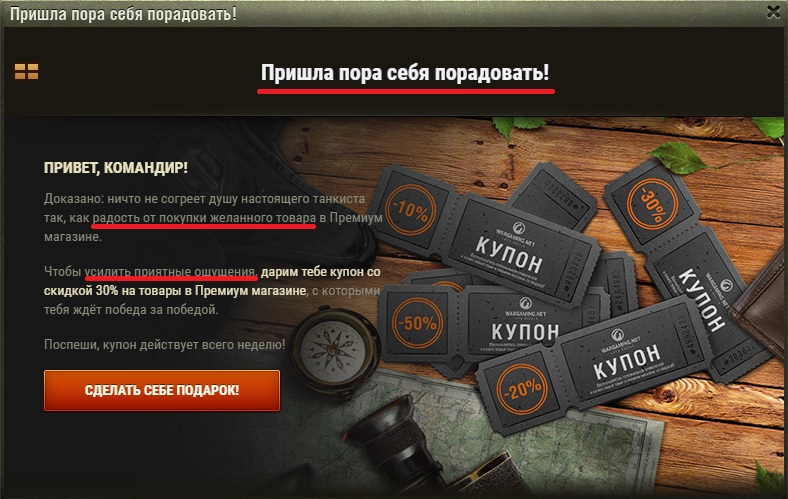 После боя пришло окошко с купоном. Впервые. http://cdn-frm-eu.wargaming.net/wot/ru/uploads/monthly_05_2018/post-4574684-0-02436700-1526901936_thumb.jpg "Пришла пора себя порадовать, ведь ничто не согреет душу настоящего танкиста так, как радость от покупки желанного товара!" О как... Ну думаю... сейчас я "усилю свои приятные ощущения с помощью купона, с которыми меня ждёт победа за победой". Что мы имеем: http://cdn-frm-eu.wargaming.net/wot/ru/uploads/monthly_05_2018/post-4574684-0-86454200-1526901944_thumb.jpg Не применимо на: Золото, Премиум аккаунт на 90, 180 и 360 дней, а так же акционных и специальных предложений. Т.е. остается техника получается. Ну ладно, думаю гляну танки, может type 64 возьму. На деле пролистав не только технику, но и странички с золотом и премиумом этот купон ни на что не влияет как при авторизации, так и без. Вопрос уважаемым модераторам/разработчикам, правильно ли я понимаю что этот купон является фейковым? Ведь действующие скидки на товары так же актуальны без авторизации на сайте. Или каким то образом его нужно активировать? Добавив товар в корзину купон применить нельзя, нет там такой кнопки. ______________________________________________________ Upd! Проверено, не фейк. Не используйте анонимные браузеры