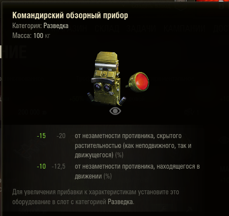 Здравствуйте! Я не понимаю, как работает командирский обзорный прибор, объясните, пожалуйста. Проверял в движении и в кустах, в движении результат получился достоверный, а вот в кустах не получается. Маскировка STB-1: 27,3% Обзор Об.140: 429м Проверяю с какого расстояния засвечу STB-1 с учётом командирского прибора через 1 плотный куст (50%) По формуле результат: 429-50=379 (обзор 140) 27,3+50=77,3 (маскировка STB-1 + 1 куст) 77,3\100=0,773*15=11,595 (эффект от Командирского прибора) 77,3-11,595=65,705 (итоговая маскировка STB-1 с учётом куста и ком.прибора) 379\100=3,79*65,705=249,02195 (отнимет маскировка STB-1 у Об.140) 379-249,02195=129,97805+50=179,97805 (теоретическое расстояние засвета STB-1) Фактический же результат при проверке в тренировочной комнате, составил 162 метра. ВОПРОС: где я ошибся или чего я ещё не знаю, не учёл?