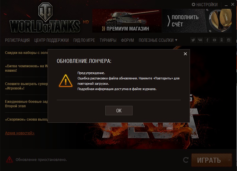 При запуске игры лаунчер скачивает обновление ~4,2 Мб, но выскакивает ошибка http://cdn-frm-eu.wargaming.net/wot/ru/uploads/monthly_11_2016/post-11944296-0-53798200-1479832976_thumb.jpg http://cdn-frm-eu.wargaming.net/4.5/style_extra/mime_types/txt.gif DxDiag.txt 77,06К http://cdn-frm-eu.wargaming.net/4.5/style_extra/mime_types/zip.gif WoTLauncher.zip 2,82К DxDiag.txt WoTLauncher.zip
