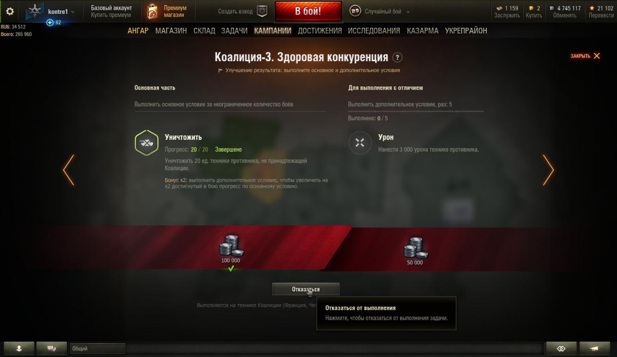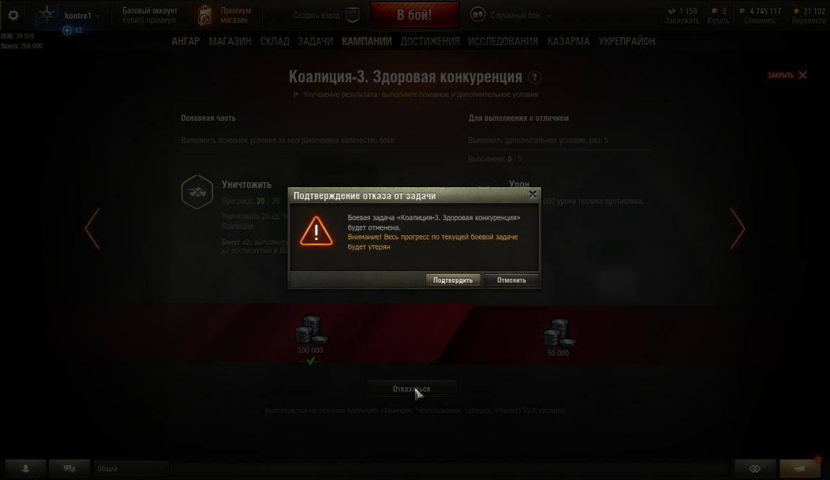 Кто-нибудь,будьте любезны,подскажите, почему я, выполнив в лбз-2 основную задачу, но не выполнив дополнительную, не перехожу автоматически к выполнению следующей задачи? Только со сбросом прогресса по выполненной задаче. Это нагиб? Первая операция «Excalibur» (для техники от VI уровня) потребует усердия. Эти задачи накопительные, их можно выполнить за неограниченное количество боёв, демонстрируя волю к победе и давая достойный отпор противнику. У этих задач есть ещё одна особенность — дополнительное условие. Если вы его не выполните, это не помешает перейти к следующей задаче. Однако, выполнив его в одном бою, вы удвоите достигнутый в нём прогресс по основному условию — и приблизитесь к завершению задачи. Дураком себя чувствуюhttp://cdn-frm-eu.wargaming.net/wot/ru/uploads/monthly_09_2018/post-5903534-0-08490800-1536851417_thumb.jpghttp://cdn-frm-eu.wargaming.net/wot/ru/uploads/monthly_09_2018/post-5903534-0-46092800-1536851436_thumb.jpghttp://cdn-frm-eu.wargaming.net/wot/ru/uploads/monthly_09_2018/post-5903534-0-05615300-1536851447_thumb.jpghttp://cdn-frm-eu.wargaming.net/wot/ru/uploads/monthly_09_2018/post-5903534-0-03787300-1536851468_thumb.jpg