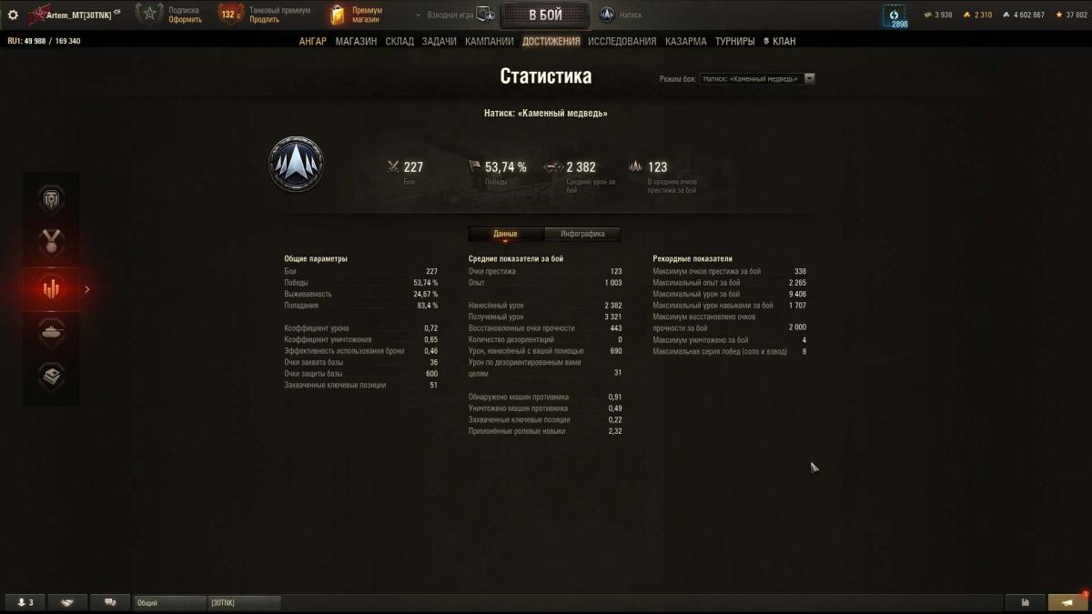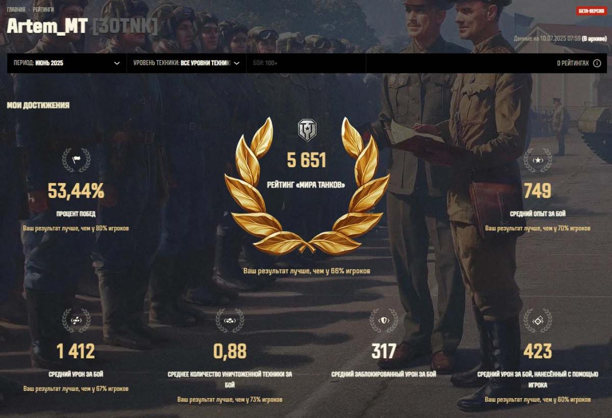 [30TNK] Танкисты 30+ Здравствуйте уважаемые игроки! Приглашаю в наш небольшой клан. Цель: Создать дружный и адекватный коллектив. Требований к рекрутам особых нет. Возраст желателен от 30 лет. Необходимое время онлайна: - когда вам удобно, чаще несколько игроков собирается около 19:00 Мск. Статистика - не важна. Уровень техники - не важен. Голосовая связь внутриигровая или в Steam. Также доступна группа в телеграмм. Можете играть соло или легионером находясь в клане. После изменений 25 марта 2024 получать бонусы в случайных боях от боевого похода возможно только на технике Х уровне. На техике ниже уровней можно получить бонусы только выполняя боевые задачи в Вылазках и Наступлениях в Укрепрайонах. Если захотите покатать во взводе, то будем только рады. Напишите в внутригровой чат в чат Steam. Укрепрайон IX. Скрин. Резервы включаются по договоренности, когда бОльшая часть игроков онлайн и собирается в бои. Готов к конструктивным предложениям по развитию клана. Хотелось бы катать Спринты, но нет желающих... Вступить в клан. - Автоматическое одобрение заявок активно. Если вы еще не в клане и ищите клан, то добро пожаловать! Спасибо за внимание. Также ищу взводных для Натиска со связью. Ранг постоянное Золото. Постоянно катаю сезоны Натиска. Присоединяйтесь! Статистики рандомно за сезон в спойлере. Скрин. Или приглашаю покатать во взводе без связи. Моя статистика за Июнь 2025 в спойлере. Скрин. Присоединяйтесь.