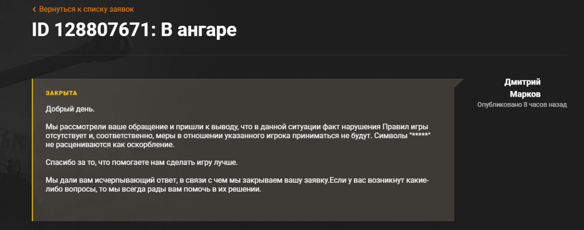 Здрасьте, Сегодня модератор с ником Artrium забанил меня, (сразу оговорюсь я не прошу меня разбанить!) Меня немножко поразила ситуация, при которой меня забанили, при которой Адекватность вышеуказанного модера вызывает большое сомнение, а именно: один из участников спросил -Надоели сливы, как можно поднять стату и улучшить свою игру? В ответ модератор не указывая ни ссылок ни иных подсказок посоветовал записаться на "Танковые курсы" Меня взбесило подобное неуважительное отношение, и я задал ему вопрос за который получил Бан, цитирую: -Artrium ты Адекватный человек или ***? Какие к черту "Танковые курсы? Аналогичные ситуации наблюдаю часто, создаётся впечатление что Модераторов отбирают по критериям -Чем безграмотней и не адекватней, к тому же с чересчур завышенной самооценкой тем лучше?! Если с его стороны про курсы была Шутка, то почему тогда за сарказм в свой адрес Банят? Неравноценно не кажется ли вам?